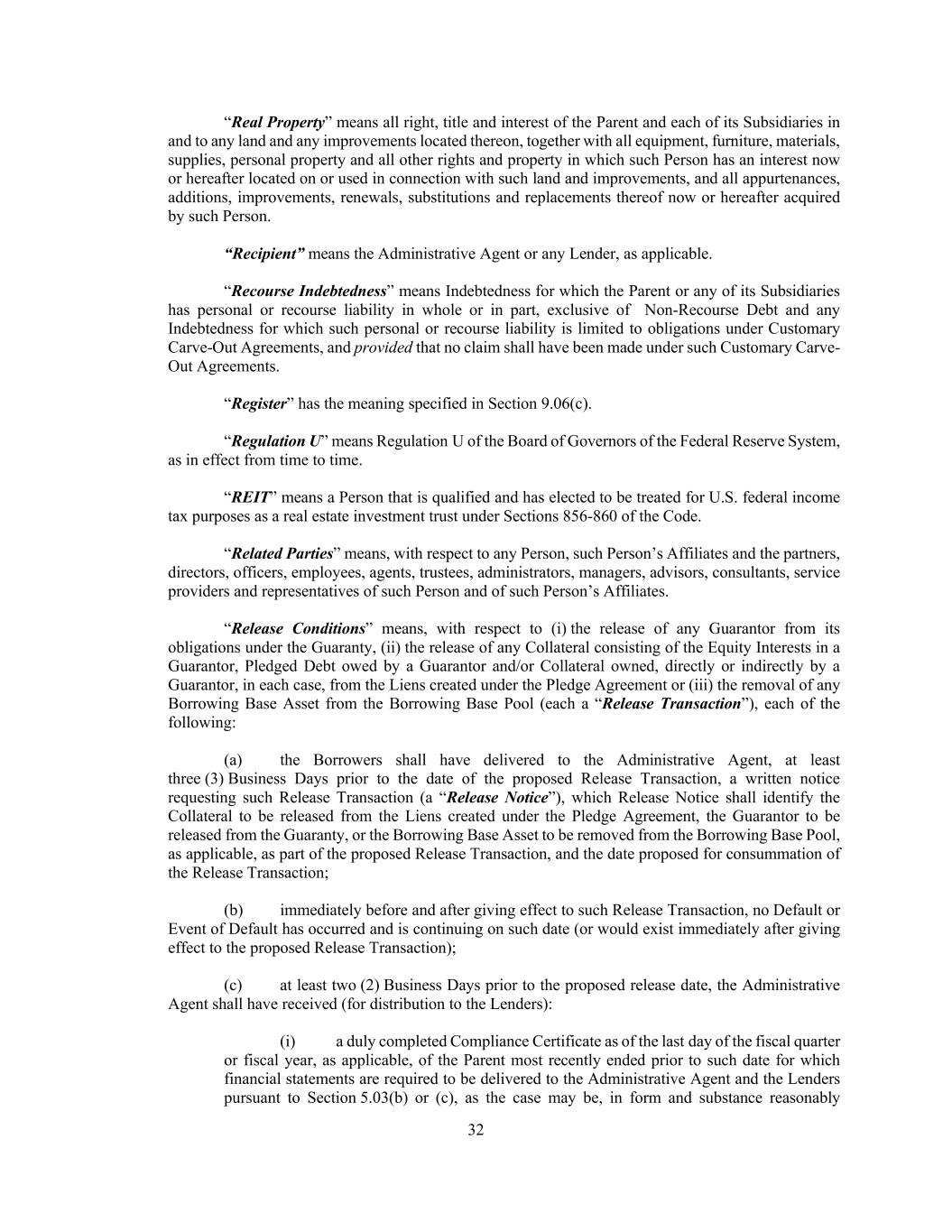 32 “Real Property” means all right, title and interest of the Parent and each of its Subsidiaries in and to any land and any improvements located thereon, together with all equipment, furniture, materials, supplies, personal property and all other rights and property in which such Person has an interest now or hereafter located on or used in connection with such land and improvements, and all appurtenances, additions, improvements, renewals, substitutions and replacements thereof now or hereafter acquired by such Person. “Recipient” means the Administrative Agent or any Lender, as applicable. “Recourse Indebtedness” means Indebtedness for which the Parent or any of its Subsidiaries has personal or recourse liability in whole or in part, exclusive of Non-Recourse Debt and any Indebtedness for which such personal or recourse liability is limited to obligations under Customary Carve-Out Agreements, and provided that no claim shall have been made under such Customary Carve- Out Agreements. “Register” has the meaning specified in Section 9.06(c). “Regulation U” means Regulation U of the Board of Governors of the Federal Reserve System, as in effect from time to time. “REIT” means a Person that is qualified and has elected to be treated for U.S. federal income tax purposes as a real estate investment trust under Sections 856-860 of the Code. “Related Parties” means, with respect to any Person, such Person’s Affiliates and the partners, directors, officers, employees, agents, trustees, administrators, managers, advisors, consultants, service providers and representatives of such Person and of such Person’s Affiliates. “Release Conditions” means, with respect to (i) the release of any Guarantor from its obligations under the Guaranty, (ii) the release of any Collateral consisting of the Equity Interests in a Guarantor, Pledged Debt owed by a Guarantor and/or Collateral owned, directly or indirectly by a Guarantor, in each case, from the Liens created under the Pledge Agreement or (iii) the removal of any Borrowing Base Asset from the Borrowing Base Pool (each a “Release Transaction”), each of the following: (a) the Borrowers shall have delivered to the Administrative Agent, at least three (3) Business Days prior to the date of the proposed Release Transaction, a written notice requesting such Release Transaction (a “Release Notice”), which Release Notice shall identify the Collateral to be released from the Liens created under the Pledge Agreement, the Guarantor to be released from the Guaranty, or the Borrowing Base Asset to be removed from the Borrowing Base Pool, as applicable, as part of the proposed Release Transaction, and the date proposed for consummation of the Release Transaction; (b) immediately before and after giving effect to such Release Transaction, no Default or Event of Default has occurred and is continuing on such date (or would exist immediately after giving effect to the proposed Release Transaction); (c) at least two (2) Business Days prior to the proposed release date, the Administrative Agent shall have received (for distribution to the Lenders): (i) a duly completed Compliance Certificate as of the last day of the fiscal quarter or fiscal year, as applicable, of the Parent most recently ended prior to such date for which financial statements are required to be delivered to the Administrative Agent and the Lenders pursuant to Section 5.03(b) or (c), as the case may be, in form and substance reasonably