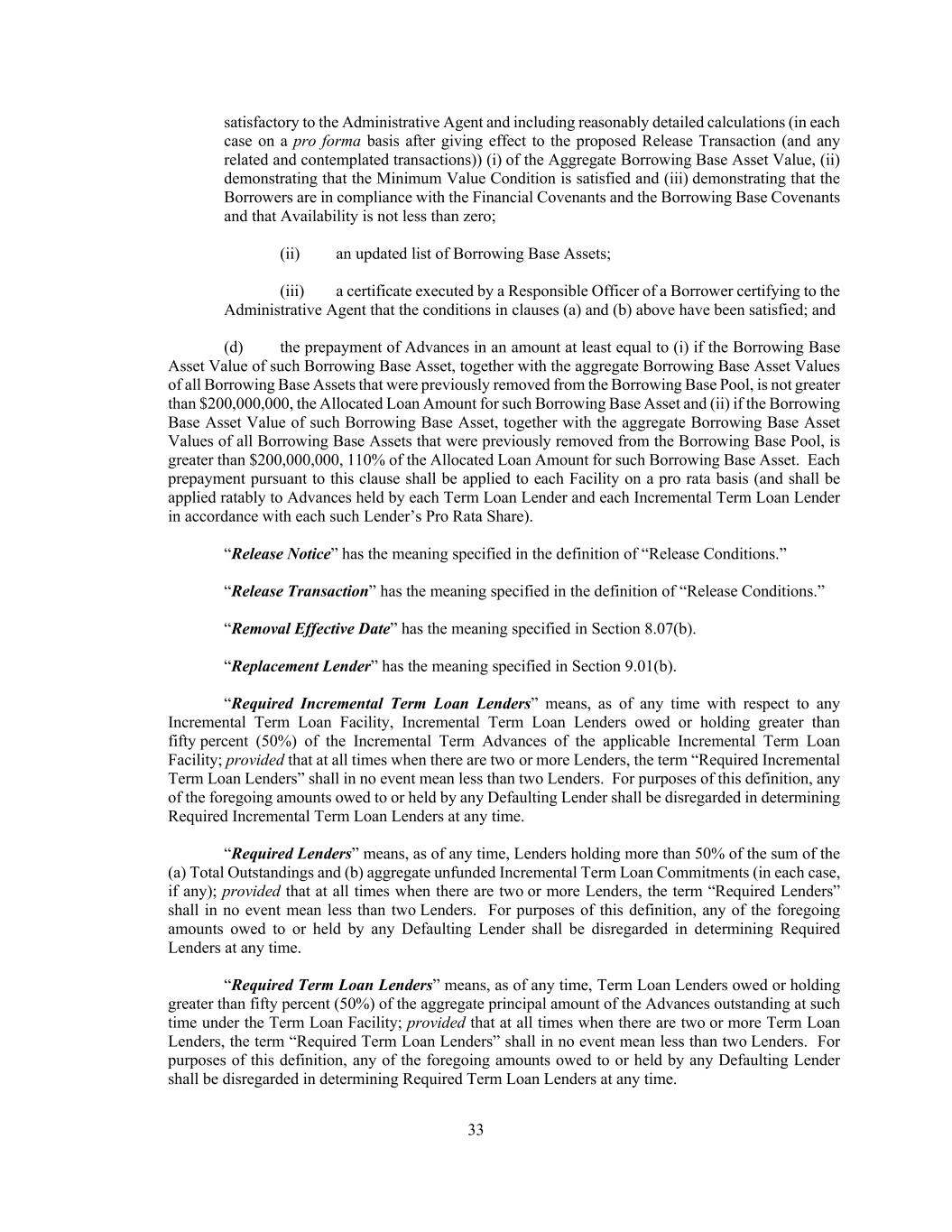 33 satisfactory to the Administrative Agent and including reasonably detailed calculations (in each case on a pro forma basis after giving effect to the proposed Release Transaction (and any related and contemplated transactions)) (i) of the Aggregate Borrowing Base Asset Value, (ii) demonstrating that the Minimum Value Condition is satisfied and (iii) demonstrating that the Borrowers are in compliance with the Financial Covenants and the Borrowing Base Covenants and that Availability is not less than zero; (ii) an updated list of Borrowing Base Assets; (iii) a certificate executed by a Responsible Officer of a Borrower certifying to the Administrative Agent that the conditions in clauses (a) and (b) above have been satisfied; and (d) the prepayment of Advances in an amount at least equal to (i) if the Borrowing Base Asset Value of such Borrowing Base Asset, together with the aggregate Borrowing Base Asset Values of all Borrowing Base Assets that were previously removed from the Borrowing Base Pool, is not greater than $200,000,000, the Allocated Loan Amount for such Borrowing Base Asset and (ii) if the Borrowing Base Asset Value of such Borrowing Base Asset, together with the aggregate Borrowing Base Asset Values of all Borrowing Base Assets that were previously removed from the Borrowing Base Pool, is greater than $200,000,000, 110% of the Allocated Loan Amount for such Borrowing Base Asset. Each prepayment pursuant to this clause shall be applied to each Facility on a pro rata basis (and shall be applied ratably to Advances held by each Term Loan Lender and each Incremental Term Loan Lender in accordance with each such Lender’s Pro Rata Share). “Release Notice” has the meaning specified in the definition of “Release Conditions.” “Release Transaction” has the meaning specified in the definition of “Release Conditions.” “Removal Effective Date” has the meaning specified in Section 8.07(b). “Replacement Lender” has the meaning specified in Section 9.01(b). “Required Incremental Term Loan Lenders” means, as of any time with respect to any Incremental Term Loan Facility, Incremental Term Loan Lenders owed or holding greater than fifty percent (50%) of the Incremental Term Advances of the applicable Incremental Term Loan Facility; provided that at all times when there are two or more Lenders, the term “Required Incremental Term Loan Lenders” shall in no event mean less than two Lenders. For purposes of this definition, any of the foregoing amounts owed to or held by any Defaulting Lender shall be disregarded in determining Required Incremental Term Loan Lenders at any time. “Required Lenders” means, as of any time, Lenders holding more than 50% of the sum of the (a) Total Outstandings and (b) aggregate unfunded Incremental Term Loan Commitments (in each case, if any); provided that at all times when there are two or more Lenders, the term “Required Lenders” shall in no event mean less than two Lenders. For purposes of this definition, any of the foregoing amounts owed to or held by any Defaulting Lender shall be disregarded in determining Required Lenders at any time. “Required Term Loan Lenders” means, as of any time, Term Loan Lenders owed or holding greater than fifty percent (50%) of the aggregate principal amount of the Advances outstanding at such time under the Term Loan Facility; provided that at all times when there are two or more Term Loan Lenders, the term “Required Term Loan Lenders” shall in no event mean less than two Lenders. For purposes of this definition, any of the foregoing amounts owed to or held by any Defaulting Lender shall be disregarded in determining Required Term Loan Lenders at any time.
