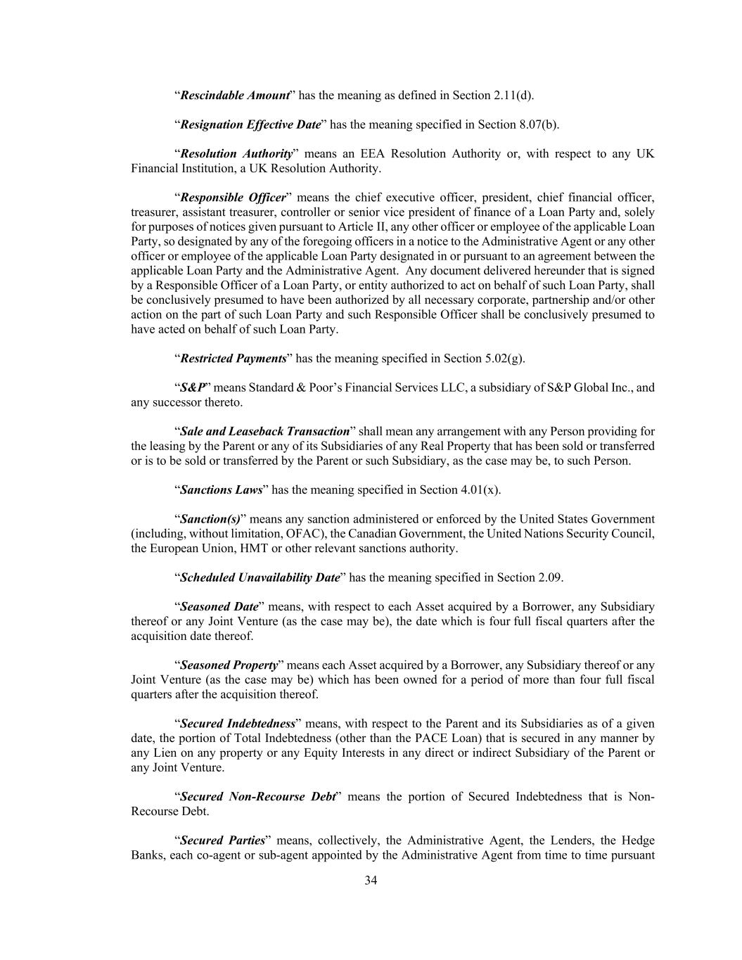 34 “Rescindable Amount” has the meaning as defined in Section 2.11(d). “Resignation Effective Date” has the meaning specified in Section 8.07(b). “Resolution Authority” means an EEA Resolution Authority or, with respect to any UK Financial Institution, a UK Resolution Authority. “Responsible Officer” means the chief executive officer, president, chief financial officer, treasurer, assistant treasurer, controller or senior vice president of finance of a Loan Party and, solely for purposes of notices given pursuant to Article II, any other officer or employee of the applicable Loan Party, so designated by any of the foregoing officers in a notice to the Administrative Agent or any other officer or employee of the applicable Loan Party designated in or pursuant to an agreement between the applicable Loan Party and the Administrative Agent. Any document delivered hereunder that is signed by a Responsible Officer of a Loan Party, or entity authorized to act on behalf of such Loan Party, shall be conclusively presumed to have been authorized by all necessary corporate, partnership and/or other action on the part of such Loan Party and such Responsible Officer shall be conclusively presumed to have acted on behalf of such Loan Party. “Restricted Payments” has the meaning specified in Section 5.02(g). “S&P” means Standard & Poor’s Financial Services LLC, a subsidiary of S&P Global Inc., and any successor thereto. “Sale and Leaseback Transaction” shall mean any arrangement with any Person providing for the leasing by the Parent or any of its Subsidiaries of any Real Property that has been sold or transferred or is to be sold or transferred by the Parent or such Subsidiary, as the case may be, to such Person. “Sanctions Laws” has the meaning specified in Section 4.01(x). “Sanction(s)” means any sanction administered or enforced by the United States Government (including, without limitation, OFAC), the Canadian Government, the United Nations Security Council, the European Union, HMT or other relevant sanctions authority. “Scheduled Unavailability Date” has the meaning specified in Section 2.09. “Seasoned Date” means, with respect to each Asset acquired by a Borrower, any Subsidiary thereof or any Joint Venture (as the case may be), the date which is four full fiscal quarters after the acquisition date thereof. “Seasoned Property” means each Asset acquired by a Borrower, any Subsidiary thereof or any Joint Venture (as the case may be) which has been owned for a period of more than four full fiscal quarters after the acquisition thereof. “Secured Indebtedness” means, with respect to the Parent and its Subsidiaries as of a given date, the portion of Total Indebtedness (other than the PACE Loan) that is secured in any manner by any Lien on any property or any Equity Interests in any direct or indirect Subsidiary of the Parent or any Joint Venture. “Secured Non-Recourse Debt” means the portion of Secured Indebtedness that is Non- Recourse Debt. “Secured Parties” means, collectively, the Administrative Agent, the Lenders, the Hedge Banks, each co-agent or sub-agent appointed by the Administrative Agent from time to time pursuant