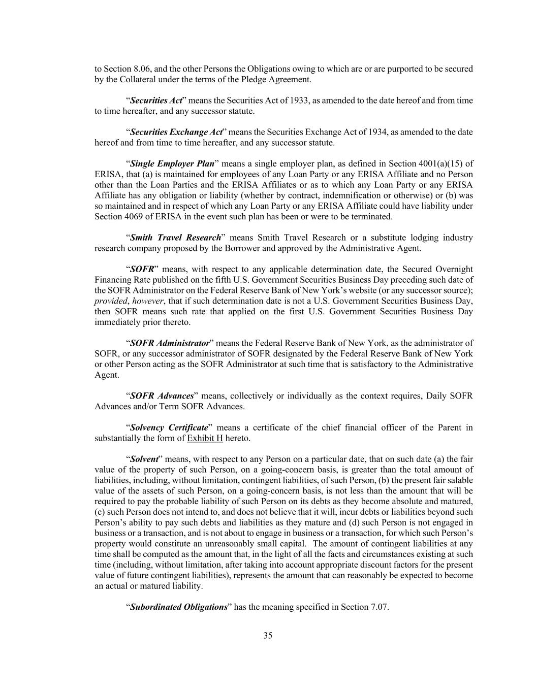 35 to Section 8.06, and the other Persons the Obligations owing to which are or are purported to be secured by the Collateral under the terms of the Pledge Agreement. “Securities Act” means the Securities Act of 1933, as amended to the date hereof and from time to time hereafter, and any successor statute. “Securities Exchange Act” means the Securities Exchange Act of 1934, as amended to the date hereof and from time to time hereafter, and any successor statute. “Single Employer Plan” means a single employer plan, as defined in Section 4001(a)(15) of ERISA, that (a) is maintained for employees of any Loan Party or any ERISA Affiliate and no Person other than the Loan Parties and the ERISA Affiliates or as to which any Loan Party or any ERISA Affiliate has any obligation or liability (whether by contract, indemnification or otherwise) or (b) was so maintained and in respect of which any Loan Party or any ERISA Affiliate could have liability under Section 4069 of ERISA in the event such plan has been or were to be terminated. “Smith Travel Research” means Smith Travel Research or a substitute lodging industry research company proposed by the Borrower and approved by the Administrative Agent. “SOFR” means, with respect to any applicable determination date, the Secured Overnight Financing Rate published on the fifth U.S. Government Securities Business Day preceding such date of the SOFR Administrator on the Federal Reserve Bank of New York’s website (or any successor source); provided, however, that if such determination date is not a U.S. Government Securities Business Day, then SOFR means such rate that applied on the first U.S. Government Securities Business Day immediately prior thereto. “SOFR Administrator” means the Federal Reserve Bank of New York, as the administrator of SOFR, or any successor administrator of SOFR designated by the Federal Reserve Bank of New York or other Person acting as the SOFR Administrator at such time that is satisfactory to the Administrative Agent. “SOFR Advances” means, collectively or individually as the context requires, Daily SOFR Advances and/or Term SOFR Advances. “Solvency Certificate” means a certificate of the chief financial officer of the Parent in substantially the form of Exhibit H hereto. “Solvent” means, with respect to any Person on a particular date, that on such date (a) the fair value of the property of such Person, on a going-concern basis, is greater than the total amount of liabilities, including, without limitation, contingent liabilities, of such Person, (b) the present fair salable value of the assets of such Person, on a going-concern basis, is not less than the amount that will be required to pay the probable liability of such Person on its debts as they become absolute and matured, (c) such Person does not intend to, and does not believe that it will, incur debts or liabilities beyond such Person’s ability to pay such debts and liabilities as they mature and (d) such Person is not engaged in business or a transaction, and is not about to engage in business or a transaction, for which such Person’s property would constitute an unreasonably small capital. The amount of contingent liabilities at any time shall be computed as the amount that, in the light of all the facts and circumstances existing at such time (including, without limitation, after taking into account appropriate discount factors for the present value of future contingent liabilities), represents the amount that can reasonably be expected to become an actual or matured liability. “Subordinated Obligations” has the meaning specified in Section 7.07.
