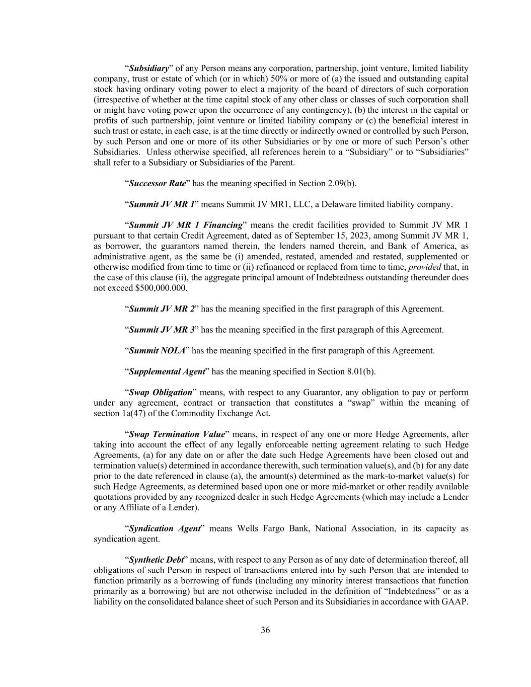 36 “Subsidiary” of any Person means any corporation, partnership, joint venture, limited liability company, trust or estate of which (or in which) 50% or more of (a) the issued and outstanding capital stock having ordinary voting power to elect a majority of the board of directors of such corporation (irrespective of whether at the time capital stock of any other class or classes of such corporation shall or might have voting power upon the occurrence of any contingency), (b) the interest in the capital or profits of such partnership, joint venture or limited liability company or (c) the beneficial interest in such trust or estate, in each case, is at the time directly or indirectly owned or controlled by such Person, by such Person and one or more of its other Subsidiaries or by one or more of such Person’s other Subsidiaries. Unless otherwise specified, all references herein to a “Subsidiary” or to “Subsidiaries” shall refer to a Subsidiary or Subsidiaries of the Parent. “Successor Rate” has the meaning specified in Section 2.09(b). “Summit JV MR 1” means Summit JV MR1, LLC, a Delaware limited liability company. “Summit JV MR 1 Financing” means the credit facilities provided to Summit JV MR 1 pursuant to that certain Credit Agreement, dated as of September 15, 2023, among Summit JV MR 1, as borrower, the guarantors named therein, the lenders named therein, and Bank of America, as administrative agent, as the same be (i) amended, restated, amended and restated, supplemented or otherwise modified from time to time or (ii) refinanced or replaced from time to time, provided that, in the case of this clause (ii), the aggregate principal amount of Indebtedness outstanding thereunder does not exceed $500,000.000. “Summit JV MR 2” has the meaning specified in the first paragraph of this Agreement. “Summit JV MR 3” has the meaning specified in the first paragraph of this Agreement. “Summit NOLA” has the meaning specified in the first paragraph of this Agreement. “Supplemental Agent” has the meaning specified in Section 8.01(b). “Swap Obligation” means, with respect to any Guarantor, any obligation to pay or perform under any agreement, contract or transaction that constitutes a “swap” within the meaning of section 1a(47) of the Commodity Exchange Act. “Swap Termination Value” means, in respect of any one or more Hedge Agreements, after taking into account the effect of any legally enforceable netting agreement relating to such Hedge Agreements, (a) for any date on or after the date such Hedge Agreements have been closed out and termination value(s) determined in accordance therewith, such termination value(s), and (b) for any date prior to the date referenced in clause (a), the amount(s) determined as the mark-to-market value(s) for such Hedge Agreements, as determined based upon one or more mid-market or other readily available quotations provided by any recognized dealer in such Hedge Agreements (which may include a Lender or any Affiliate of a Lender). “Syndication Agent” means Wells Fargo Bank, National Association, in its capacity as syndication agent. “Synthetic Debt” means, with respect to any Person as of any date of determination thereof, all obligations of such Person in respect of transactions entered into by such Person that are intended to function primarily as a borrowing of funds (including any minority interest transactions that function primarily as a borrowing) but are not otherwise included in the definition of “Indebtedness” or as a liability on the consolidated balance sheet of such Person and its Subsidiaries in accordance with GAAP.