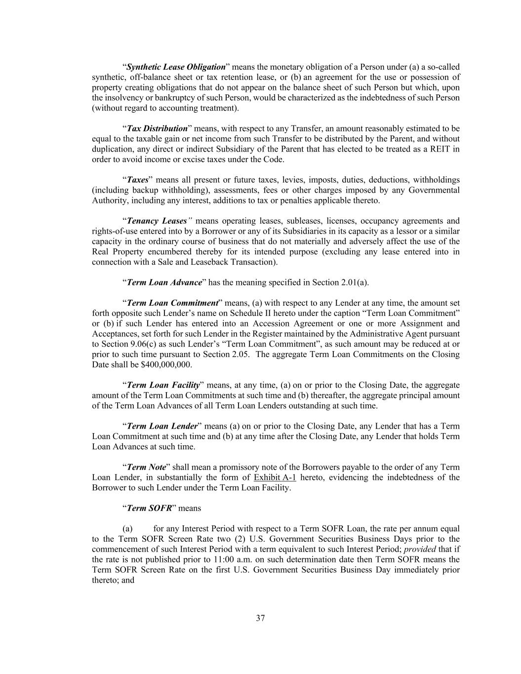 37 “Synthetic Lease Obligation” means the monetary obligation of a Person under (a) a so-called synthetic, off-balance sheet or tax retention lease, or (b) an agreement for the use or possession of property creating obligations that do not appear on the balance sheet of such Person but which, upon the insolvency or bankruptcy of such Person, would be characterized as the indebtedness of such Person (without regard to accounting treatment). “Tax Distribution” means, with respect to any Transfer, an amount reasonably estimated to be equal to the taxable gain or net income from such Transfer to be distributed by the Parent, and without duplication, any direct or indirect Subsidiary of the Parent that has elected to be treated as a REIT in order to avoid income or excise taxes under the Code. “Taxes” means all present or future taxes, levies, imposts, duties, deductions, withholdings (including backup withholding), assessments, fees or other charges imposed by any Governmental Authority, including any interest, additions to tax or penalties applicable thereto. “Tenancy Leases” means operating leases, subleases, licenses, occupancy agreements and rights-of-use entered into by a Borrower or any of its Subsidiaries in its capacity as a lessor or a similar capacity in the ordinary course of business that do not materially and adversely affect the use of the Real Property encumbered thereby for its intended purpose (excluding any lease entered into in connection with a Sale and Leaseback Transaction). “Term Loan Advance” has the meaning specified in Section 2.01(a). “Term Loan Commitment” means, (a) with respect to any Lender at any time, the amount set forth opposite such Lender’s name on Schedule II hereto under the caption “Term Loan Commitment” or (b) if such Lender has entered into an Accession Agreement or one or more Assignment and Acceptances, set forth for such Lender in the Register maintained by the Administrative Agent pursuant to Section 9.06(c) as such Lender’s “Term Loan Commitment”, as such amount may be reduced at or prior to such time pursuant to Section 2.05. The aggregate Term Loan Commitments on the Closing Date shall be $400,000,000. “Term Loan Facility” means, at any time, (a) on or prior to the Closing Date, the aggregate amount of the Term Loan Commitments at such time and (b) thereafter, the aggregate principal amount of the Term Loan Advances of all Term Loan Lenders outstanding at such time. “Term Loan Lender” means (a) on or prior to the Closing Date, any Lender that has a Term Loan Commitment at such time and (b) at any time after the Closing Date, any Lender that holds Term Loan Advances at such time. “Term Note” shall mean a promissory note of the Borrowers payable to the order of any Term Loan Lender, in substantially the form of Exhibit A-1 hereto, evidencing the indebtedness of the Borrower to such Lender under the Term Loan Facility. “Term SOFR” means (a) for any Interest Period with respect to a Term SOFR Loan, the rate per annum equal to the Term SOFR Screen Rate two (2) U.S. Government Securities Business Days prior to the commencement of such Interest Period with a term equivalent to such Interest Period; provided that if the rate is not published prior to 11:00 a.m. on such determination date then Term SOFR means the Term SOFR Screen Rate on the first U.S. Government Securities Business Day immediately prior thereto; and
