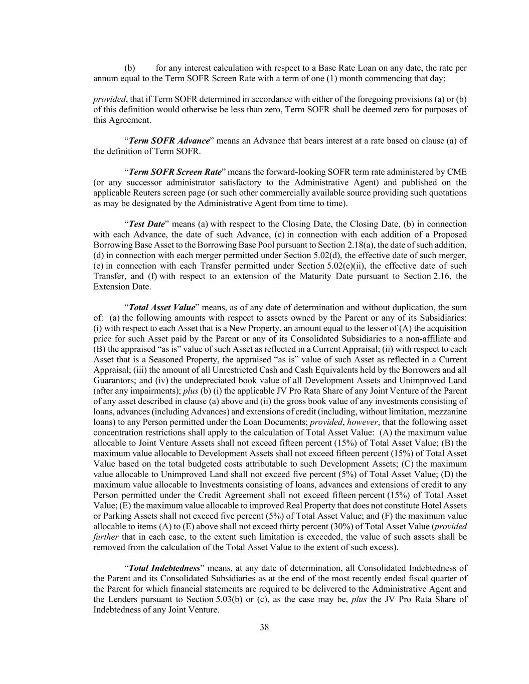 38 (b) for any interest calculation with respect to a Base Rate Loan on any date, the rate per annum equal to the Term SOFR Screen Rate with a term of one (1) month commencing that day; provided, that if Term SOFR determined in accordance with either of the foregoing provisions (a) or (b) of this definition would otherwise be less than zero, Term SOFR shall be deemed zero for purposes of this Agreement. “Term SOFR Advance” means an Advance that bears interest at a rate based on clause (a) of the definition of Term SOFR. “Term SOFR Screen Rate” means the forward-looking SOFR term rate administered by CME (or any successor administrator satisfactory to the Administrative Agent) and published on the applicable Reuters screen page (or such other commercially available source providing such quotations as may be designated by the Administrative Agent from time to time). “Test Date” means (a) with respect to the Closing Date, the Closing Date, (b) in connection with each Advance, the date of such Advance, (c) in connection with each addition of a Proposed Borrowing Base Asset to the Borrowing Base Pool pursuant to Section 2.18(a), the date of such addition, (d) in connection with each merger permitted under Section 5.02(d), the effective date of such merger, (e) in connection with each Transfer permitted under Section 5.02(e)(ii), the effective date of such Transfer, and (f) with respect to an extension of the Maturity Date pursuant to Section 2.16, the Extension Date. “Total Asset Value” means, as of any date of determination and without duplication, the sum of: (a) the following amounts with respect to assets owned by the Parent or any of its Subsidiaries: (i) with respect to each Asset that is a New Property, an amount equal to the lesser of (A) the acquisition price for such Asset paid by the Parent or any of its Consolidated Subsidiaries to a non-affiliate and (B) the appraised “as is” value of such Asset as reflected in a Current Appraisal; (ii) with respect to each Asset that is a Seasoned Property, the appraised “as is” value of such Asset as reflected in a Current Appraisal; (iii) the amount of all Unrestricted Cash and Cash Equivalents held by the Borrowers and all Guarantors; and (iv) the undepreciated book value of all Development Assets and Unimproved Land (after any impairments); plus (b) (i) the applicable JV Pro Rata Share of any Joint Venture of the Parent of any asset described in clause (a) above and (ii) the gross book value of any investments consisting of loans, advances (including Advances) and extensions of credit (including, without limitation, mezzanine loans) to any Person permitted under the Loan Documents; provided, however, that the following asset concentration restrictions shall apply to the calculation of Total Asset Value: (A) the maximum value allocable to Joint Venture Assets shall not exceed fifteen percent (15%) of Total Asset Value; (B) the maximum value allocable to Development Assets shall not exceed fifteen percent (15%) of Total Asset Value based on the total budgeted costs attributable to such Development Assets; (C) the maximum value allocable to Unimproved Land shall not exceed five percent (5%) of Total Asset Value; (D) the maximum value allocable to Investments consisting of loans, advances and extensions of credit to any Person permitted under the Credit Agreement shall not exceed fifteen percent (15%) of Total Asset Value; (E) the maximum value allocable to improved Real Property that does not constitute Hotel Assets or Parking Assets shall not exceed five percent (5%) of Total Asset Value; and (F) the maximum value allocable to items (A) to (E) above shall not exceed thirty percent (30%) of Total Asset Value (provided further that in each case, to the extent such limitation is exceeded, the value of such assets shall be removed from the calculation of the Total Asset Value to the extent of such excess). “Total Indebtedness” means, at any date of determination, all Consolidated Indebtedness of the Parent and its Consolidated Subsidiaries as at the end of the most recently ended fiscal quarter of the Parent for which financial statements are required to be delivered to the Administrative Agent and the Lenders pursuant to Section 5.03(b) or (c), as the case may be, plus the JV Pro Rata Share of Indebtedness of any Joint Venture.
