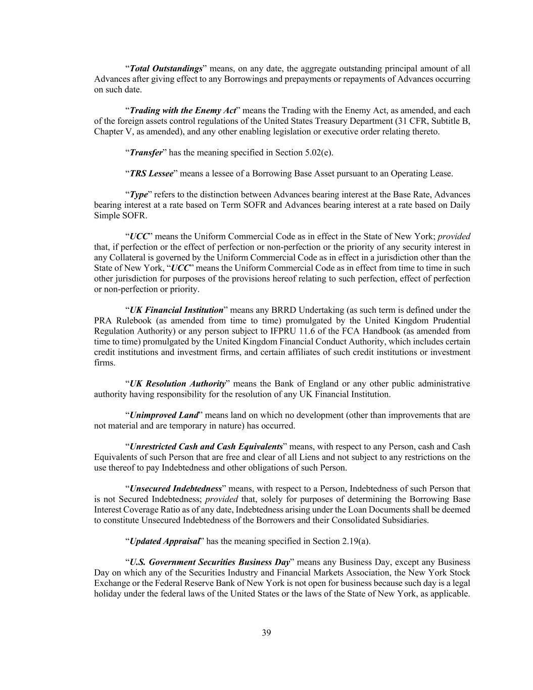 39 “Total Outstandings” means, on any date, the aggregate outstanding principal amount of all Advances after giving effect to any Borrowings and prepayments or repayments of Advances occurring on such date. “Trading with the Enemy Act” means the Trading with the Enemy Act, as amended, and each of the foreign assets control regulations of the United States Treasury Department (31 CFR, Subtitle B, Chapter V, as amended), and any other enabling legislation or executive order relating thereto. “Transfer” has the meaning specified in Section 5.02(e). “TRS Lessee” means a lessee of a Borrowing Base Asset pursuant to an Operating Lease. “Type” refers to the distinction between Advances bearing interest at the Base Rate, Advances bearing interest at a rate based on Term SOFR and Advances bearing interest at a rate based on Daily Simple SOFR. “UCC” means the Uniform Commercial Code as in effect in the State of New York; provided that, if perfection or the effect of perfection or non-perfection or the priority of any security interest in any Collateral is governed by the Uniform Commercial Code as in effect in a jurisdiction other than the State of New York, “UCC” means the Uniform Commercial Code as in effect from time to time in such other jurisdiction for purposes of the provisions hereof relating to such perfection, effect of perfection or non-perfection or priority. “UK Financial Institution” means any BRRD Undertaking (as such term is defined under the PRA Rulebook (as amended from time to time) promulgated by the United Kingdom Prudential Regulation Authority) or any person subject to IFPRU 11.6 of the FCA Handbook (as amended from time to time) promulgated by the United Kingdom Financial Conduct Authority, which includes certain credit institutions and investment firms, and certain affiliates of such credit institutions or investment firms. “UK Resolution Authority” means the Bank of England or any other public administrative authority having responsibility for the resolution of any UK Financial Institution. “Unimproved Land” means land on which no development (other than improvements that are not material and are temporary in nature) has occurred. “Unrestricted Cash and Cash Equivalents” means, with respect to any Person, cash and Cash Equivalents of such Person that are free and clear of all Liens and not subject to any restrictions on the use thereof to pay Indebtedness and other obligations of such Person. “Unsecured Indebtedness” means, with respect to a Person, Indebtedness of such Person that is not Secured Indebtedness; provided that, solely for purposes of determining the Borrowing Base Interest Coverage Ratio as of any date, Indebtedness arising under the Loan Documents shall be deemed to constitute Unsecured Indebtedness of the Borrowers and their Consolidated Subsidiaries. “Updated Appraisal” has the meaning specified in Section 2.19(a). “U.S. Government Securities Business Day” means any Business Day, except any Business Day on which any of the Securities Industry and Financial Markets Association, the New York Stock Exchange or the Federal Reserve Bank of New York is not open for business because such day is a legal holiday under the federal laws of the United States or the laws of the State of New York, as applicable.