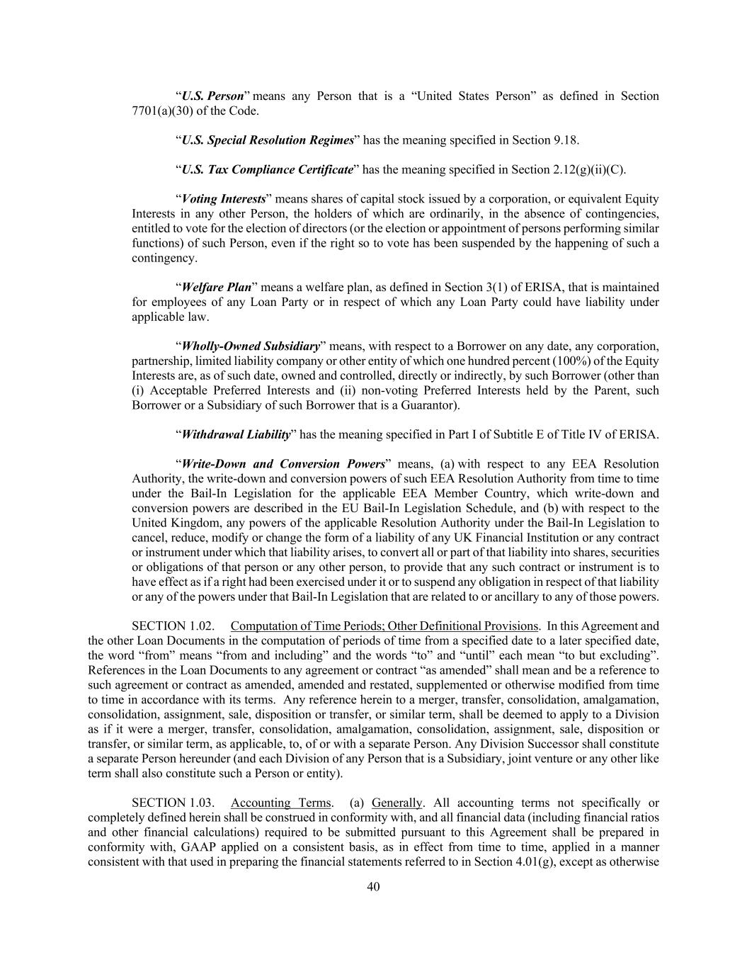 40 “U.S. Person” means any Person that is a “United States Person” as defined in Section 7701(a)(30) of the Code. “U.S. Special Resolution Regimes” has the meaning specified in Section 9.18. “U.S. Tax Compliance Certificate” has the meaning specified in Section 2.12(g)(ii)(C). “Voting Interests” means shares of capital stock issued by a corporation, or equivalent Equity Interests in any other Person, the holders of which are ordinarily, in the absence of contingencies, entitled to vote for the election of directors (or the election or appointment of persons performing similar functions) of such Person, even if the right so to vote has been suspended by the happening of such a contingency. “Welfare Plan” means a welfare plan, as defined in Section 3(1) of ERISA, that is maintained for employees of any Loan Party or in respect of which any Loan Party could have liability under applicable law. “Wholly-Owned Subsidiary” means, with respect to a Borrower on any date, any corporation, partnership, limited liability company or other entity of which one hundred percent (100%) of the Equity Interests are, as of such date, owned and controlled, directly or indirectly, by such Borrower (other than (i) Acceptable Preferred Interests and (ii) non-voting Preferred Interests held by the Parent, such Borrower or a Subsidiary of such Borrower that is a Guarantor). “Withdrawal Liability” has the meaning specified in Part I of Subtitle E of Title IV of ERISA. “Write-Down and Conversion Powers” means, (a) with respect to any EEA Resolution Authority, the write-down and conversion powers of such EEA Resolution Authority from time to time under the Bail-In Legislation for the applicable EEA Member Country, which write-down and conversion powers are described in the EU Bail-In Legislation Schedule, and (b) with respect to the United Kingdom, any powers of the applicable Resolution Authority under the Bail-In Legislation to cancel, reduce, modify or change the form of a liability of any UK Financial Institution or any contract or instrument under which that liability arises, to convert all or part of that liability into shares, securities or obligations of that person or any other person, to provide that any such contract or instrument is to have effect as if a right had been exercised under it or to suspend any obligation in respect of that liability or any of the powers under that Bail-In Legislation that are related to or ancillary to any of those powers. SECTION 1.02. Computation of Time Periods; Other Definitional Provisions. In this Agreement and the other Loan Documents in the computation of periods of time from a specified date to a later specified date, the word “from” means “from and including” and the words “to” and “until” each mean “to but excluding”. References in the Loan Documents to any agreement or contract “as amended” shall mean and be a reference to such agreement or contract as amended, amended and restated, supplemented or otherwise modified from time to time in accordance with its terms. Any reference herein to a merger, transfer, consolidation, amalgamation, consolidation, assignment, sale, disposition or transfer, or similar term, shall be deemed to apply to a Division as if it were a merger, transfer, consolidation, amalgamation, consolidation, assignment, sale, disposition or transfer, or similar term, as applicable, to, of or with a separate Person. Any Division Successor shall constitute a separate Person hereunder (and each Division of any Person that is a Subsidiary, joint venture or any other like term shall also constitute such a Person or entity). SECTION 1.03. Accounting Terms. (a) Generally. All accounting terms not specifically or completely defined herein shall be construed in conformity with, and all financial data (including financial ratios and other financial calculations) required to be submitted pursuant to this Agreement shall be prepared in conformity with, GAAP applied on a consistent basis, as in effect from time to time, applied in a manner consistent with that used in preparing the financial statements referred to in Section 4.01(g), except as otherwise