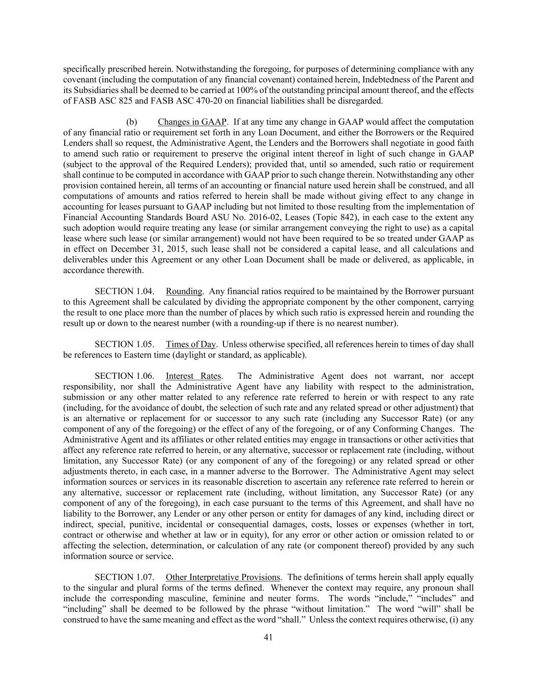 41 specifically prescribed herein. Notwithstanding the foregoing, for purposes of determining compliance with any covenant (including the computation of any financial covenant) contained herein, Indebtedness of the Parent and its Subsidiaries shall be deemed to be carried at 100% of the outstanding principal amount thereof, and the effects of FASB ASC 825 and FASB ASC 470-20 on financial liabilities shall be disregarded. (b) Changes in GAAP. If at any time any change in GAAP would affect the computation of any financial ratio or requirement set forth in any Loan Document, and either the Borrowers or the Required Lenders shall so request, the Administrative Agent, the Lenders and the Borrowers shall negotiate in good faith to amend such ratio or requirement to preserve the original intent thereof in light of such change in GAAP (subject to the approval of the Required Lenders); provided that, until so amended, such ratio or requirement shall continue to be computed in accordance with GAAP prior to such change therein. Notwithstanding any other provision contained herein, all terms of an accounting or financial nature used herein shall be construed, and all computations of amounts and ratios referred to herein shall be made without giving effect to any change in accounting for leases pursuant to GAAP including but not limited to those resulting from the implementation of Financial Accounting Standards Board ASU No. 2016-02, Leases (Topic 842), in each case to the extent any such adoption would require treating any lease (or similar arrangement conveying the right to use) as a capital lease where such lease (or similar arrangement) would not have been required to be so treated under GAAP as in effect on December 31, 2015, such lease shall not be considered a capital lease, and all calculations and deliverables under this Agreement or any other Loan Document shall be made or delivered, as applicable, in accordance therewith. SECTION 1.04. Rounding. Any financial ratios required to be maintained by the Borrower pursuant to this Agreement shall be calculated by dividing the appropriate component by the other component, carrying the result to one place more than the number of places by which such ratio is expressed herein and rounding the result up or down to the nearest number (with a rounding-up if there is no nearest number). SECTION 1.05. Times of Day. Unless otherwise specified, all references herein to times of day shall be references to Eastern time (daylight or standard, as applicable). SECTION 1.06. Interest Rates. The Administrative Agent does not warrant, nor accept responsibility, nor shall the Administrative Agent have any liability with respect to the administration, submission or any other matter related to any reference rate referred to herein or with respect to any rate (including, for the avoidance of doubt, the selection of such rate and any related spread or other adjustment) that is an alternative or replacement for or successor to any such rate (including any Successor Rate) (or any component of any of the foregoing) or the effect of any of the foregoing, or of any Conforming Changes. The Administrative Agent and its affiliates or other related entities may engage in transactions or other activities that affect any reference rate referred to herein, or any alternative, successor or replacement rate (including, without limitation, any Successor Rate) (or any component of any of the foregoing) or any related spread or other adjustments thereto, in each case, in a manner adverse to the Borrower. The Administrative Agent may select information sources or services in its reasonable discretion to ascertain any reference rate referred to herein or any alternative, successor or replacement rate (including, without limitation, any Successor Rate) (or any component of any of the foregoing), in each case pursuant to the terms of this Agreement, and shall have no liability to the Borrower, any Lender or any other person or entity for damages of any kind, including direct or indirect, special, punitive, incidental or consequential damages, costs, losses or expenses (whether in tort, contract or otherwise and whether at law or in equity), for any error or other action or omission related to or affecting the selection, determination, or calculation of any rate (or component thereof) provided by any such information source or service. SECTION 1.07. Other Interpretative Provisions. The definitions of terms herein shall apply equally to the singular and plural forms of the terms defined. Whenever the context may require, any pronoun shall include the corresponding masculine, feminine and neuter forms. The words “include,” “includes” and “including” shall be deemed to be followed by the phrase “without limitation.” The word “will” shall be construed to have the same meaning and effect as the word “shall.” Unless the context requires otherwise, (i) any