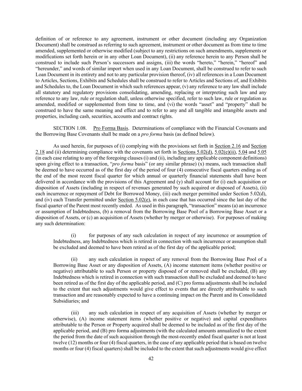 42 definition of or reference to any agreement, instrument or other document (including any Organization Document) shall be construed as referring to such agreement, instrument or other document as from time to time amended, supplemented or otherwise modified (subject to any restrictions on such amendments, supplements or modifications set forth herein or in any other Loan Document), (ii) any reference herein to any Person shall be construed to include such Person’s successors and assigns, (iii) the words “hereto,” “herein,” “hereof” and “hereunder,” and words of similar import when used in any Loan Document, shall be construed to refer to such Loan Document in its entirety and not to any particular provision thereof, (iv) all references in a Loan Document to Articles, Sections, Exhibits and Schedules shall be construed to refer to Articles and Sections of, and Exhibits and Schedules to, the Loan Document in which such references appear, (v) any reference to any law shall include all statutory and regulatory provisions consolidating, amending, replacing or interpreting such law and any reference to any law, rule or regulation shall, unless otherwise specified, refer to such law, rule or regulation as amended, modified or supplemented from time to time, and (vi) the words “asset” and “property” shall be construed to have the same meaning and effect and to refer to any and all tangible and intangible assets and properties, including cash, securities, accounts and contract rights. SECTION 1.08. Pro Forma Basis. Determinations of compliance with the Financial Covenants and the Borrowing Base Covenants shall be made on a pro forma basis (as defined below). As used herein, for purposes of (i) complying with the provisions set forth in Section 2.16 and Section 2.18 and (ii) determining compliance with the covenants set forth in Sections 5.02(d), 5.02(e)(ii), 5.04 and 5.05 (in each case relating to any of the foregoing clauses (i) and (ii), including any applicable component definitions) upon giving effect to a transaction, “pro forma basis” (or any similar phrase) (x) means, such transaction shall be deemed to have occurred as of the first day of the period of four (4) consecutive fiscal quarters ending as of the end of the most recent fiscal quarter for which annual or quarterly financial statements shall have been delivered in accordance with the provisions of this Agreement and (y) shall account for (i) each acquisition or disposition of Assets (including in respect of revenues generated by such acquired or disposed of Assets), (ii) each incurrence or repayment of Debt for Borrowed Money, (iii) each merger permitted under Section 5.02(d), and (iv) each Transfer permitted under Section 5.02(e), in each case that has occurred since the last day of the fiscal quarter of the Parent most recently ended. As used in this paragraph, “transaction” means (a) an incurrence or assumption of Indebtedness, (b) a removal from the Borrowing Base Pool of a Borrowing Base Asset or a disposition of Assets, or (c) an acquisition of Assets (whether by merger or otherwise). For purposes of making any such determination: (i) for purposes of any such calculation in respect of any incurrence or assumption of Indebtedness, any Indebtedness which is retired in connection with such incurrence or assumption shall be excluded and deemed to have been retired as of the first day of the applicable period; (ii) any such calculation in respect of any removal from the Borrowing Base Pool of a Borrowing Base Asset or any disposition of Assets, (A) income statement items (whether positive or negative) attributable to such Person or property disposed of or removed shall be excluded, (B) any Indebtedness which is retired in connection with such transaction shall be excluded and deemed to have been retired as of the first day of the applicable period, and (C) pro forma adjustments shall be included to the extent that such adjustments would give effect to events that are directly attributable to such transaction and are reasonably expected to have a continuing impact on the Parent and its Consolidated Subsidiaries; and (iii) any such calculation in respect of any acquisition of Assets (whether by merger or otherwise), (A) income statement items (whether positive or negative) and capital expenditures attributable to the Person or Property acquired shall be deemed to be included as of the first day of the applicable period, and (B) pro forma adjustments (with the calculated amounts annualized to the extent the period from the date of such acquisition through the most-recently ended fiscal quarter is not at least twelve (12) months or four (4) fiscal quarters, in the case of any applicable period that is based on twelve months or four (4) fiscal quarters) shall be included to the extent that such adjustments would give effect