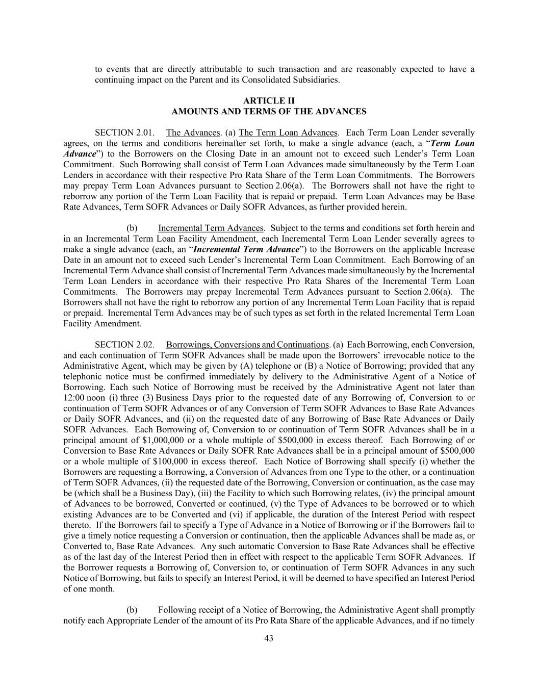 43 to events that are directly attributable to such transaction and are reasonably expected to have a continuing impact on the Parent and its Consolidated Subsidiaries. ARTICLE II AMOUNTS AND TERMS OF THE ADVANCES SECTION 2.01. The Advances. (a) The Term Loan Advances. Each Term Loan Lender severally agrees, on the terms and conditions hereinafter set forth, to make a single advance (each, a “Term Loan Advance”) to the Borrowers on the Closing Date in an amount not to exceed such Lender’s Term Loan Commitment. Such Borrowing shall consist of Term Loan Advances made simultaneously by the Term Loan Lenders in accordance with their respective Pro Rata Share of the Term Loan Commitments. The Borrowers may prepay Term Loan Advances pursuant to Section 2.06(a). The Borrowers shall not have the right to reborrow any portion of the Term Loan Facility that is repaid or prepaid. Term Loan Advances may be Base Rate Advances, Term SOFR Advances or Daily SOFR Advances, as further provided herein. (b) Incremental Term Advances. Subject to the terms and conditions set forth herein and in an Incremental Term Loan Facility Amendment, each Incremental Term Loan Lender severally agrees to make a single advance (each, an “Incremental Term Advance”) to the Borrowers on the applicable Increase Date in an amount not to exceed such Lender’s Incremental Term Loan Commitment. Each Borrowing of an Incremental Term Advance shall consist of Incremental Term Advances made simultaneously by the Incremental Term Loan Lenders in accordance with their respective Pro Rata Shares of the Incremental Term Loan Commitments. The Borrowers may prepay Incremental Term Advances pursuant to Section 2.06(a). The Borrowers shall not have the right to reborrow any portion of any Incremental Term Loan Facility that is repaid or prepaid. Incremental Term Advances may be of such types as set forth in the related Incremental Term Loan Facility Amendment. SECTION 2.02. Borrowings, Conversions and Continuations. (a) Each Borrowing, each Conversion, and each continuation of Term SOFR Advances shall be made upon the Borrowers’ irrevocable notice to the Administrative Agent, which may be given by (A) telephone or (B) a Notice of Borrowing; provided that any telephonic notice must be confirmed immediately by delivery to the Administrative Agent of a Notice of Borrowing. Each such Notice of Borrowing must be received by the Administrative Agent not later than 12:00 noon (i) three (3) Business Days prior to the requested date of any Borrowing of, Conversion to or continuation of Term SOFR Advances or of any Conversion of Term SOFR Advances to Base Rate Advances or Daily SOFR Advances, and (ii) on the requested date of any Borrowing of Base Rate Advances or Daily SOFR Advances. Each Borrowing of, Conversion to or continuation of Term SOFR Advances shall be in a principal amount of $1,000,000 or a whole multiple of $500,000 in excess thereof. Each Borrowing of or Conversion to Base Rate Advances or Daily SOFR Rate Advances shall be in a principal amount of $500,000 or a whole multiple of $100,000 in excess thereof. Each Notice of Borrowing shall specify (i) whether the Borrowers are requesting a Borrowing, a Conversion of Advances from one Type to the other, or a continuation of Term SOFR Advances, (ii) the requested date of the Borrowing, Conversion or continuation, as the case may be (which shall be a Business Day), (iii) the Facility to which such Borrowing relates, (iv) the principal amount of Advances to be borrowed, Converted or continued, (v) the Type of Advances to be borrowed or to which existing Advances are to be Converted and (vi) if applicable, the duration of the Interest Period with respect thereto. If the Borrowers fail to specify a Type of Advance in a Notice of Borrowing or if the Borrowers fail to give a timely notice requesting a Conversion or continuation, then the applicable Advances shall be made as, or Converted to, Base Rate Advances. Any such automatic Conversion to Base Rate Advances shall be effective as of the last day of the Interest Period then in effect with respect to the applicable Term SOFR Advances. If the Borrower requests a Borrowing of, Conversion to, or continuation of Term SOFR Advances in any such Notice of Borrowing, but fails to specify an Interest Period, it will be deemed to have specified an Interest Period of one month. (b) Following receipt of a Notice of Borrowing, the Administrative Agent shall promptly notify each Appropriate Lender of the amount of its Pro Rata Share of the applicable Advances, and if no timely