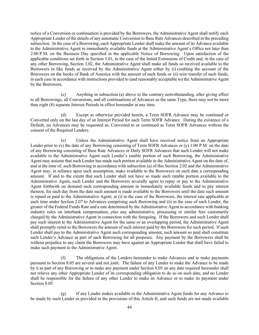 44 notice of a Conversion or continuation is provided by the Borrowers, the Administrative Agent shall notify each Appropriate Lender of the details of any automatic Conversion to Base Rate Advances described in the preceding subsection. In the case of a Borrowing, each Appropriate Lender shall make the amount of its Advance available to the Administrative Agent in immediately available funds at the Administrative Agent’s Office not later than 2:00 P.M. on the Business Day specified in the applicable Notice of Borrowing. Upon satisfaction of the applicable conditions set forth in Section 3.01, in the case of the Initial Extensions of Credit and, in the case of any other Borrowing, Section 3.02, the Administrative Agent shall make all funds so received available to the Borrowers in like funds as received by the Administrative Agent either by (i) crediting the account of the Borrowers on the books of Bank of America with the amount of such funds or (ii) wire transfer of such funds, in each case in accordance with instructions provided to (and reasonably acceptable to) the Administrative Agent by the Borrowers. (c) Anything in subsection (a) above to the contrary notwithstanding, after giving effect to all Borrowings, all Conversions, and all continuations of Advances as the same Type, there may not be more than eight (8) separate Interest Periods in effect hereunder at any time. (d) Except as otherwise provided herein, a Term SOFR Advance may be continued or Converted only on the last day of an Interest Period for such Term SOFR Advance. During the existence of a Default, no Advances may be requested as, Converted to or continued as Term SOFR Advances without the consent of the Required Lenders. (e) Unless the Administrative Agent shall have received notice from an Appropriate Lender prior to (x) the date of any Borrowing consisting of Term SOFR Advances or (y) 1:00 P.M. on the date of any Borrowing consisting of Base Rate Advances or Daily SOFR Advances that such Lender will not make available to the Administrative Agent such Lender’s ratable portion of such Borrowing, the Administrative Agent may assume that such Lender has made such portion available to the Administrative Agent on the date of, and at the time of, such Borrowing in accordance with subsection (a) of this Section 2.02 and the Administrative Agent may, in reliance upon such assumption, make available to the Borrowers on such date a corresponding amount. If and to the extent that such Lender shall not have so made such ratable portion available to the Administrative Agent, such Lender and the Borrowers severally agree to repay or pay to the Administrative Agent forthwith on demand such corresponding amount in immediately available funds and to pay interest thereon, for each day from the date such amount is made available to the Borrowers until the date such amount is repaid or paid to the Administrative Agent, at (i) in the case of the Borrowers, the interest rate applicable at such time under Section 2.07 to Advances comprising such Borrowing and (ii) in the case of such Lender, the greater of the Federal Funds Rate and a rate determined by the Administrative Agent in accordance with banking industry rules on interbank compensation, plus any administrative, processing or similar fees customarily charged by the Administrative Agent in connection with the foregoing. If the Borrowers and such Lender shall pay such interest to the Administrative Agent for the same or an overlapping period, the Administrative Agent shall promptly remit to the Borrowers the amount of such interest paid by the Borrowers for such period. If such Lender shall pay to the Administrative Agent such corresponding amount, such amount so paid shall constitute such Lender’s Advance as part of such Borrowing for all purposes. Any payment by the Borrowers shall be without prejudice to any claim the Borrowers may have against an Appropriate Lender that shall have failed to make such payment to the Administrative Agent. (f) The obligations of the Lenders hereunder to make Advances and to make payments pursuant to Section 8.05 are several and not joint. The failure of any Lender to make the Advance to be made by it as part of any Borrowing or to make any payment under Section 8.05 on any date required hereunder shall not relieve any other Appropriate Lender of its corresponding obligation to do so on such date, and no Lender shall be responsible for the failure of any other Lender to make its Advance or to make its payment under Section 8.05. (g) If any Lender makes available to the Administrative Agent funds for any Advance to be made by such Lender as provided in the provisions of this Article II, and such funds are not made available