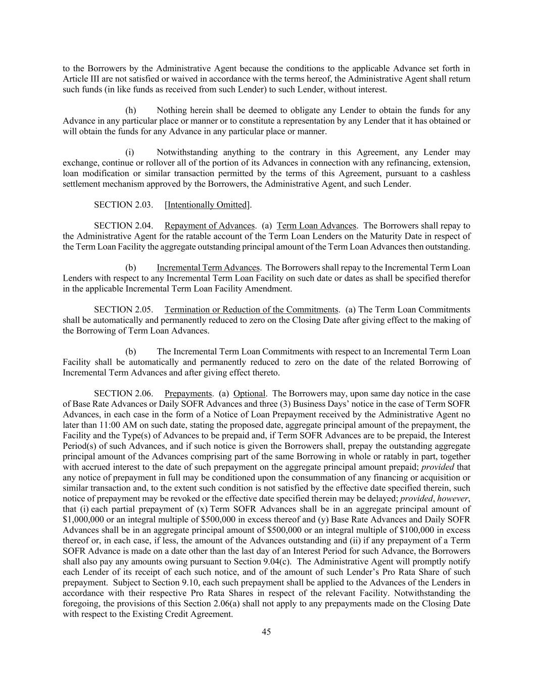 45 to the Borrowers by the Administrative Agent because the conditions to the applicable Advance set forth in Article III are not satisfied or waived in accordance with the terms hereof, the Administrative Agent shall return such funds (in like funds as received from such Lender) to such Lender, without interest. (h) Nothing herein shall be deemed to obligate any Lender to obtain the funds for any Advance in any particular place or manner or to constitute a representation by any Lender that it has obtained or will obtain the funds for any Advance in any particular place or manner. (i) Notwithstanding anything to the contrary in this Agreement, any Lender may exchange, continue or rollover all of the portion of its Advances in connection with any refinancing, extension, loan modification or similar transaction permitted by the terms of this Agreement, pursuant to a cashless settlement mechanism approved by the Borrowers, the Administrative Agent, and such Lender. SECTION 2.03. [Intentionally Omitted]. SECTION 2.04. Repayment of Advances. (a) Term Loan Advances. The Borrowers shall repay to the Administrative Agent for the ratable account of the Term Loan Lenders on the Maturity Date in respect of the Term Loan Facility the aggregate outstanding principal amount of the Term Loan Advances then outstanding. (b) Incremental Term Advances. The Borrowers shall repay to the Incremental Term Loan Lenders with respect to any Incremental Term Loan Facility on such date or dates as shall be specified therefor in the applicable Incremental Term Loan Facility Amendment. SECTION 2.05. Termination or Reduction of the Commitments. (a) The Term Loan Commitments shall be automatically and permanently reduced to zero on the Closing Date after giving effect to the making of the Borrowing of Term Loan Advances. (b) The Incremental Term Loan Commitments with respect to an Incremental Term Loan Facility shall be automatically and permanently reduced to zero on the date of the related Borrowing of Incremental Term Advances and after giving effect thereto. SECTION 2.06. Prepayments. (a) Optional. The Borrowers may, upon same day notice in the case of Base Rate Advances or Daily SOFR Advances and three (3) Business Days’ notice in the case of Term SOFR Advances, in each case in the form of a Notice of Loan Prepayment received by the Administrative Agent no later than 11:00 AM on such date, stating the proposed date, aggregate principal amount of the prepayment, the Facility and the Type(s) of Advances to be prepaid and, if Term SOFR Advances are to be prepaid, the Interest Period(s) of such Advances, and if such notice is given the Borrowers shall, prepay the outstanding aggregate principal amount of the Advances comprising part of the same Borrowing in whole or ratably in part, together with accrued interest to the date of such prepayment on the aggregate principal amount prepaid; provided that any notice of prepayment in full may be conditioned upon the consummation of any financing or acquisition or similar transaction and, to the extent such condition is not satisfied by the effective date specified therein, such notice of prepayment may be revoked or the effective date specified therein may be delayed; provided, however, that (i) each partial prepayment of (x) Term SOFR Advances shall be in an aggregate principal amount of $1,000,000 or an integral multiple of $500,000 in excess thereof and (y) Base Rate Advances and Daily SOFR Advances shall be in an aggregate principal amount of $500,000 or an integral multiple of $100,000 in excess thereof or, in each case, if less, the amount of the Advances outstanding and (ii) if any prepayment of a Term SOFR Advance is made on a date other than the last day of an Interest Period for such Advance, the Borrowers shall also pay any amounts owing pursuant to Section 9.04(c). The Administrative Agent will promptly notify each Lender of its receipt of each such notice, and of the amount of such Lender’s Pro Rata Share of such prepayment. Subject to Section 9.10, each such prepayment shall be applied to the Advances of the Lenders in accordance with their respective Pro Rata Shares in respect of the relevant Facility. Notwithstanding the foregoing, the provisions of this Section 2.06(a) shall not apply to any prepayments made on the Closing Date with respect to the Existing Credit Agreement.