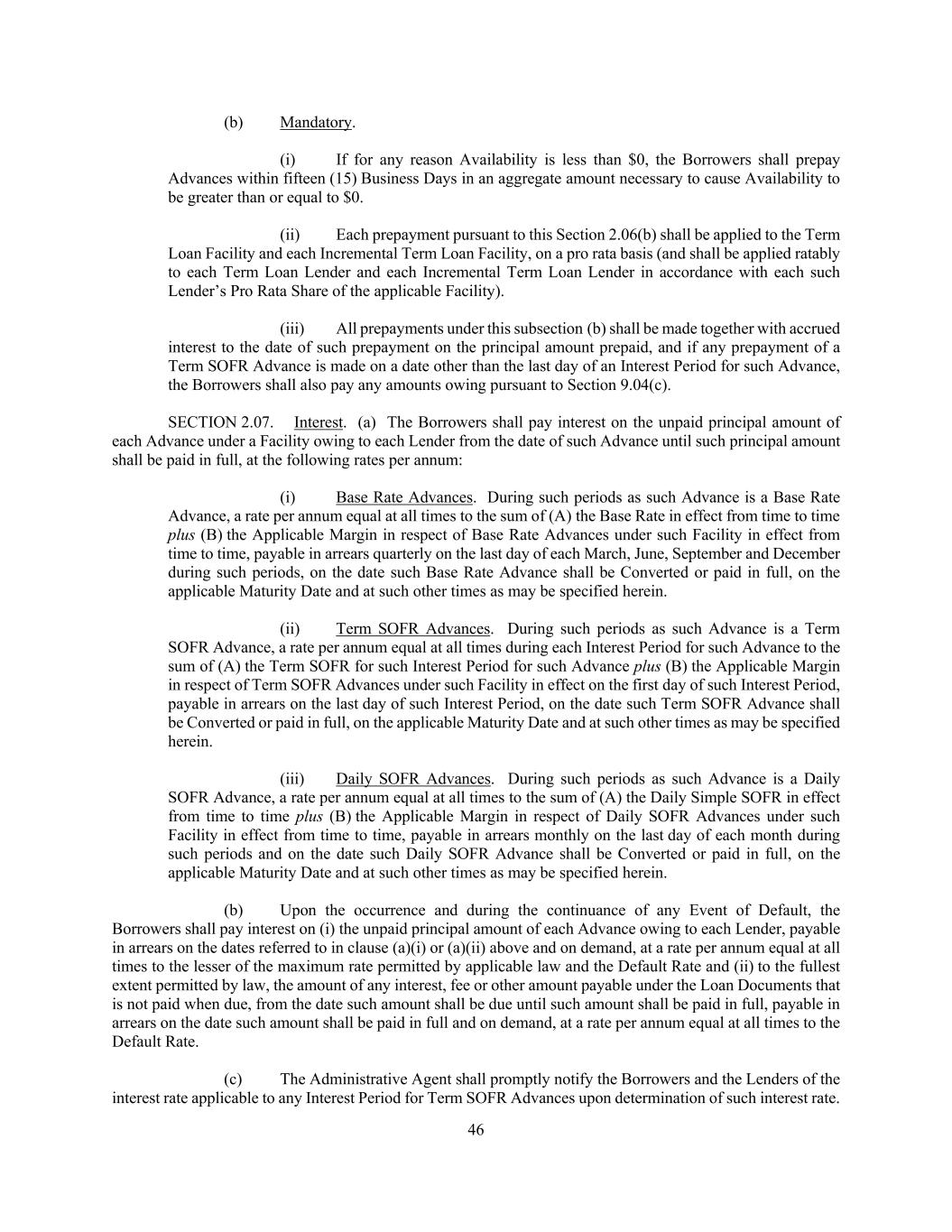 46 (b) Mandatory. (i) If for any reason Availability is less than $0, the Borrowers shall prepay Advances within fifteen (15) Business Days in an aggregate amount necessary to cause Availability to be greater than or equal to $0. (ii) Each prepayment pursuant to this Section 2.06(b) shall be applied to the Term Loan Facility and each Incremental Term Loan Facility, on a pro rata basis (and shall be applied ratably to each Term Loan Lender and each Incremental Term Loan Lender in accordance with each such Lender’s Pro Rata Share of the applicable Facility). (iii) All prepayments under this subsection (b) shall be made together with accrued interest to the date of such prepayment on the principal amount prepaid, and if any prepayment of a Term SOFR Advance is made on a date other than the last day of an Interest Period for such Advance, the Borrowers shall also pay any amounts owing pursuant to Section 9.04(c). SECTION 2.07. Interest. (a) The Borrowers shall pay interest on the unpaid principal amount of each Advance under a Facility owing to each Lender from the date of such Advance until such principal amount shall be paid in full, at the following rates per annum: (i) Base Rate Advances. During such periods as such Advance is a Base Rate Advance, a rate per annum equal at all times to the sum of (A) the Base Rate in effect from time to time plus (B) the Applicable Margin in respect of Base Rate Advances under such Facility in effect from time to time, payable in arrears quarterly on the last day of each March, June, September and December during such periods, on the date such Base Rate Advance shall be Converted or paid in full, on the applicable Maturity Date and at such other times as may be specified herein. (ii) Term SOFR Advances. During such periods as such Advance is a Term SOFR Advance, a rate per annum equal at all times during each Interest Period for such Advance to the sum of (A) the Term SOFR for such Interest Period for such Advance plus (B) the Applicable Margin in respect of Term SOFR Advances under such Facility in effect on the first day of such Interest Period, payable in arrears on the last day of such Interest Period, on the date such Term SOFR Advance shall be Converted or paid in full, on the applicable Maturity Date and at such other times as may be specified herein. (iii) Daily SOFR Advances. During such periods as such Advance is a Daily SOFR Advance, a rate per annum equal at all times to the sum of (A) the Daily Simple SOFR in effect from time to time plus (B) the Applicable Margin in respect of Daily SOFR Advances under such Facility in effect from time to time, payable in arrears monthly on the last day of each month during such periods and on the date such Daily SOFR Advance shall be Converted or paid in full, on the applicable Maturity Date and at such other times as may be specified herein. (b) Upon the occurrence and during the continuance of any Event of Default, the Borrowers shall pay interest on (i) the unpaid principal amount of each Advance owing to each Lender, payable in arrears on the dates referred to in clause (a)(i) or (a)(ii) above and on demand, at a rate per annum equal at all times to the lesser of the maximum rate permitted by applicable law and the Default Rate and (ii) to the fullest extent permitted by law, the amount of any interest, fee or other amount payable under the Loan Documents that is not paid when due, from the date such amount shall be due until such amount shall be paid in full, payable in arrears on the date such amount shall be paid in full and on demand, at a rate per annum equal at all times to the Default Rate. (c) The Administrative Agent shall promptly notify the Borrowers and the Lenders of the interest rate applicable to any Interest Period for Term SOFR Advances upon determination of such interest rate.