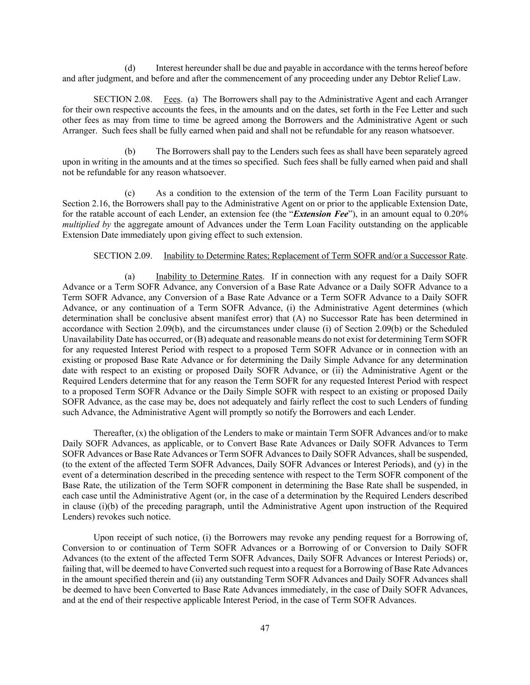 47 (d) Interest hereunder shall be due and payable in accordance with the terms hereof before and after judgment, and before and after the commencement of any proceeding under any Debtor Relief Law. SECTION 2.08. Fees. (a) The Borrowers shall pay to the Administrative Agent and each Arranger for their own respective accounts the fees, in the amounts and on the dates, set forth in the Fee Letter and such other fees as may from time to time be agreed among the Borrowers and the Administrative Agent or such Arranger. Such fees shall be fully earned when paid and shall not be refundable for any reason whatsoever. (b) The Borrowers shall pay to the Lenders such fees as shall have been separately agreed upon in writing in the amounts and at the times so specified. Such fees shall be fully earned when paid and shall not be refundable for any reason whatsoever. (c) As a condition to the extension of the term of the Term Loan Facility pursuant to Section 2.16, the Borrowers shall pay to the Administrative Agent on or prior to the applicable Extension Date, for the ratable account of each Lender, an extension fee (the “Extension Fee”), in an amount equal to 0.20% multiplied by the aggregate amount of Advances under the Term Loan Facility outstanding on the applicable Extension Date immediately upon giving effect to such extension. SECTION 2.09. Inability to Determine Rates; Replacement of Term SOFR and/or a Successor Rate. (a) Inability to Determine Rates. If in connection with any request for a Daily SOFR Advance or a Term SOFR Advance, any Conversion of a Base Rate Advance or a Daily SOFR Advance to a Term SOFR Advance, any Conversion of a Base Rate Advance or a Term SOFR Advance to a Daily SOFR Advance, or any continuation of a Term SOFR Advance, (i) the Administrative Agent determines (which determination shall be conclusive absent manifest error) that (A) no Successor Rate has been determined in accordance with Section 2.09(b), and the circumstances under clause (i) of Section 2.09(b) or the Scheduled Unavailability Date has occurred, or (B) adequate and reasonable means do not exist for determining Term SOFR for any requested Interest Period with respect to a proposed Term SOFR Advance or in connection with an existing or proposed Base Rate Advance or for determining the Daily Simple Advance for any determination date with respect to an existing or proposed Daily SOFR Advance, or (ii) the Administrative Agent or the Required Lenders determine that for any reason the Term SOFR for any requested Interest Period with respect to a proposed Term SOFR Advance or the Daily Simple SOFR with respect to an existing or proposed Daily SOFR Advance, as the case may be, does not adequately and fairly reflect the cost to such Lenders of funding such Advance, the Administrative Agent will promptly so notify the Borrowers and each Lender. Thereafter, (x) the obligation of the Lenders to make or maintain Term SOFR Advances and/or to make Daily SOFR Advances, as applicable, or to Convert Base Rate Advances or Daily SOFR Advances to Term SOFR Advances or Base Rate Advances or Term SOFR Advances to Daily SOFR Advances, shall be suspended, (to the extent of the affected Term SOFR Advances, Daily SOFR Advances or Interest Periods), and (y) in the event of a determination described in the preceding sentence with respect to the Term SOFR component of the Base Rate, the utilization of the Term SOFR component in determining the Base Rate shall be suspended, in each case until the Administrative Agent (or, in the case of a determination by the Required Lenders described in clause (i)(b) of the preceding paragraph, until the Administrative Agent upon instruction of the Required Lenders) revokes such notice. Upon receipt of such notice, (i) the Borrowers may revoke any pending request for a Borrowing of, Conversion to or continuation of Term SOFR Advances or a Borrowing of or Conversion to Daily SOFR Advances (to the extent of the affected Term SOFR Advances, Daily SOFR Advances or Interest Periods) or, failing that, will be deemed to have Converted such request into a request for a Borrowing of Base Rate Advances in the amount specified therein and (ii) any outstanding Term SOFR Advances and Daily SOFR Advances shall be deemed to have been Converted to Base Rate Advances immediately, in the case of Daily SOFR Advances, and at the end of their respective applicable Interest Period, in the case of Term SOFR Advances.