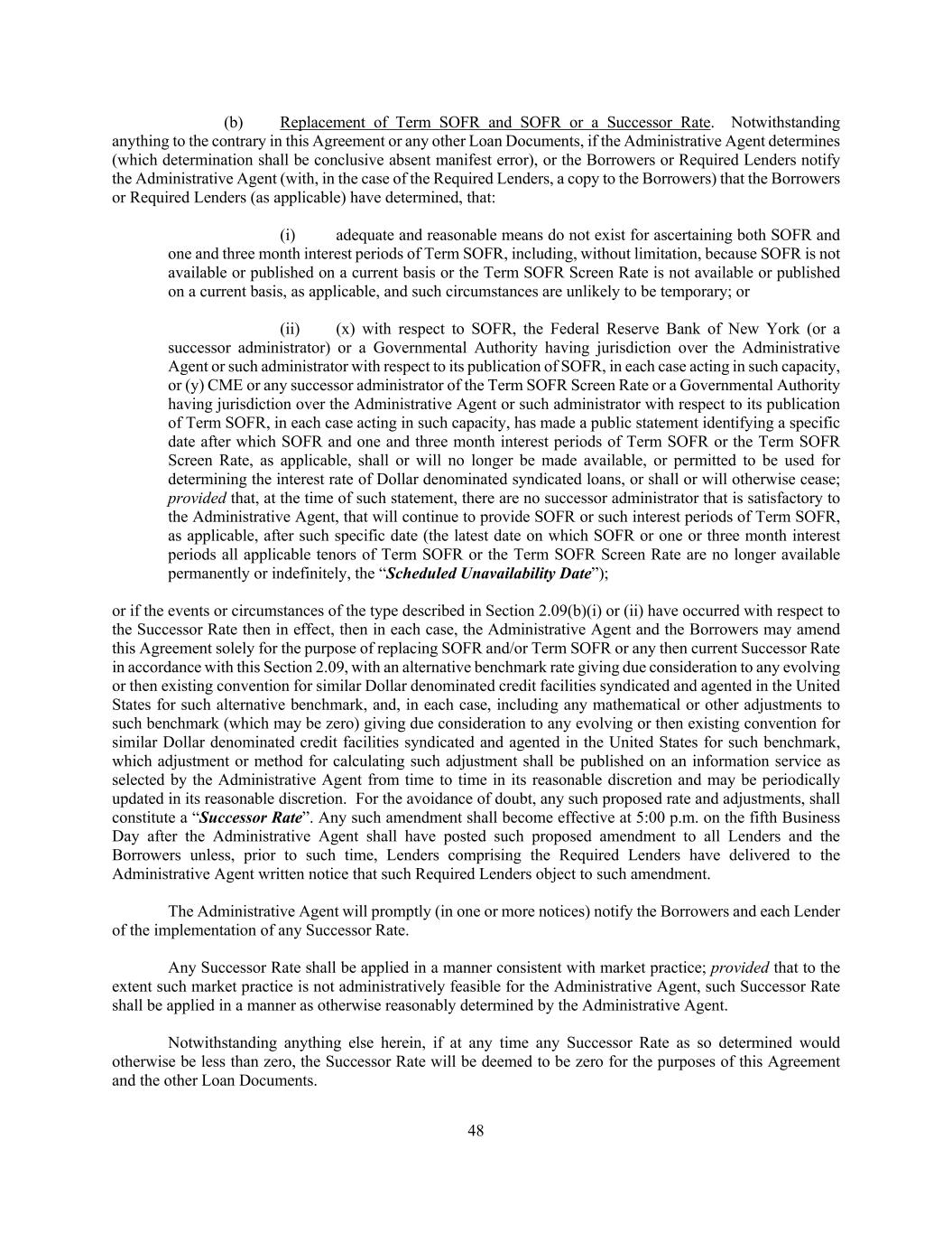 48 (b) Replacement of Term SOFR and SOFR or a Successor Rate. Notwithstanding anything to the contrary in this Agreement or any other Loan Documents, if the Administrative Agent determines (which determination shall be conclusive absent manifest error), or the Borrowers or Required Lenders notify the Administrative Agent (with, in the case of the Required Lenders, a copy to the Borrowers) that the Borrowers or Required Lenders (as applicable) have determined, that: (i) adequate and reasonable means do not exist for ascertaining both SOFR and one and three month interest periods of Term SOFR, including, without limitation, because SOFR is not available or published on a current basis or the Term SOFR Screen Rate is not available or published on a current basis, as applicable, and such circumstances are unlikely to be temporary; or (ii) (x) with respect to SOFR, the Federal Reserve Bank of New York (or a successor administrator) or a Governmental Authority having jurisdiction over the Administrative Agent or such administrator with respect to its publication of SOFR, in each case acting in such capacity, or (y) CME or any successor administrator of the Term SOFR Screen Rate or a Governmental Authority having jurisdiction over the Administrative Agent or such administrator with respect to its publication of Term SOFR, in each case acting in such capacity, has made a public statement identifying a specific date after which SOFR and one and three month interest periods of Term SOFR or the Term SOFR Screen Rate, as applicable, shall or will no longer be made available, or permitted to be used for determining the interest rate of Dollar denominated syndicated loans, or shall or will otherwise cease; provided that, at the time of such statement, there are no successor administrator that is satisfactory to the Administrative Agent, that will continue to provide SOFR or such interest periods of Term SOFR, as applicable, after such specific date (the latest date on which SOFR or one or three month interest periods all applicable tenors of Term SOFR or the Term SOFR Screen Rate are no longer available permanently or indefinitely, the “Scheduled Unavailability Date”); or if the events or circumstances of the type described in Section 2.09(b)(i) or (ii) have occurred with respect to the Successor Rate then in effect, then in each case, the Administrative Agent and the Borrowers may amend this Agreement solely for the purpose of replacing SOFR and/or Term SOFR or any then current Successor Rate in accordance with this Section 2.09, with an alternative benchmark rate giving due consideration to any evolving or then existing convention for similar Dollar denominated credit facilities syndicated and agented in the United States for such alternative benchmark, and, in each case, including any mathematical or other adjustments to such benchmark (which may be zero) giving due consideration to any evolving or then existing convention for similar Dollar denominated credit facilities syndicated and agented in the United States for such benchmark, which adjustment or method for calculating such adjustment shall be published on an information service as selected by the Administrative Agent from time to time in its reasonable discretion and may be periodically updated in its reasonable discretion. For the avoidance of doubt, any such proposed rate and adjustments, shall constitute a “Successor Rate”. Any such amendment shall become effective at 5:00 p.m. on the fifth Business Day after the Administrative Agent shall have posted such proposed amendment to all Lenders and the Borrowers unless, prior to such time, Lenders comprising the Required Lenders have delivered to the Administrative Agent written notice that such Required Lenders object to such amendment. The Administrative Agent will promptly (in one or more notices) notify the Borrowers and each Lender of the implementation of any Successor Rate. Any Successor Rate shall be applied in a manner consistent with market practice; provided that to the extent such market practice is not administratively feasible for the Administrative Agent, such Successor Rate shall be applied in a manner as otherwise reasonably determined by the Administrative Agent. Notwithstanding anything else herein, if at any time any Successor Rate as so determined would otherwise be less than zero, the Successor Rate will be deemed to be zero for the purposes of this Agreement and the other Loan Documents.