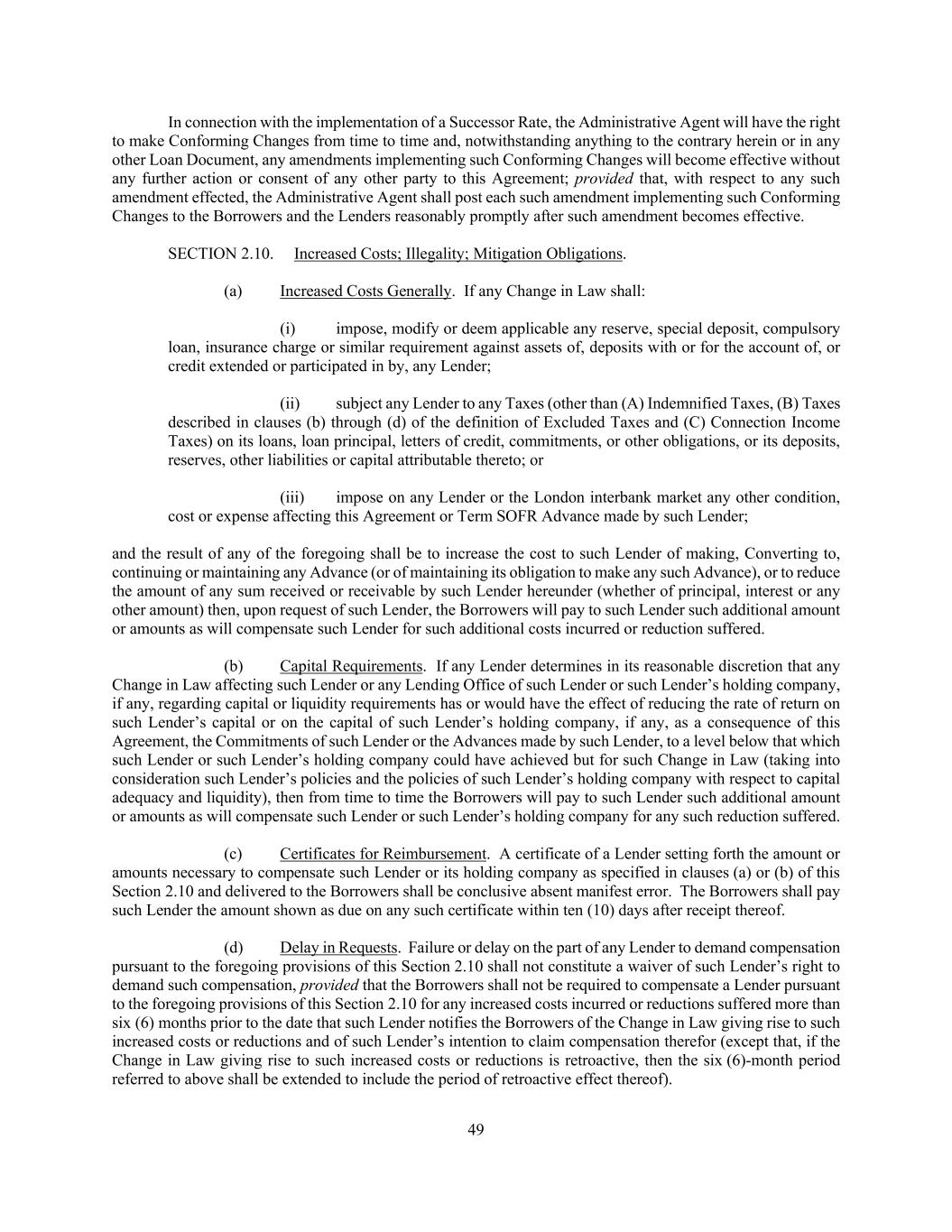 49 In connection with the implementation of a Successor Rate, the Administrative Agent will have the right to make Conforming Changes from time to time and, notwithstanding anything to the contrary herein or in any other Loan Document, any amendments implementing such Conforming Changes will become effective without any further action or consent of any other party to this Agreement; provided that, with respect to any such amendment effected, the Administrative Agent shall post each such amendment implementing such Conforming Changes to the Borrowers and the Lenders reasonably promptly after such amendment becomes effective. SECTION 2.10. Increased Costs; Illegality; Mitigation Obligations. (a) Increased Costs Generally. If any Change in Law shall: (i) impose, modify or deem applicable any reserve, special deposit, compulsory loan, insurance charge or similar requirement against assets of, deposits with or for the account of, or credit extended or participated in by, any Lender; (ii) subject any Lender to any Taxes (other than (A) Indemnified Taxes, (B) Taxes described in clauses (b) through (d) of the definition of Excluded Taxes and (C) Connection Income Taxes) on its loans, loan principal, letters of credit, commitments, or other obligations, or its deposits, reserves, other liabilities or capital attributable thereto; or (iii) impose on any Lender or the London interbank market any other condition, cost or expense affecting this Agreement or Term SOFR Advance made by such Lender; and the result of any of the foregoing shall be to increase the cost to such Lender of making, Converting to, continuing or maintaining any Advance (or of maintaining its obligation to make any such Advance), or to reduce the amount of any sum received or receivable by such Lender hereunder (whether of principal, interest or any other amount) then, upon request of such Lender, the Borrowers will pay to such Lender such additional amount or amounts as will compensate such Lender for such additional costs incurred or reduction suffered. (b) Capital Requirements. If any Lender determines in its reasonable discretion that any Change in Law affecting such Lender or any Lending Office of such Lender or such Lender’s holding company, if any, regarding capital or liquidity requirements has or would have the effect of reducing the rate of return on such Lender’s capital or on the capital of such Lender’s holding company, if any, as a consequence of this Agreement, the Commitments of such Lender or the Advances made by such Lender, to a level below that which such Lender or such Lender’s holding company could have achieved but for such Change in Law (taking into consideration such Lender’s policies and the policies of such Lender’s holding company with respect to capital adequacy and liquidity), then from time to time the Borrowers will pay to such Lender such additional amount or amounts as will compensate such Lender or such Lender’s holding company for any such reduction suffered. (c) Certificates for Reimbursement. A certificate of a Lender setting forth the amount or amounts necessary to compensate such Lender or its holding company as specified in clauses (a) or (b) of this Section 2.10 and delivered to the Borrowers shall be conclusive absent manifest error. The Borrowers shall pay such Lender the amount shown as due on any such certificate within ten (10) days after receipt thereof. (d) Delay in Requests. Failure or delay on the part of any Lender to demand compensation pursuant to the foregoing provisions of this Section 2.10 shall not constitute a waiver of such Lender’s right to demand such compensation, provided that the Borrowers shall not be required to compensate a Lender pursuant to the foregoing provisions of this Section 2.10 for any increased costs incurred or reductions suffered more than six (6) months prior to the date that such Lender notifies the Borrowers of the Change in Law giving rise to such increased costs or reductions and of such Lender’s intention to claim compensation therefor (except that, if the Change in Law giving rise to such increased costs or reductions is retroactive, then the six (6)-month period referred to above shall be extended to include the period of retroactive effect thereof).