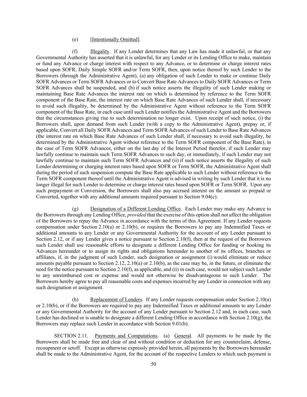 50 (e) [Intentionally Omitted]. (f) Illegality. If any Lender determines that any Law has made it unlawful, or that any Governmental Authority has asserted that it is unlawful, for any Lender or its Lending Office to make, maintain or fund any Advance or charge interest with respect to any Advance, or to determine or charge interest rates based upon SOFR, Daily Simple SOFR and/or Term SOFR, then, upon notice thereof by such Lender to the Borrowers (through the Administrative Agent), (a) any obligation of such Lender to make or continue Daily SOFR Advances or Term SOFR Advances or to Convert Base Rate Advances to Daily SOFR Advances or Term SOFR Advances shall be suspended, and (b) if such notice asserts the illegality of such Lender making or maintaining Base Rate Advances the interest rate on which is determined by reference to the Term SOFR component of the Base Rate, the interest rate on which Base Rate Advances of such Lender shall, if necessary to avoid such illegality, be determined by the Administrative Agent without reference to the Term SOFR component of the Base Rate, in each case until such Lender notifies the Administrative Agent and the Borrowers that the circumstances giving rise to such determination no longer exist. Upon receipt of such notice, (i) the Borrowers shall, upon demand from such Lender (with a copy to the Administrative Agent), prepay or, if applicable, Convert all Daily SOFR Advances and Term SOFR Advances of such Lender to Base Rate Advances (the interest rate on which Base Rate Advances of such Lender shall, if necessary to avoid such illegality, be determined by the Administrative Agent without reference to the Term SOFR component of the Base Rate), in the case of Term SOFR Advances, either on the last day of the Interest Period therefor, if such Lender may lawfully continue to maintain such Term SOFR Advances to such day, or immediately, if such Lender may not lawfully continue to maintain such Term SOFR Advances and (ii) if such notice asserts the illegality of such Lender determining or charging interest rates based upon SOFR or Term SOFR, the Administrative Agent shall during the period of such suspension compute the Base Rate applicable to such Lender without reference to the Term SOFR component thereof until the Administrative Agent is advised in writing by such Lender that it is no longer illegal for such Lender to determine or charge interest rates based upon SOFR or Term SOFR. Upon any such prepayment or Conversion, the Borrowers shall also pay accrued interest on the amount so prepaid or Converted, together with any additional amounts required pursuant to Section 9.04(c). (g) Designation of a Different Lending Office. Each Lender may make any Advance to the Borrowers through any Lending Office, provided that the exercise of this option shall not affect the obligation of the Borrowers to repay the Advance in accordance with the terms of this Agreement. If any Lender requests compensation under Section 2.10(a) or 2.10(b), or requires the Borrowers to pay any Indemnified Taxes or additional amounts to any Lender or any Governmental Authority for the account of any Lender pursuant to Section 2.12, or if any Lender gives a notice pursuant to Section 2.10(f), then at the request of the Borrowers such Lender shall use reasonable efforts to designate a different Lending Office for funding or booking its Advances hereunder or to assign its rights and obligations hereunder to another of its offices, branches or affiliates, if, in the judgment of such Lender, such designation or assignment (i) would eliminate or reduce amounts payable pursuant to Section 2.12, 2.10(a) or 2.10(b), as the case may be, in the future, or eliminate the need for the notice pursuant to Section 2.10(f), as applicable, and (ii) in each case, would not subject such Lender to any unreimbursed cost or expense and would not otherwise be disadvantageous to such Lender. The Borrowers hereby agree to pay all reasonable costs and expenses incurred by any Lender in connection with any such designation or assignment. (h) Replacement of Lenders. If any Lender requests compensation under Section 2.10(a) or 2.10(b), or if the Borrowers are required to pay any Indemnified Taxes or additional amounts to any Lender or any Governmental Authority for the account of any Lender pursuant to Section 2.12 and, in each case, such Lender has declined or is unable to designate a different Lending Office in accordance with Section 2.10(g), the Borrowers may replace such Lender in accordance with Section 9.01(b). SECTION 2.11. Payments and Computations. (a) General. All payments to be made by the Borrowers shall be made free and clear of and without condition or deduction for any counterclaim, defense, recoupment or setoff. Except as otherwise expressly provided herein, all payments by the Borrowers hereunder shall be made to the Administrative Agent, for the account of the respective Lenders to which such payment is