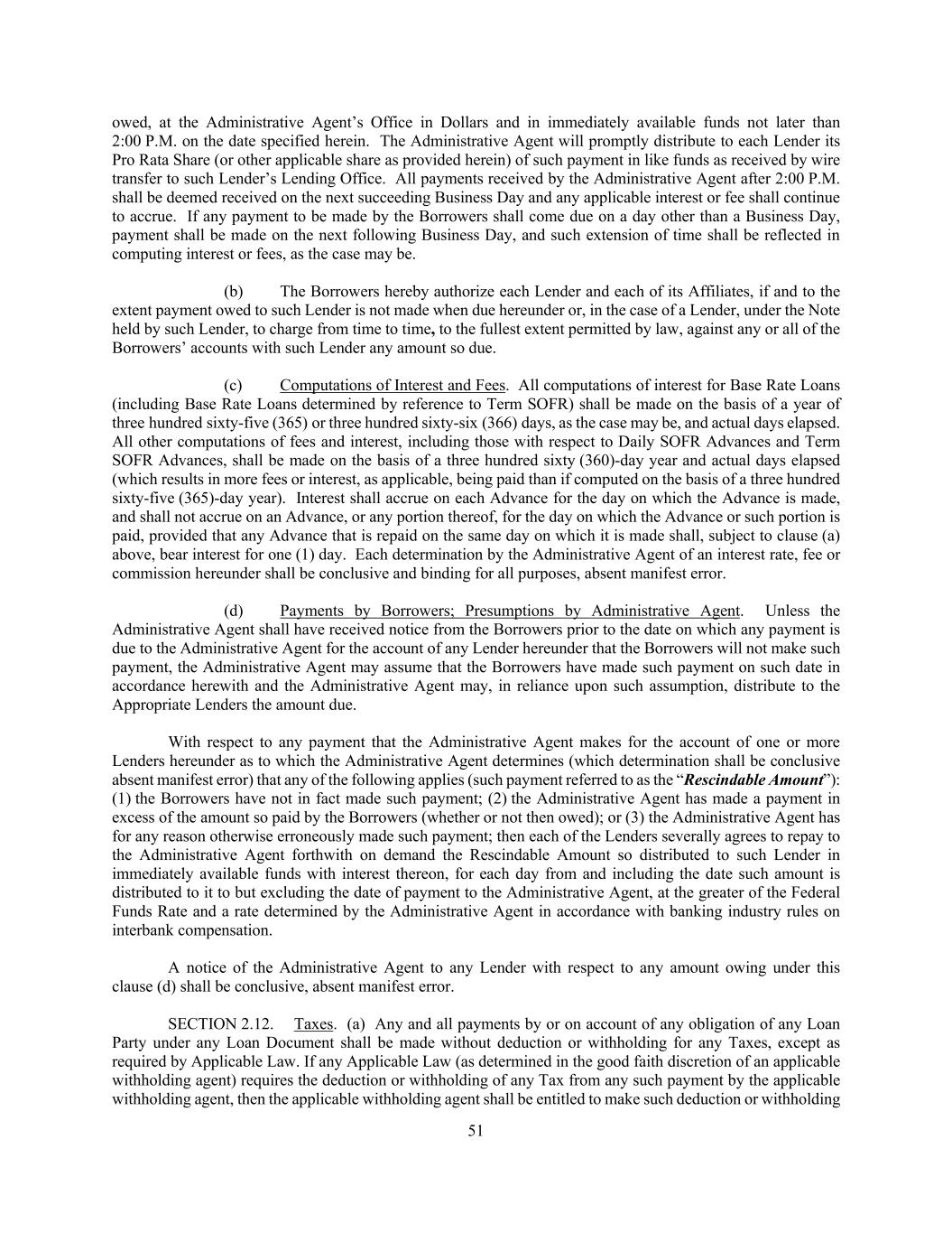 51 owed, at the Administrative Agent’s Office in Dollars and in immediately available funds not later than 2:00 P.M. on the date specified herein. The Administrative Agent will promptly distribute to each Lender its Pro Rata Share (or other applicable share as provided herein) of such payment in like funds as received by wire transfer to such Lender’s Lending Office. All payments received by the Administrative Agent after 2:00 P.M. shall be deemed received on the next succeeding Business Day and any applicable interest or fee shall continue to accrue. If any payment to be made by the Borrowers shall come due on a day other than a Business Day, payment shall be made on the next following Business Day, and such extension of time shall be reflected in computing interest or fees, as the case may be. (b) The Borrowers hereby authorize each Lender and each of its Affiliates, if and to the extent payment owed to such Lender is not made when due hereunder or, in the case of a Lender, under the Note held by such Lender, to charge from time to time, to the fullest extent permitted by law, against any or all of the Borrowers’ accounts with such Lender any amount so due. (c) Computations of Interest and Fees. All computations of interest for Base Rate Loans (including Base Rate Loans determined by reference to Term SOFR) shall be made on the basis of a year of three hundred sixty-five (365) or three hundred sixty-six (366) days, as the case may be, and actual days elapsed. All other computations of fees and interest, including those with respect to Daily SOFR Advances and Term SOFR Advances, shall be made on the basis of a three hundred sixty (360)-day year and actual days elapsed (which results in more fees or interest, as applicable, being paid than if computed on the basis of a three hundred sixty-five (365)-day year). Interest shall accrue on each Advance for the day on which the Advance is made, and shall not accrue on an Advance, or any portion thereof, for the day on which the Advance or such portion is paid, provided that any Advance that is repaid on the same day on which it is made shall, subject to clause (a) above, bear interest for one (1) day. Each determination by the Administrative Agent of an interest rate, fee or commission hereunder shall be conclusive and binding for all purposes, absent manifest error. (d) Payments by Borrowers; Presumptions by Administrative Agent. Unless the Administrative Agent shall have received notice from the Borrowers prior to the date on which any payment is due to the Administrative Agent for the account of any Lender hereunder that the Borrowers will not make such payment, the Administrative Agent may assume that the Borrowers have made such payment on such date in accordance herewith and the Administrative Agent may, in reliance upon such assumption, distribute to the Appropriate Lenders the amount due. With respect to any payment that the Administrative Agent makes for the account of one or more Lenders hereunder as to which the Administrative Agent determines (which determination shall be conclusive absent manifest error) that any of the following applies (such payment referred to as the “Rescindable Amount”): (1) the Borrowers have not in fact made such payment; (2) the Administrative Agent has made a payment in excess of the amount so paid by the Borrowers (whether or not then owed); or (3) the Administrative Agent has for any reason otherwise erroneously made such payment; then each of the Lenders severally agrees to repay to the Administrative Agent forthwith on demand the Rescindable Amount so distributed to such Lender in immediately available funds with interest thereon, for each day from and including the date such amount is distributed to it to but excluding the date of payment to the Administrative Agent, at the greater of the Federal Funds Rate and a rate determined by the Administrative Agent in accordance with banking industry rules on interbank compensation. A notice of the Administrative Agent to any Lender with respect to any amount owing under this clause (d) shall be conclusive, absent manifest error. SECTION 2.12. Taxes. (a) Any and all payments by or on account of any obligation of any Loan Party under any Loan Document shall be made without deduction or withholding for any Taxes, except as required by Applicable Law. If any Applicable Law (as determined in the good faith discretion of an applicable withholding agent) requires the deduction or withholding of any Tax from any such payment by the applicable withholding agent, then the applicable withholding agent shall be entitled to make such deduction or withholding