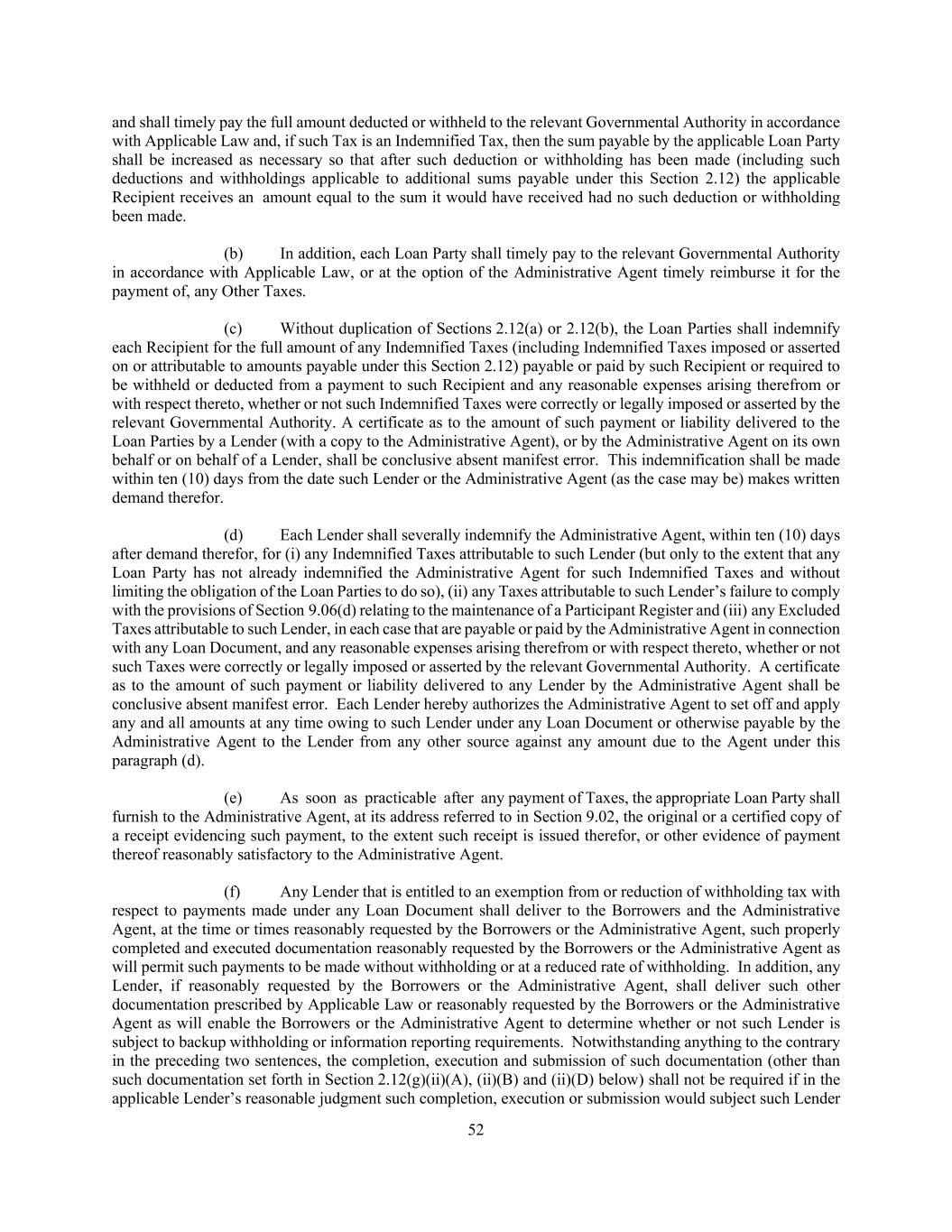 52 and shall timely pay the full amount deducted or withheld to the relevant Governmental Authority in accordance with Applicable Law and, if such Tax is an Indemnified Tax, then the sum payable by the applicable Loan Party shall be increased as necessary so that after such deduction or withholding has been made (including such deductions and withholdings applicable to additional sums payable under this Section 2.12) the applicable Recipient receives an amount equal to the sum it would have received had no such deduction or withholding been made. (b) In addition, each Loan Party shall timely pay to the relevant Governmental Authority in accordance with Applicable Law, or at the option of the Administrative Agent timely reimburse it for the payment of, any Other Taxes. (c) Without duplication of Sections 2.12(a) or 2.12(b), the Loan Parties shall indemnify each Recipient for the full amount of any Indemnified Taxes (including Indemnified Taxes imposed or asserted on or attributable to amounts payable under this Section 2.12) payable or paid by such Recipient or required to be withheld or deducted from a payment to such Recipient and any reasonable expenses arising therefrom or with respect thereto, whether or not such Indemnified Taxes were correctly or legally imposed or asserted by the relevant Governmental Authority. A certificate as to the amount of such payment or liability delivered to the Loan Parties by a Lender (with a copy to the Administrative Agent), or by the Administrative Agent on its own behalf or on behalf of a Lender, shall be conclusive absent manifest error. This indemnification shall be made within ten (10) days from the date such Lender or the Administrative Agent (as the case may be) makes written demand therefor. (d) Each Lender shall severally indemnify the Administrative Agent, within ten (10) days after demand therefor, for (i) any Indemnified Taxes attributable to such Lender (but only to the extent that any Loan Party has not already indemnified the Administrative Agent for such Indemnified Taxes and without limiting the obligation of the Loan Parties to do so), (ii) any Taxes attributable to such Lender’s failure to comply with the provisions of Section 9.06(d) relating to the maintenance of a Participant Register and (iii) any Excluded Taxes attributable to such Lender, in each case that are payable or paid by the Administrative Agent in connection with any Loan Document, and any reasonable expenses arising therefrom or with respect thereto, whether or not such Taxes were correctly or legally imposed or asserted by the relevant Governmental Authority. A certificate as to the amount of such payment or liability delivered to any Lender by the Administrative Agent shall be conclusive absent manifest error. Each Lender hereby authorizes the Administrative Agent to set off and apply any and all amounts at any time owing to such Lender under any Loan Document or otherwise payable by the Administrative Agent to the Lender from any other source against any amount due to the Agent under this paragraph (d). (e) As soon as practicable after any payment of Taxes, the appropriate Loan Party shall furnish to the Administrative Agent, at its address referred to in Section 9.02, the original or a certified copy of a receipt evidencing such payment, to the extent such receipt is issued therefor, or other evidence of payment thereof reasonably satisfactory to the Administrative Agent. (f) Any Lender that is entitled to an exemption from or reduction of withholding tax with respect to payments made under any Loan Document shall deliver to the Borrowers and the Administrative Agent, at the time or times reasonably requested by the Borrowers or the Administrative Agent, such properly completed and executed documentation reasonably requested by the Borrowers or the Administrative Agent as will permit such payments to be made without withholding or at a reduced rate of withholding. In addition, any Lender, if reasonably requested by the Borrowers or the Administrative Agent, shall deliver such other documentation prescribed by Applicable Law or reasonably requested by the Borrowers or the Administrative Agent as will enable the Borrowers or the Administrative Agent to determine whether or not such Lender is subject to backup withholding or information reporting requirements. Notwithstanding anything to the contrary in the preceding two sentences, the completion, execution and submission of such documentation (other than such documentation set forth in Section 2.12(g)(ii)(A), (ii)(B) and (ii)(D) below) shall not be required if in the applicable Lender’s reasonable judgment such completion, execution or submission would subject such Lender