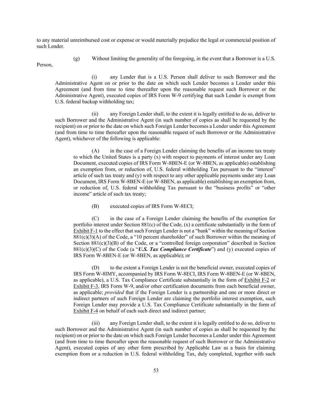 53 to any material unreimbursed cost or expense or would materially prejudice the legal or commercial position of such Lender. (g) Without limiting the generality of the foregoing, in the event that a Borrower is a U.S. Person, (i) any Lender that is a U.S. Person shall deliver to such Borrower and the Administrative Agent on or prior to the date on which such Lender becomes a Lender under this Agreement (and from time to time thereafter upon the reasonable request such Borrower or the Administrative Agent), executed copies of IRS Form W-9 certifying that such Lender is exempt from U.S. federal backup withholding tax; (ii) any Foreign Lender shall, to the extent it is legally entitled to do so, deliver to such Borrower and the Administrative Agent (in such number of copies as shall be requested by the recipient) on or prior to the date on which such Foreign Lender becomes a Lender under this Agreement (and from time to time thereafter upon the reasonable request of such Borrower or the Administrative Agent), whichever of the following is applicable: (A) in the case of a Foreign Lender claiming the benefits of an income tax treaty to which the United States is a party (x) with respect to payments of interest under any Loan Document, executed copies of IRS Form W-8BEN-E (or W-8BEN, as applicable) establishing an exemption from, or reduction of, U.S. federal withholding Tax pursuant to the “interest” article of such tax treaty and (y) with respect to any other applicable payments under any Loan Document, IRS Form W-8BEN-E (or W-8BEN, as applicable) establishing an exemption from, or reduction of, U.S. federal withholding Tax pursuant to the “business profits” or “other income” article of such tax treaty; (B) executed copies of IRS Form W-8ECI; (C) in the case of a Foreign Lender claiming the benefits of the exemption for portfolio interest under Section 881(c) of the Code, (x) a certificate substantially in the form of Exhibit F-1 to the effect that such Foreign Lender is not a “bank” within the meaning of Section 881(c)(3)(A) of the Code, a “10 percent shareholder” of such Borrower within the meaning of Section 881(c)(3)(B) of the Code, or a “controlled foreign corporation” described in Section 881(c)(3)(C) of the Code (a “U.S. Tax Compliance Certificate”) and (y) executed copies of IRS Form W-8BEN-E (or W-8BEN, as applicable); or (D) to the extent a Foreign Lender is not the beneficial owner, executed copies of IRS Form W-8IMY, accompanied by IRS Form W-8ECI, IRS Form W-8BEN-E (or W-8BEN, as applicable), a U.S. Tax Compliance Certificate substantially in the form of Exhibit F-2 or Exhibit F-3, IRS Form W-9, and/or other certification documents from each beneficial owner, as applicable; provided that if the Foreign Lender is a partnership and one or more direct or indirect partners of such Foreign Lender are claiming the portfolio interest exemption, such Foreign Lender may provide a U.S. Tax Compliance Certificate substantially in the form of Exhibit F-4 on behalf of each such direct and indirect partner; (iii) any Foreign Lender shall, to the extent it is legally entitled to do so, deliver to such Borrower and the Administrative Agent (in such number of copies as shall be requested by the recipient) on or prior to the date on which such Foreign Lender becomes a Lender under this Agreement (and from time to time thereafter upon the reasonable request of such Borrower or the Administrative Agent), executed copies of any other form prescribed by Applicable Law as a basis for claiming exemption from or a reduction in U.S. federal withholding Tax, duly completed, together with such