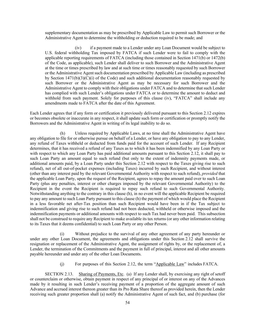 54 supplementary documentation as may be prescribed by Applicable Law to permit such Borrower or the Administrative Agent to determine the withholding or deduction required to be made; and (iv) if a payment made to a Lender under any Loan Document would be subject to U.S. federal withholding Tax imposed by FATCA if such Lender were to fail to comply with the applicable reporting requirements of FATCA (including those contained in Section 1471(b) or 1472(b) of the Code, as applicable), such Lender shall deliver to such Borrower and the Administrative Agent at the time or times prescribed by law and at such time or times reasonably requested by such Borrower or the Administrative Agent such documentation prescribed by Applicable Law (including as prescribed by Section 1471(b)(3)(C)(i) of the Code) and such additional documentation reasonably requested by such Borrower or the Administrative Agent as may be necessary for such Borrower and the Administrative Agent to comply with their obligations under FATCA and to determine that such Lender has complied with such Lender’s obligations under FATCA or to determine the amount to deduct and withhold from such payment. Solely for purposes of this clause (iv), “FATCA” shall include any amendments made to FATCA after the date of this Agreement. Each Lender agrees that if any form or certification it previously delivered pursuant to this Section 2.12 expires or becomes obsolete or inaccurate in any respect, it shall update such form or certification or promptly notify the Borrowers and the Administrative Agent in writing of its legal inability to do so. (h) Unless required by Applicable Laws, at no time shall the Administrative Agent have any obligation to file for or otherwise pursue on behalf of a Lender, or have any obligation to pay to any Lender, any refund of Taxes withheld or deducted from funds paid for the account of such Lender. If any Recipient determines, that it has received a refund of any Taxes as to which it has been indemnified by any Loan Party or with respect to which any Loan Party has paid additional amounts pursuant to this Section 2.12, it shall pay to such Loan Party an amount equal to such refund (but only to the extent of indemnity payments made, or additional amounts paid, by a Loan Party under this Section 2.12 with respect to the Taxes giving rise to such refund), net of all out-of-pocket expenses (including Taxes) incurred by such Recipient, and without interest (other than any interest paid by the relevant Governmental Authority with respect to such refund), provided that the applicable Loan Party, upon the request of the Recipient, agrees to repay the amount paid over to such Loan Party (plus any penalties, interest or other charges imposed by the relevant Governmental Authority) to the Recipient in the event the Recipient is required to repay such refund to such Governmental Authority. Notwithstanding anything to the contrary in this clause (h), in no event will the applicable Recipient be required to pay any amount to such Loan Party pursuant to this clause (h) the payment of which would place the Recipient in a less favorable net after-Tax position than such Recipient would have been in if the Tax subject to indemnification and giving rise to such refund had not been deducted, withheld or otherwise imposed and the indemnification payments or additional amounts with respect to such Tax had never been paid. This subsection shall not be construed to require any Recipient to make available its tax returns (or any other information relating to its Taxes that it deems confidential) to such Loan Party or any other Person. (i) Without prejudice to the survival of any other agreement of any party hereunder or under any other Loan Document, the agreements and obligations under this Section 2.12 shall survive the resignation or replacement of the Administrative Agent, the assignment of rights by, or the replacement of, a Lender, the termination of the Commitments and the payment in full of principal, interest and all other amounts payable hereunder and under any of the other Loan Documents. (j) For purposes of this Section 2.12, the term “Applicable Law” includes FATCA. SECTION 2.13. Sharing of Payments, Etc. (a) If any Lender shall, by exercising any right of setoff or counterclaim or otherwise, obtain payment in respect of any principal of or interest on any of the Advances made by it resulting in such Lender’s receiving payment of a proportion of the aggregate amount of such Advance and accrued interest thereon greater than its Pro Rata Share thereof as provided herein, then the Lender receiving such greater proportion shall (a) notify the Administrative Agent of such fact, and (b) purchase (for
