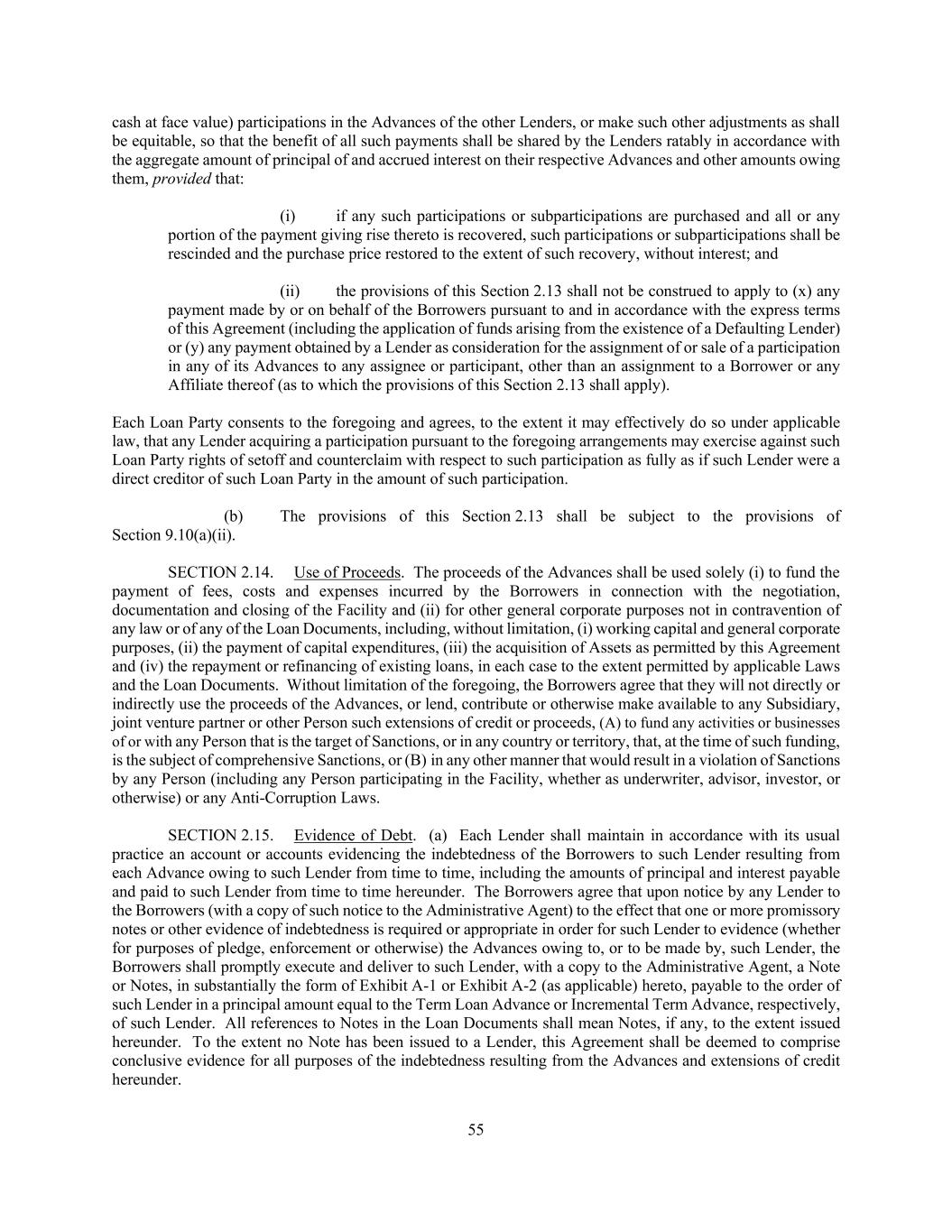 55 cash at face value) participations in the Advances of the other Lenders, or make such other adjustments as shall be equitable, so that the benefit of all such payments shall be shared by the Lenders ratably in accordance with the aggregate amount of principal of and accrued interest on their respective Advances and other amounts owing them, provided that: (i) if any such participations or subparticipations are purchased and all or any portion of the payment giving rise thereto is recovered, such participations or subparticipations shall be rescinded and the purchase price restored to the extent of such recovery, without interest; and (ii) the provisions of this Section 2.13 shall not be construed to apply to (x) any payment made by or on behalf of the Borrowers pursuant to and in accordance with the express terms of this Agreement (including the application of funds arising from the existence of a Defaulting Lender) or (y) any payment obtained by a Lender as consideration for the assignment of or sale of a participation in any of its Advances to any assignee or participant, other than an assignment to a Borrower or any Affiliate thereof (as to which the provisions of this Section 2.13 shall apply). Each Loan Party consents to the foregoing and agrees, to the extent it may effectively do so under applicable law, that any Lender acquiring a participation pursuant to the foregoing arrangements may exercise against such Loan Party rights of setoff and counterclaim with respect to such participation as fully as if such Lender were a direct creditor of such Loan Party in the amount of such participation. (b) The provisions of this Section 2.13 shall be subject to the provisions of Section 9.10(a)(ii). SECTION 2.14. Use of Proceeds. The proceeds of the Advances shall be used solely (i) to fund the payment of fees, costs and expenses incurred by the Borrowers in connection with the negotiation, documentation and closing of the Facility and (ii) for other general corporate purposes not in contravention of any law or of any of the Loan Documents, including, without limitation, (i) working capital and general corporate purposes, (ii) the payment of capital expenditures, (iii) the acquisition of Assets as permitted by this Agreement and (iv) the repayment or refinancing of existing loans, in each case to the extent permitted by applicable Laws and the Loan Documents. Without limitation of the foregoing, the Borrowers agree that they will not directly or indirectly use the proceeds of the Advances, or lend, contribute or otherwise make available to any Subsidiary, joint venture partner or other Person such extensions of credit or proceeds, (A) to fund any activities or businesses of or with any Person that is the target of Sanctions, or in any country or territory, that, at the time of such funding, is the subject of comprehensive Sanctions, or (B) in any other manner that would result in a violation of Sanctions by any Person (including any Person participating in the Facility, whether as underwriter, advisor, investor, or otherwise) or any Anti-Corruption Laws. SECTION 2.15. Evidence of Debt. (a) Each Lender shall maintain in accordance with its usual practice an account or accounts evidencing the indebtedness of the Borrowers to such Lender resulting from each Advance owing to such Lender from time to time, including the amounts of principal and interest payable and paid to such Lender from time to time hereunder. The Borrowers agree that upon notice by any Lender to the Borrowers (with a copy of such notice to the Administrative Agent) to the effect that one or more promissory notes or other evidence of indebtedness is required or appropriate in order for such Lender to evidence (whether for purposes of pledge, enforcement or otherwise) the Advances owing to, or to be made by, such Lender, the Borrowers shall promptly execute and deliver to such Lender, with a copy to the Administrative Agent, a Note or Notes, in substantially the form of Exhibit A-1 or Exhibit A-2 (as applicable) hereto, payable to the order of such Lender in a principal amount equal to the Term Loan Advance or Incremental Term Advance, respectively, of such Lender. All references to Notes in the Loan Documents shall mean Notes, if any, to the extent issued hereunder. To the extent no Note has been issued to a Lender, this Agreement shall be deemed to comprise conclusive evidence for all purposes of the indebtedness resulting from the Advances and extensions of credit hereunder.