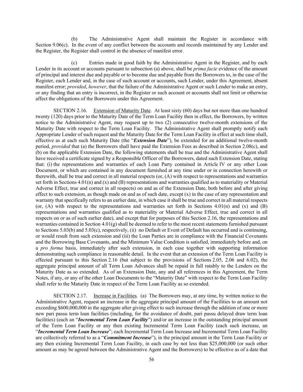56 (b) The Administrative Agent shall maintain the Register in accordance with Section 9.06(c). In the event of any conflict between the accounts and records maintained by any Lender and the Register, the Register shall control in the absence of manifest error. (c) Entries made in good faith by the Administrative Agent in the Register, and by each Lender in its account or accounts pursuant to subsection (a) above, shall be prima facie evidence of the amount of principal and interest due and payable or to become due and payable from the Borrowers to, in the case of the Register, each Lender and, in the case of such account or accounts, such Lender, under this Agreement, absent manifest error; provided, however, that the failure of the Administrative Agent or such Lender to make an entry, or any finding that an entry is incorrect, in the Register or such account or accounts shall not limit or otherwise affect the obligations of the Borrowers under this Agreement. SECTION 2.16. Extension of Maturity Date. At least sixty (60) days but not more than one hundred twenty (120) days prior to the Maturity Date of the Term Loan Facility then in effect, the Borrowers, by written notice to the Administrative Agent, may request up to two (2) consecutive twelve-month extensions of the Maturity Date with respect to the Term Loan Facility. The Administrative Agent shall promptly notify each Appropriate Lender of such request and the Maturity Date for the Term Loan Facility in effect at such time shall, effective as at each such Maturity Date (the “Extension Date”), be extended for an additional twelve-month period, provided that (a) the Borrowers shall have paid the Extension Fees as described in Section 2.08(c), and (b) on the applicable Extension Date, the following statements shall be true and the Administrative Agent shall have received a certificate signed by a Responsible Officer of the Borrowers, dated such Extension Date, stating that: (i) the representations and warranties of each Loan Party contained in Article IV or any other Loan Document, or which are contained in any document furnished at any time under or in connection herewith or therewith, shall be true and correct in all material respects (or, (A) with respect to representations and warranties set forth in Sections 4.01(n) and (x) and (B) representations and warranties qualified as to materiality or Material Adverse Effect, true and correct in all respects) on and as of the Extension Date, both before and after giving effect to such extension, as though made on and as of such date, except (x) in the case of any representation and warranty that specifically refers to an earlier date, in which case it shall be true and correct in all material respects (or, (A) with respect to the representations and warranties set forth in Sections 4.01(n) and (x) and (B) representations and warranties qualified as to materiality or Material Adverse Effect, true and correct in all respects on or as of such earlier date), and except that for purposes of this Section 2.16, the representations and warranties contained in Section 4.01(g) shall be deemed to refer to the most recent statements furnished pursuant to Sections 5.03(b) and 5.03(c), respectively, (ii) no Default or Event of Default has occurred and is continuing, or would result from such extension and (iii) the Loan Parties are in compliance with the Financial Covenants and the Borrowing Base Covenants, and the Minimum Value Condition is satisfied, immediately before and, on a pro forma basis, immediately after such extension, in each case together with supporting information demonstrating such compliance in reasonable detail. In the event that an extension of the Term Loan Facility is effected pursuant to this Section 2.16 (but subject to the provisions of Sections 2.05, 2.06 and 6.02), the aggregate principal amount of all Term Loan Advances shall be repaid in full ratably to the Lenders on the Maturity Date as so extended. As of an Extension Date, any and all references in this Agreement, the Term Notes, if any, or any of the other Loan Documents to the “Maturity Date” with respect to the Term Loan Facility shall refer to the Maturity Date in respect of the Term Loan Facility as so extended. SECTION 2.17. Increase in Facilities. (a) The Borrowers may, at any time, by written notice to the Administrative Agent, request an increase in the aggregate principal amount of the Facilities to an amount not exceeding $600,000,000 in the aggregate after giving effect to such increase through the addition of one or more new pari passu term loan facilities (including, for the avoidance of doubt, pari passu delayed draw term loan facilities) (each an “Incremental Term Loan Facility”) and/or an increase in the outstanding principal amount of the Term Loan Facility or any then existing Incremental Term Loan Facility (each such increase, an “Incremental Term Loan Increase”; each Incremental Term Loan Increase and Incremental Term Loan Facility are collectively referred to as a “Commitment Increase”), in the principal amount in the Term Loan Facility or any then existing Incremental Term Loan Facility, in each case by not less than $25,000,000 (or such other amount as may be agreed between the Administrative Agent and the Borrowers) to be effective as of a date that