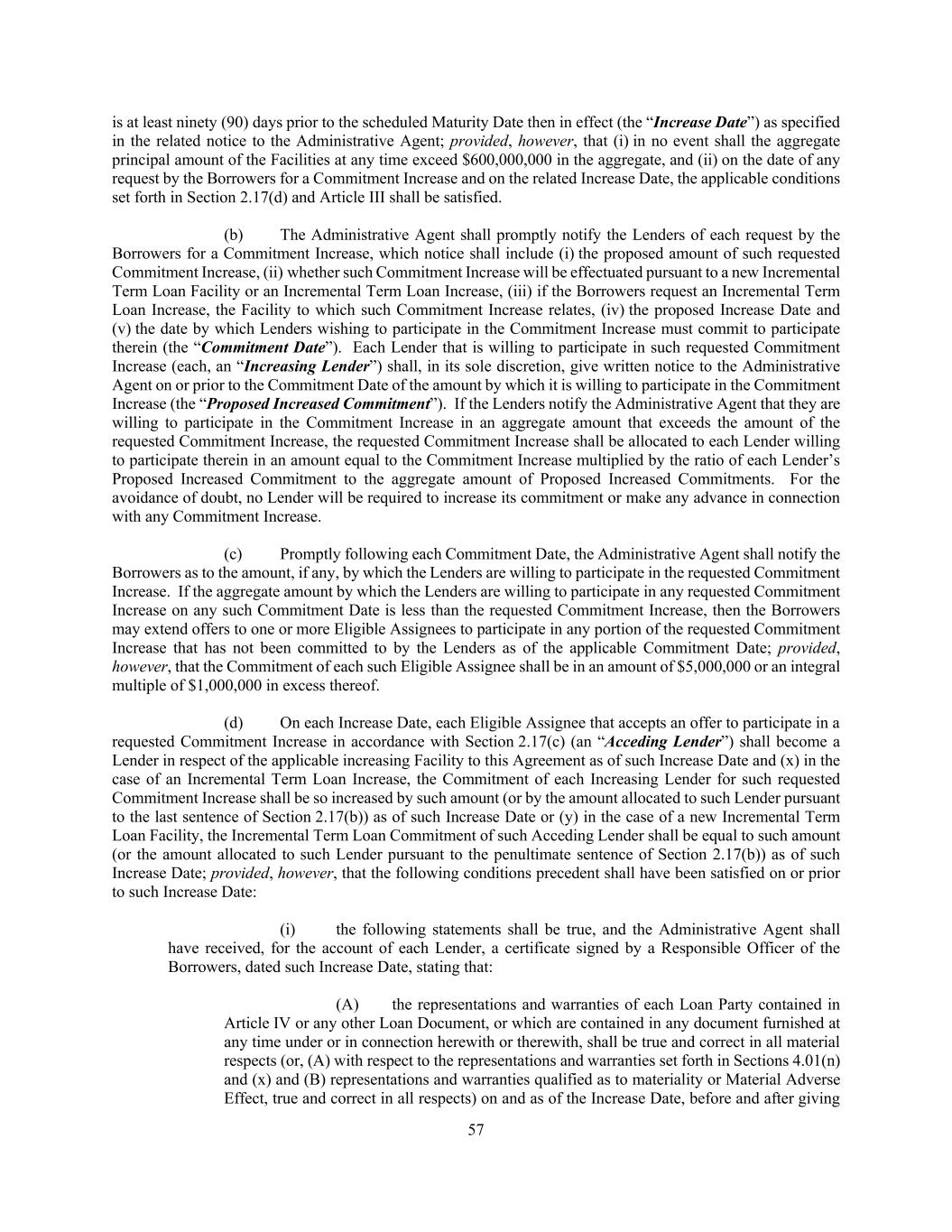 57 is at least ninety (90) days prior to the scheduled Maturity Date then in effect (the “Increase Date”) as specified in the related notice to the Administrative Agent; provided, however, that (i) in no event shall the aggregate principal amount of the Facilities at any time exceed $600,000,000 in the aggregate, and (ii) on the date of any request by the Borrowers for a Commitment Increase and on the related Increase Date, the applicable conditions set forth in Section 2.17(d) and Article III shall be satisfied. (b) The Administrative Agent shall promptly notify the Lenders of each request by the Borrowers for a Commitment Increase, which notice shall include (i) the proposed amount of such requested Commitment Increase, (ii) whether such Commitment Increase will be effectuated pursuant to a new Incremental Term Loan Facility or an Incremental Term Loan Increase, (iii) if the Borrowers request an Incremental Term Loan Increase, the Facility to which such Commitment Increase relates, (iv) the proposed Increase Date and (v) the date by which Lenders wishing to participate in the Commitment Increase must commit to participate therein (the “Commitment Date”). Each Lender that is willing to participate in such requested Commitment Increase (each, an “Increasing Lender”) shall, in its sole discretion, give written notice to the Administrative Agent on or prior to the Commitment Date of the amount by which it is willing to participate in the Commitment Increase (the “Proposed Increased Commitment”). If the Lenders notify the Administrative Agent that they are willing to participate in the Commitment Increase in an aggregate amount that exceeds the amount of the requested Commitment Increase, the requested Commitment Increase shall be allocated to each Lender willing to participate therein in an amount equal to the Commitment Increase multiplied by the ratio of each Lender’s Proposed Increased Commitment to the aggregate amount of Proposed Increased Commitments. For the avoidance of doubt, no Lender will be required to increase its commitment or make any advance in connection with any Commitment Increase. (c) Promptly following each Commitment Date, the Administrative Agent shall notify the Borrowers as to the amount, if any, by which the Lenders are willing to participate in the requested Commitment Increase. If the aggregate amount by which the Lenders are willing to participate in any requested Commitment Increase on any such Commitment Date is less than the requested Commitment Increase, then the Borrowers may extend offers to one or more Eligible Assignees to participate in any portion of the requested Commitment Increase that has not been committed to by the Lenders as of the applicable Commitment Date; provided, however, that the Commitment of each such Eligible Assignee shall be in an amount of $5,000,000 or an integral multiple of $1,000,000 in excess thereof. (d) On each Increase Date, each Eligible Assignee that accepts an offer to participate in a requested Commitment Increase in accordance with Section 2.17(c) (an “Acceding Lender”) shall become a Lender in respect of the applicable increasing Facility to this Agreement as of such Increase Date and (x) in the case of an Incremental Term Loan Increase, the Commitment of each Increasing Lender for such requested Commitment Increase shall be so increased by such amount (or by the amount allocated to such Lender pursuant to the last sentence of Section 2.17(b)) as of such Increase Date or (y) in the case of a new Incremental Term Loan Facility, the Incremental Term Loan Commitment of such Acceding Lender shall be equal to such amount (or the amount allocated to such Lender pursuant to the penultimate sentence of Section 2.17(b)) as of such Increase Date; provided, however, that the following conditions precedent shall have been satisfied on or prior to such Increase Date: (i) the following statements shall be true, and the Administrative Agent shall have received, for the account of each Lender, a certificate signed by a Responsible Officer of the Borrowers, dated such Increase Date, stating that: (A) the representations and warranties of each Loan Party contained in Article IV or any other Loan Document, or which are contained in any document furnished at any time under or in connection herewith or therewith, shall be true and correct in all material respects (or, (A) with respect to the representations and warranties set forth in Sections 4.01(n) and (x) and (B) representations and warranties qualified as to materiality or Material Adverse Effect, true and correct in all respects) on and as of the Increase Date, before and after giving