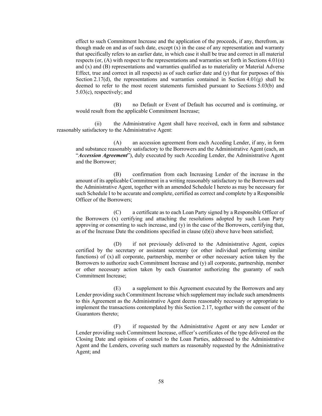 58 effect to such Commitment Increase and the application of the proceeds, if any, therefrom, as though made on and as of such date, except (x) in the case of any representation and warranty that specifically refers to an earlier date, in which case it shall be true and correct in all material respects (or, (A) with respect to the representations and warranties set forth in Sections 4.01(n) and (x) and (B) representations and warranties qualified as to materiality or Material Adverse Effect, true and correct in all respects) as of such earlier date and (y) that for purposes of this Section 2.17(d), the representations and warranties contained in Section 4.01(g) shall be deemed to refer to the most recent statements furnished pursuant to Sections 5.03(b) and 5.03(c), respectively; and (B) no Default or Event of Default has occurred and is continuing, or would result from the applicable Commitment Increase; (ii) the Administrative Agent shall have received, each in form and substance reasonably satisfactory to the Administrative Agent: (A) an accession agreement from each Acceding Lender, if any, in form and substance reasonably satisfactory to the Borrowers and the Administrative Agent (each, an “Accession Agreement”), duly executed by such Acceding Lender, the Administrative Agent and the Borrower; (B) confirmation from each Increasing Lender of the increase in the amount of its applicable Commitment in a writing reasonably satisfactory to the Borrowers and the Administrative Agent, together with an amended Schedule I hereto as may be necessary for such Schedule I to be accurate and complete, certified as correct and complete by a Responsible Officer of the Borrowers; (C) a certificate as to each Loan Party signed by a Responsible Officer of the Borrowers (x) certifying and attaching the resolutions adopted by such Loan Party approving or consenting to such increase, and (y) in the case of the Borrowers, certifying that, as of the Increase Date the conditions specified in clause (d)(i) above have been satisfied; (D) if not previously delivered to the Administrative Agent, copies certified by the secretary or assistant secretary (or other individual performing similar functions) of (x) all corporate, partnership, member or other necessary action taken by the Borrowers to authorize such Commitment Increase and (y) all corporate, partnership, member or other necessary action taken by each Guarantor authorizing the guaranty of such Commitment Increase; (E) a supplement to this Agreement executed by the Borrowers and any Lender providing such Commitment Increase which supplement may include such amendments to this Agreement as the Administrative Agent deems reasonably necessary or appropriate to implement the transactions contemplated by this Section 2.17, together with the consent of the Guarantors thereto; (F) if requested by the Administrative Agent or any new Lender or Lender providing such Commitment Increase, officer’s certificates of the type delivered on the Closing Date and opinions of counsel to the Loan Parties, addressed to the Administrative Agent and the Lenders, covering such matters as reasonably requested by the Administrative Agent; and