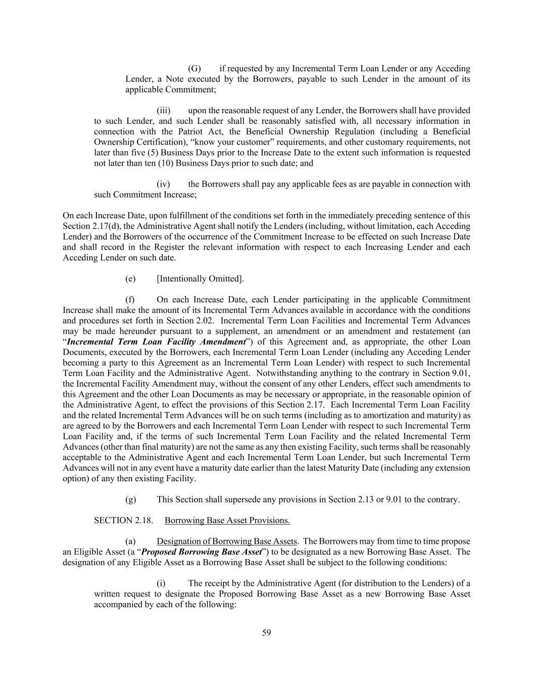59 (G) if requested by any Incremental Term Loan Lender or any Acceding Lender, a Note executed by the Borrowers, payable to such Lender in the amount of its applicable Commitment; (iii) upon the reasonable request of any Lender, the Borrowers shall have provided to such Lender, and such Lender shall be reasonably satisfied with, all necessary information in connection with the Patriot Act, the Beneficial Ownership Regulation (including a Beneficial Ownership Certification), “know your customer” requirements, and other customary requirements, not later than five (5) Business Days prior to the Increase Date to the extent such information is requested not later than ten (10) Business Days prior to such date; and (iv) the Borrowers shall pay any applicable fees as are payable in connection with such Commitment Increase; On each Increase Date, upon fulfillment of the conditions set forth in the immediately preceding sentence of this Section 2.17(d), the Administrative Agent shall notify the Lenders (including, without limitation, each Acceding Lender) and the Borrowers of the occurrence of the Commitment Increase to be effected on such Increase Date and shall record in the Register the relevant information with respect to each Increasing Lender and each Acceding Lender on such date. (e) [Intentionally Omitted]. (f) On each Increase Date, each Lender participating in the applicable Commitment Increase shall make the amount of its Incremental Term Advances available in accordance with the conditions and procedures set forth in Section 2.02. Incremental Term Loan Facilities and Incremental Term Advances may be made hereunder pursuant to a supplement, an amendment or an amendment and restatement (an “Incremental Term Loan Facility Amendment”) of this Agreement and, as appropriate, the other Loan Documents, executed by the Borrowers, each Incremental Term Loan Lender (including any Acceding Lender becoming a party to this Agreement as an Incremental Term Loan Lender) with respect to such Incremental Term Loan Facility and the Administrative Agent. Notwithstanding anything to the contrary in Section 9.01, the Incremental Facility Amendment may, without the consent of any other Lenders, effect such amendments to this Agreement and the other Loan Documents as may be necessary or appropriate, in the reasonable opinion of the Administrative Agent, to effect the provisions of this Section 2.17. Each Incremental Term Loan Facility and the related Incremental Term Advances will be on such terms (including as to amortization and maturity) as are agreed to by the Borrowers and each Incremental Term Loan Lender with respect to such Incremental Term Loan Facility and, if the terms of such Incremental Term Loan Facility and the related Incremental Term Advances (other than final maturity) are not the same as any then existing Facility, such terms shall be reasonably acceptable to the Administrative Agent and each Incremental Term Loan Lender, but such Incremental Term Advances will not in any event have a maturity date earlier than the latest Maturity Date (including any extension option) of any then existing Facility. (g) This Section shall supersede any provisions in Section 2.13 or 9.01 to the contrary. SECTION 2.18. Borrowing Base Asset Provisions. (a) Designation of Borrowing Base Assets. The Borrowers may from time to time propose an Eligible Asset (a “Proposed Borrowing Base Asset”) to be designated as a new Borrowing Base Asset. The designation of any Eligible Asset as a Borrowing Base Asset shall be subject to the following conditions: (i) The receipt by the Administrative Agent (for distribution to the Lenders) of a written request to designate the Proposed Borrowing Base Asset as a new Borrowing Base Asset accompanied by each of the following: