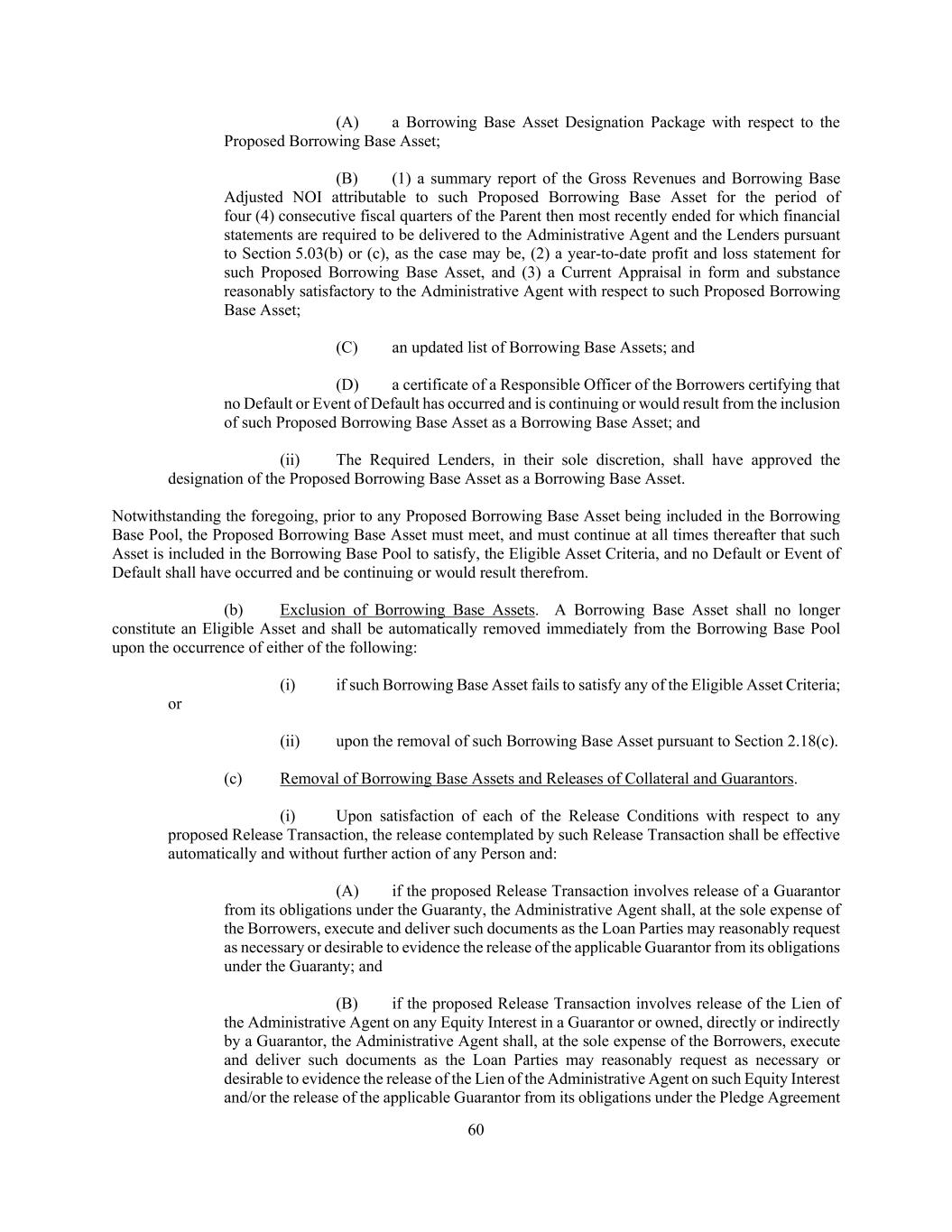 60 (A) a Borrowing Base Asset Designation Package with respect to the Proposed Borrowing Base Asset; (B) (1) a summary report of the Gross Revenues and Borrowing Base Adjusted NOI attributable to such Proposed Borrowing Base Asset for the period of four (4) consecutive fiscal quarters of the Parent then most recently ended for which financial statements are required to be delivered to the Administrative Agent and the Lenders pursuant to Section 5.03(b) or (c), as the case may be, (2) a year-to-date profit and loss statement for such Proposed Borrowing Base Asset, and (3) a Current Appraisal in form and substance reasonably satisfactory to the Administrative Agent with respect to such Proposed Borrowing Base Asset; (C) an updated list of Borrowing Base Assets; and (D) a certificate of a Responsible Officer of the Borrowers certifying that no Default or Event of Default has occurred and is continuing or would result from the inclusion of such Proposed Borrowing Base Asset as a Borrowing Base Asset; and (ii) The Required Lenders, in their sole discretion, shall have approved the designation of the Proposed Borrowing Base Asset as a Borrowing Base Asset. Notwithstanding the foregoing, prior to any Proposed Borrowing Base Asset being included in the Borrowing Base Pool, the Proposed Borrowing Base Asset must meet, and must continue at all times thereafter that such Asset is included in the Borrowing Base Pool to satisfy, the Eligible Asset Criteria, and no Default or Event of Default shall have occurred and be continuing or would result therefrom. (b) Exclusion of Borrowing Base Assets. A Borrowing Base Asset shall no longer constitute an Eligible Asset and shall be automatically removed immediately from the Borrowing Base Pool upon the occurrence of either of the following: (i) if such Borrowing Base Asset fails to satisfy any of the Eligible Asset Criteria; or (ii) upon the removal of such Borrowing Base Asset pursuant to Section 2.18(c). (c) Removal of Borrowing Base Assets and Releases of Collateral and Guarantors. (i) Upon satisfaction of each of the Release Conditions with respect to any proposed Release Transaction, the release contemplated by such Release Transaction shall be effective automatically and without further action of any Person and: (A) if the proposed Release Transaction involves release of a Guarantor from its obligations under the Guaranty, the Administrative Agent shall, at the sole expense of the Borrowers, execute and deliver such documents as the Loan Parties may reasonably request as necessary or desirable to evidence the release of the applicable Guarantor from its obligations under the Guaranty; and (B) if the proposed Release Transaction involves release of the Lien of the Administrative Agent on any Equity Interest in a Guarantor or owned, directly or indirectly by a Guarantor, the Administrative Agent shall, at the sole expense of the Borrowers, execute and deliver such documents as the Loan Parties may reasonably request as necessary or desirable to evidence the release of the Lien of the Administrative Agent on such Equity Interest and/or the release of the applicable Guarantor from its obligations under the Pledge Agreement
