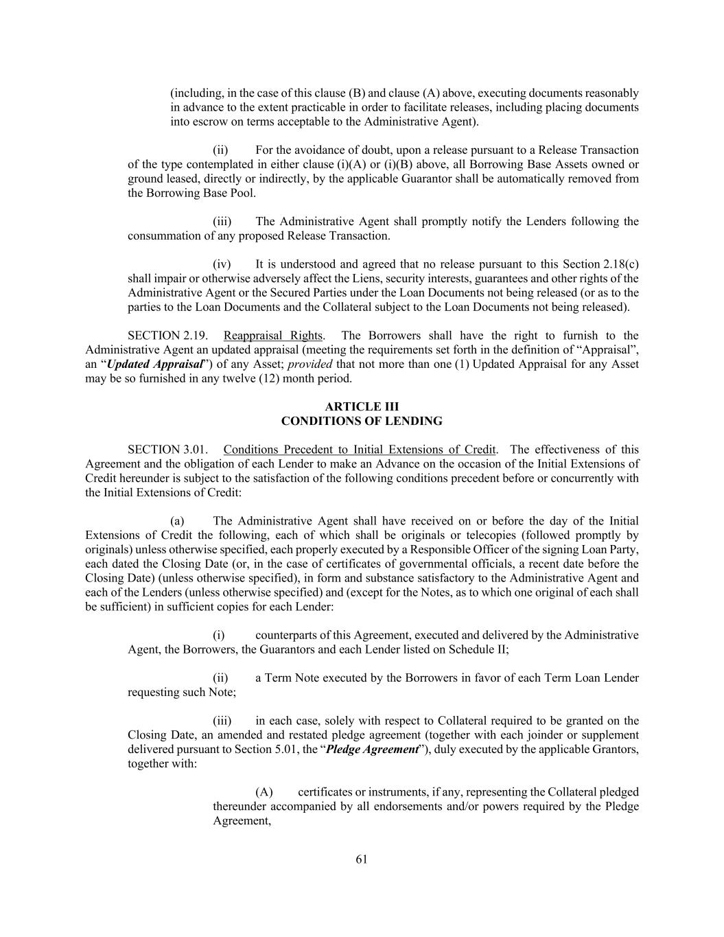 61 (including, in the case of this clause (B) and clause (A) above, executing documents reasonably in advance to the extent practicable in order to facilitate releases, including placing documents into escrow on terms acceptable to the Administrative Agent). (ii) For the avoidance of doubt, upon a release pursuant to a Release Transaction of the type contemplated in either clause (i)(A) or (i)(B) above, all Borrowing Base Assets owned or ground leased, directly or indirectly, by the applicable Guarantor shall be automatically removed from the Borrowing Base Pool. (iii) The Administrative Agent shall promptly notify the Lenders following the consummation of any proposed Release Transaction. (iv) It is understood and agreed that no release pursuant to this Section 2.18(c) shall impair or otherwise adversely affect the Liens, security interests, guarantees and other rights of the Administrative Agent or the Secured Parties under the Loan Documents not being released (or as to the parties to the Loan Documents and the Collateral subject to the Loan Documents not being released). SECTION 2.19. Reappraisal Rights. The Borrowers shall have the right to furnish to the Administrative Agent an updated appraisal (meeting the requirements set forth in the definition of “Appraisal”, an “Updated Appraisal”) of any Asset; provided that not more than one (1) Updated Appraisal for any Asset may be so furnished in any twelve (12) month period. ARTICLE III CONDITIONS OF LENDING SECTION 3.01. Conditions Precedent to Initial Extensions of Credit. The effectiveness of this Agreement and the obligation of each Lender to make an Advance on the occasion of the Initial Extensions of Credit hereunder is subject to the satisfaction of the following conditions precedent before or concurrently with the Initial Extensions of Credit: (a) The Administrative Agent shall have received on or before the day of the Initial Extensions of Credit the following, each of which shall be originals or telecopies (followed promptly by originals) unless otherwise specified, each properly executed by a Responsible Officer of the signing Loan Party, each dated the Closing Date (or, in the case of certificates of governmental officials, a recent date before the Closing Date) (unless otherwise specified), in form and substance satisfactory to the Administrative Agent and each of the Lenders (unless otherwise specified) and (except for the Notes, as to which one original of each shall be sufficient) in sufficient copies for each Lender: (i) counterparts of this Agreement, executed and delivered by the Administrative Agent, the Borrowers, the Guarantors and each Lender listed on Schedule II; (ii) a Term Note executed by the Borrowers in favor of each Term Loan Lender requesting such Note; (iii) in each case, solely with respect to Collateral required to be granted on the Closing Date, an amended and restated pledge agreement (together with each joinder or supplement delivered pursuant to Section 5.01, the “Pledge Agreement”), duly executed by the applicable Grantors, together with: (A) certificates or instruments, if any, representing the Collateral pledged thereunder accompanied by all endorsements and/or powers required by the Pledge Agreement,