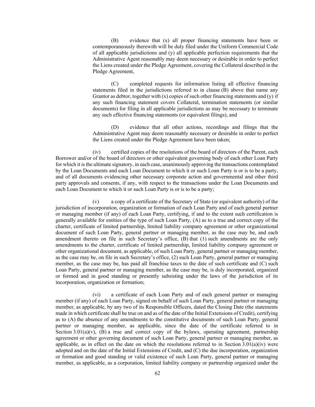 62 (B) evidence that (x) all proper financing statements have been or contemporaneously therewith will be duly filed under the Uniform Commercial Code of all applicable jurisdictions and (y) all applicable perfection requirements that the Administrative Agent reasonably may deem necessary or desirable in order to perfect the Liens created under the Pledge Agreement, covering the Collateral described in the Pledge Agreement, (C) completed requests for information listing all effective financing statements filed in the jurisdictions referred to in clause (B) above that name any Grantor as debtor, together with (x) copies of such other financing statements and (y) if any such financing statement covers Collateral, termination statements (or similar documents) for filing in all applicable jurisdictions as may be necessary to terminate any such effective financing statements (or equivalent filings), and (D) evidence that all other actions, recordings and filings that the Administrative Agent may deem reasonably necessary or desirable in order to perfect the Liens created under the Pledge Agreement have been taken; (iv) certified copies of the resolutions of the board of directors of the Parent, each Borrower and/or of the board of directors or other equivalent governing body of each other Loan Party for which it is the ultimate signatory, in each case, unanimously approving the transactions contemplated by the Loan Documents and each Loan Document to which it or such Loan Party is or is to be a party, and of all documents evidencing other necessary corporate action and governmental and other third party approvals and consents, if any, with respect to the transactions under the Loan Documents and each Loan Document to which it or such Loan Party is or is to be a party; (v) a copy of a certificate of the Secretary of State (or equivalent authority) of the jurisdiction of incorporation, organization or formation of each Loan Party and of each general partner or managing member (if any) of each Loan Party, certifying, if and to the extent such certification is generally available for entities of the type of such Loan Party, (A) as to a true and correct copy of the charter, certificate of limited partnership, limited liability company agreement or other organizational document of such Loan Party, general partner or managing member, as the case may be, and each amendment thereto on file in such Secretary’s office, (B) that (1) such amendments are the only amendments to the charter, certificate of limited partnership, limited liability company agreement or other organizational document, as applicable, of such Loan Party, general partner or managing member, as the case may be, on file in such Secretary’s office, (2) such Loan Party, general partner or managing member, as the case may be, has paid all franchise taxes to the date of such certificate and (C) such Loan Party, general partner or managing member, as the case may be, is duly incorporated, organized or formed and in good standing or presently subsisting under the laws of the jurisdiction of its incorporation, organization or formation; (vi) a certificate of each Loan Party and of each general partner or managing member (if any) of each Loan Party, signed on behalf of such Loan Party, general partner or managing member, as applicable, by any two of its Responsible Officers, dated the Closing Date (the statements made in which certificate shall be true on and as of the date of the Initial Extensions of Credit), certifying as to (A) the absence of any amendments to the constitutive documents of such Loan Party, general partner or managing member, as applicable, since the date of the certificate referred to in Section 3.01(a)(v), (B) a true and correct copy of the bylaws, operating agreement, partnership agreement or other governing document of such Loan Party, general partner or managing member, as applicable, as in effect on the date on which the resolutions referred to in Section 3.01(a)(iv) were adopted and on the date of the Initial Extensions of Credit, and (C) the due incorporation, organization or formation and good standing or valid existence of such Loan Party, general partner or managing member, as applicable, as a corporation, limited liability company or partnership organized under the