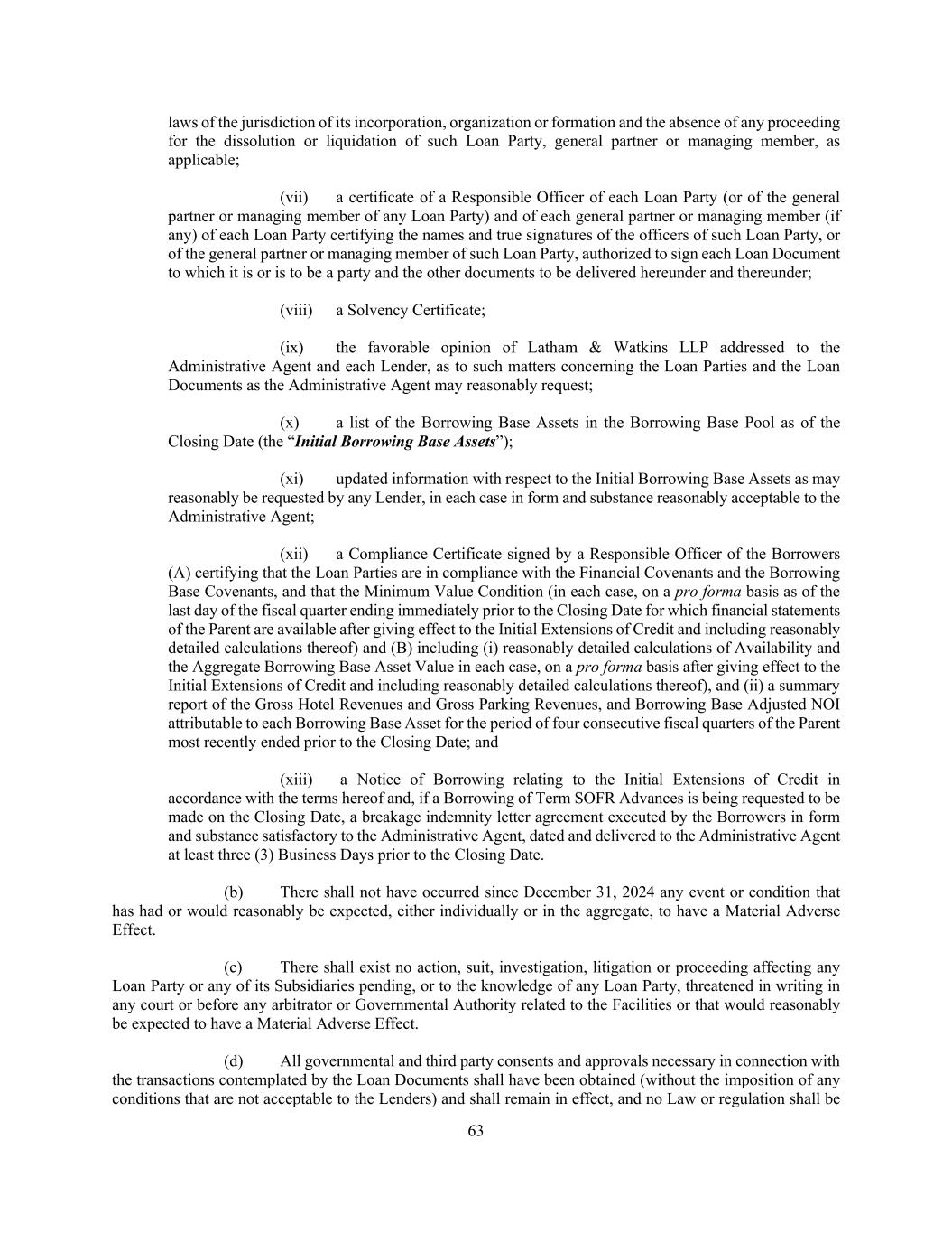 63 laws of the jurisdiction of its incorporation, organization or formation and the absence of any proceeding for the dissolution or liquidation of such Loan Party, general partner or managing member, as applicable; (vii) a certificate of a Responsible Officer of each Loan Party (or of the general partner or managing member of any Loan Party) and of each general partner or managing member (if any) of each Loan Party certifying the names and true signatures of the officers of such Loan Party, or of the general partner or managing member of such Loan Party, authorized to sign each Loan Document to which it is or is to be a party and the other documents to be delivered hereunder and thereunder; (viii) a Solvency Certificate; (ix) the favorable opinion of Latham & Watkins LLP addressed to the Administrative Agent and each Lender, as to such matters concerning the Loan Parties and the Loan Documents as the Administrative Agent may reasonably request; (x) a list of the Borrowing Base Assets in the Borrowing Base Pool as of the Closing Date (the “Initial Borrowing Base Assets”); (xi) updated information with respect to the Initial Borrowing Base Assets as may reasonably be requested by any Lender, in each case in form and substance reasonably acceptable to the Administrative Agent; (xii) a Compliance Certificate signed by a Responsible Officer of the Borrowers (A) certifying that the Loan Parties are in compliance with the Financial Covenants and the Borrowing Base Covenants, and that the Minimum Value Condition (in each case, on a pro forma basis as of the last day of the fiscal quarter ending immediately prior to the Closing Date for which financial statements of the Parent are available after giving effect to the Initial Extensions of Credit and including reasonably detailed calculations thereof) and (B) including (i) reasonably detailed calculations of Availability and the Aggregate Borrowing Base Asset Value in each case, on a pro forma basis after giving effect to the Initial Extensions of Credit and including reasonably detailed calculations thereof), and (ii) a summary report of the Gross Hotel Revenues and Gross Parking Revenues, and Borrowing Base Adjusted NOI attributable to each Borrowing Base Asset for the period of four consecutive fiscal quarters of the Parent most recently ended prior to the Closing Date; and (xiii) a Notice of Borrowing relating to the Initial Extensions of Credit in accordance with the terms hereof and, if a Borrowing of Term SOFR Advances is being requested to be made on the Closing Date, a breakage indemnity letter agreement executed by the Borrowers in form and substance satisfactory to the Administrative Agent, dated and delivered to the Administrative Agent at least three (3) Business Days prior to the Closing Date. (b) There shall not have occurred since December 31, 2024 any event or condition that has had or would reasonably be expected, either individually or in the aggregate, to have a Material Adverse Effect. (c) There shall exist no action, suit, investigation, litigation or proceeding affecting any Loan Party or any of its Subsidiaries pending, or to the knowledge of any Loan Party, threatened in writing in any court or before any arbitrator or Governmental Authority related to the Facilities or that would reasonably be expected to have a Material Adverse Effect. (d) All governmental and third party consents and approvals necessary in connection with the transactions contemplated by the Loan Documents shall have been obtained (without the imposition of any conditions that are not acceptable to the Lenders) and shall remain in effect, and no Law or regulation shall be
