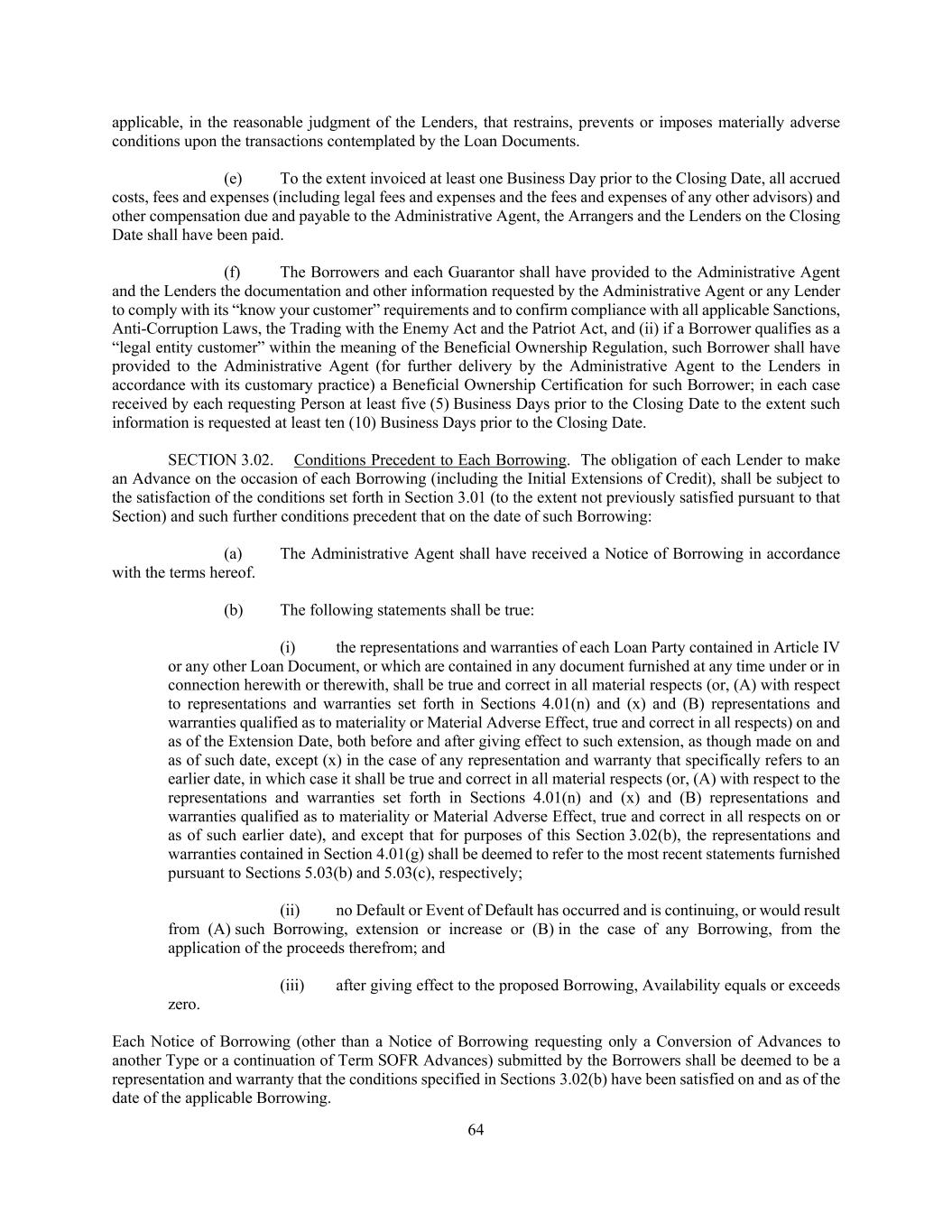 64 applicable, in the reasonable judgment of the Lenders, that restrains, prevents or imposes materially adverse conditions upon the transactions contemplated by the Loan Documents. (e) To the extent invoiced at least one Business Day prior to the Closing Date, all accrued costs, fees and expenses (including legal fees and expenses and the fees and expenses of any other advisors) and other compensation due and payable to the Administrative Agent, the Arrangers and the Lenders on the Closing Date shall have been paid. (f) The Borrowers and each Guarantor shall have provided to the Administrative Agent and the Lenders the documentation and other information requested by the Administrative Agent or any Lender to comply with its “know your customer” requirements and to confirm compliance with all applicable Sanctions, Anti-Corruption Laws, the Trading with the Enemy Act and the Patriot Act, and (ii) if a Borrower qualifies as a “legal entity customer” within the meaning of the Beneficial Ownership Regulation, such Borrower shall have provided to the Administrative Agent (for further delivery by the Administrative Agent to the Lenders in accordance with its customary practice) a Beneficial Ownership Certification for such Borrower; in each case received by each requesting Person at least five (5) Business Days prior to the Closing Date to the extent such information is requested at least ten (10) Business Days prior to the Closing Date. SECTION 3.02. Conditions Precedent to Each Borrowing. The obligation of each Lender to make an Advance on the occasion of each Borrowing (including the Initial Extensions of Credit), shall be subject to the satisfaction of the conditions set forth in Section 3.01 (to the extent not previously satisfied pursuant to that Section) and such further conditions precedent that on the date of such Borrowing: (a) The Administrative Agent shall have received a Notice of Borrowing in accordance with the terms hereof. (b) The following statements shall be true: (i) the representations and warranties of each Loan Party contained in Article IV or any other Loan Document, or which are contained in any document furnished at any time under or in connection herewith or therewith, shall be true and correct in all material respects (or, (A) with respect to representations and warranties set forth in Sections 4.01(n) and (x) and (B) representations and warranties qualified as to materiality or Material Adverse Effect, true and correct in all respects) on and as of the Extension Date, both before and after giving effect to such extension, as though made on and as of such date, except (x) in the case of any representation and warranty that specifically refers to an earlier date, in which case it shall be true and correct in all material respects (or, (A) with respect to the representations and warranties set forth in Sections 4.01(n) and (x) and (B) representations and warranties qualified as to materiality or Material Adverse Effect, true and correct in all respects on or as of such earlier date), and except that for purposes of this Section 3.02(b), the representations and warranties contained in Section 4.01(g) shall be deemed to refer to the most recent statements furnished pursuant to Sections 5.03(b) and 5.03(c), respectively; (ii) no Default or Event of Default has occurred and is continuing, or would result from (A) such Borrowing, extension or increase or (B) in the case of any Borrowing, from the application of the proceeds therefrom; and (iii) after giving effect to the proposed Borrowing, Availability equals or exceeds zero. Each Notice of Borrowing (other than a Notice of Borrowing requesting only a Conversion of Advances to another Type or a continuation of Term SOFR Advances) submitted by the Borrowers shall be deemed to be a representation and warranty that the conditions specified in Sections 3.02(b) have been satisfied on and as of the date of the applicable Borrowing.