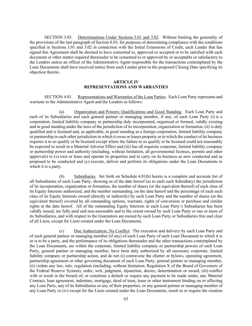 65 SECTION 3.03. Determinations Under Sections 3.01 and 3.02. Without limiting the generality of the provisions of the last paragraph of Section 8.03, for purposes of determining compliance with the conditions specified in Sections 3.01 and 3.02 in connection with the Initial Extensions of Credit, each Lender that has signed this Agreement shall be deemed to have consented to, approved or accepted or to be satisfied with each document or other matter required thereunder to be consented to or approved by or acceptable or satisfactory to the Lenders unless an officer of the Administrative Agent responsible for the transactions contemplated by the Loan Documents shall have received notice from such Lender prior to the proposed Closing Date specifying its objection thereto. ARTICLE IV REPRESENTATIONS AND WARRANTIES SECTION 4.01. Representations and Warranties of the Loan Parties. Each Loan Party represents and warrants to the Administrative Agent and the Lenders as follows: (a) Organization and Powers; Qualifications and Good Standing. Each Loan Party and each of its Subsidiaries and each general partner or managing member, if any, of each Loan Party (i) is a corporation, limited liability company or partnership duly incorporated, organized or formed, validly existing and in good standing under the laws of the jurisdiction of its incorporation, organization or formation, (ii) is duly qualified and is licensed and, as applicable, in good standing as a foreign corporation, limited liability company or partnership in each other jurisdiction in which it owns or leases property or in which the conduct of its business requires it to so qualify or be licensed except where the failure to so qualify or be licensed could not reasonably be expected to result in a Material Adverse Effect and (iii) has all requisite corporate, limited liability company or partnership power and authority (including, without limitation, all governmental licenses, permits and other approvals) to (x) own or lease and operate its properties and to carry on its business as now conducted and as proposed to be conducted and (y) execute, deliver and perform its obligations under the Loan Documents to which it is a party. (b) Subsidiaries. Set forth on Schedule 4.01(b) hereto is a complete and accurate list of all Subsidiaries of each Loan Party, showing as of the date hereof (as to each such Subsidiary) the jurisdiction of its incorporation, organization or formation, the number of shares (or the equivalent thereof) of each class of its Equity Interests authorized, and the number outstanding, on the date hereof and the percentage of each such class of its Equity Interests owned (directly or indirectly) by such Loan Party and the number of shares (or the equivalent thereof) covered by all outstanding options, warrants, rights of conversion or purchase and similar rights at the date hereof. All of the outstanding Equity Interests in each Loan Party’s Subsidiaries has been validly issued, are fully paid and non-assessable and to the extent owned by such Loan Party or one or more of its Subsidiaries, and with respect to the Guarantors are owned by such Loan Party or Subsidiaries free and clear of all Liens, except for Liens created under the Loan Documents. (c) Due Authorization; No Conflict. The execution and delivery by each Loan Party and of each general partner or managing member (if any) of each Loan Party of each Loan Document to which it is or is to be a party, and the performance of its obligations thereunder and the other transactions contemplated by the Loan Documents, are within the corporate, limited liability company or partnership powers of such Loan Party, general partner or managing member, have been duly authorized by all necessary corporate, limited liability company or partnership action, and do not (i) contravene the charter or bylaws, operating agreement, partnership agreement or other governing document of such Loan Party, general partner or managing member, (ii) violate any law, rule, regulation (including, without limitation, Regulation X of the Board of Governors of the Federal Reserve System), order, writ, judgment, injunction, decree, determination or award, (iii) conflict with or result in the breach of, or constitute a default or require any payment to be made under, any Material Contract, loan agreement, indenture, mortgage, deed of trust, lease or other instrument binding on or affecting any Loan Party, any of its Subsidiaries or any of their properties, or any general partner or managing member of any Loan Party or (iv) except for the Liens created under the Loan Documents, result in or require the creation