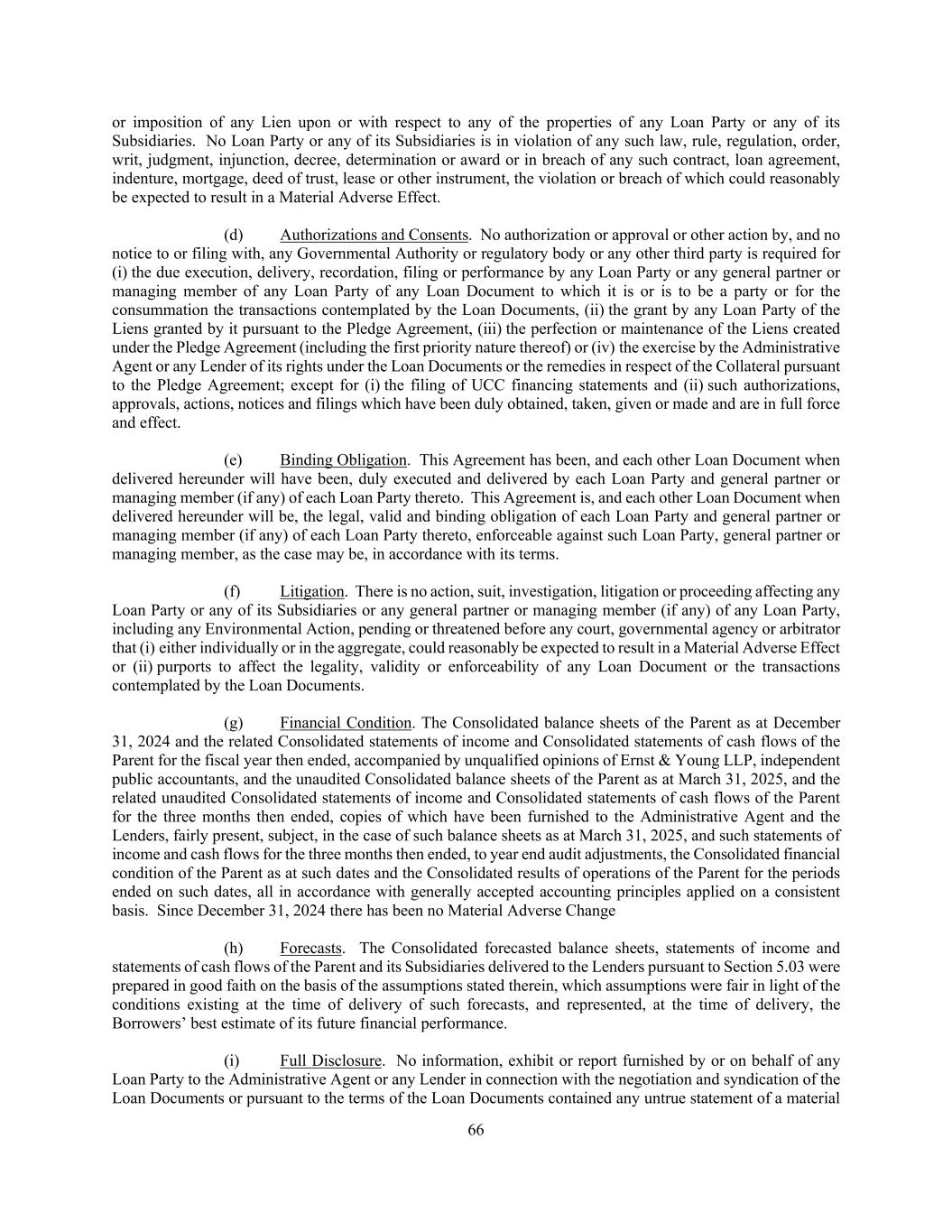 66 or imposition of any Lien upon or with respect to any of the properties of any Loan Party or any of its Subsidiaries. No Loan Party or any of its Subsidiaries is in violation of any such law, rule, regulation, order, writ, judgment, injunction, decree, determination or award or in breach of any such contract, loan agreement, indenture, mortgage, deed of trust, lease or other instrument, the violation or breach of which could reasonably be expected to result in a Material Adverse Effect. (d) Authorizations and Consents. No authorization or approval or other action by, and no notice to or filing with, any Governmental Authority or regulatory body or any other third party is required for (i) the due execution, delivery, recordation, filing or performance by any Loan Party or any general partner or managing member of any Loan Party of any Loan Document to which it is or is to be a party or for the consummation the transactions contemplated by the Loan Documents, (ii) the grant by any Loan Party of the Liens granted by it pursuant to the Pledge Agreement, (iii) the perfection or maintenance of the Liens created under the Pledge Agreement (including the first priority nature thereof) or (iv) the exercise by the Administrative Agent or any Lender of its rights under the Loan Documents or the remedies in respect of the Collateral pursuant to the Pledge Agreement; except for (i) the filing of UCC financing statements and (ii) such authorizations, approvals, actions, notices and filings which have been duly obtained, taken, given or made and are in full force and effect. (e) Binding Obligation. This Agreement has been, and each other Loan Document when delivered hereunder will have been, duly executed and delivered by each Loan Party and general partner or managing member (if any) of each Loan Party thereto. This Agreement is, and each other Loan Document when delivered hereunder will be, the legal, valid and binding obligation of each Loan Party and general partner or managing member (if any) of each Loan Party thereto, enforceable against such Loan Party, general partner or managing member, as the case may be, in accordance with its terms. (f) Litigation. There is no action, suit, investigation, litigation or proceeding affecting any Loan Party or any of its Subsidiaries or any general partner or managing member (if any) of any Loan Party, including any Environmental Action, pending or threatened before any court, governmental agency or arbitrator that (i) either individually or in the aggregate, could reasonably be expected to result in a Material Adverse Effect or (ii) purports to affect the legality, validity or enforceability of any Loan Document or the transactions contemplated by the Loan Documents. (g) Financial Condition. The Consolidated balance sheets of the Parent as at December 31, 2024 and the related Consolidated statements of income and Consolidated statements of cash flows of the Parent for the fiscal year then ended, accompanied by unqualified opinions of Ernst & Young LLP, independent public accountants, and the unaudited Consolidated balance sheets of the Parent as at March 31, 2025, and the related unaudited Consolidated statements of income and Consolidated statements of cash flows of the Parent for the three months then ended, copies of which have been furnished to the Administrative Agent and the Lenders, fairly present, subject, in the case of such balance sheets as at March 31, 2025, and such statements of income and cash flows for the three months then ended, to year end audit adjustments, the Consolidated financial condition of the Parent as at such dates and the Consolidated results of operations of the Parent for the periods ended on such dates, all in accordance with generally accepted accounting principles applied on a consistent basis. Since December 31, 2024 there has been no Material Adverse Change (h) Forecasts. The Consolidated forecasted balance sheets, statements of income and statements of cash flows of the Parent and its Subsidiaries delivered to the Lenders pursuant to Section 5.03 were prepared in good faith on the basis of the assumptions stated therein, which assumptions were fair in light of the conditions existing at the time of delivery of such forecasts, and represented, at the time of delivery, the Borrowers’ best estimate of its future financial performance. (i) Full Disclosure. No information, exhibit or report furnished by or on behalf of any Loan Party to the Administrative Agent or any Lender in connection with the negotiation and syndication of the Loan Documents or pursuant to the terms of the Loan Documents contained any untrue statement of a material