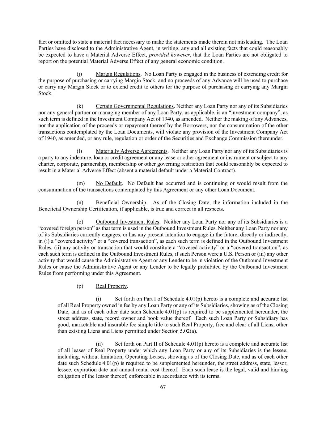 67 fact or omitted to state a material fact necessary to make the statements made therein not misleading. The Loan Parties have disclosed to the Administrative Agent, in writing, any and all existing facts that could reasonably be expected to have a Material Adverse Effect, provided however, that the Loan Parties are not obligated to report on the potential Material Adverse Effect of any general economic condition. (j) Margin Regulations. No Loan Party is engaged in the business of extending credit for the purpose of purchasing or carrying Margin Stock, and no proceeds of any Advance will be used to purchase or carry any Margin Stock or to extend credit to others for the purpose of purchasing or carrying any Margin Stock. (k) Certain Governmental Regulations. Neither any Loan Party nor any of its Subsidiaries nor any general partner or managing member of any Loan Party, as applicable, is an “investment company”, as such term is defined in the Investment Company Act of 1940, as amended. Neither the making of any Advances, nor the application of the proceeds or repayment thereof by the Borrowers, nor the consummation of the other transactions contemplated by the Loan Documents, will violate any provision of the Investment Company Act of 1940, as amended, or any rule, regulation or order of the Securities and Exchange Commission thereunder. (l) Materially Adverse Agreements. Neither any Loan Party nor any of its Subsidiaries is a party to any indenture, loan or credit agreement or any lease or other agreement or instrument or subject to any charter, corporate, partnership, membership or other governing restriction that could reasonably be expected to result in a Material Adverse Effect (absent a material default under a Material Contract). (m) No Default. No Default has occurred and is continuing or would result from the consummation of the transactions contemplated by this Agreement or any other Loan Document. (n) Beneficial Ownership. As of the Closing Date, the information included in the Beneficial Ownership Certification, if applicable, is true and correct in all respects. (o) Outbound Investment Rules. Neither any Loan Party nor any of its Subsidiaries is a “covered foreign person” as that term is used in the Outbound Investment Rules. Neither any Loan Party nor any of its Subsidiaries currently engages, or has any present intention to engage in the future, directly or indirectly, in (i) a “covered activity” or a “covered transaction”, as each such term is defined in the Outbound Investment Rules, (ii) any activity or transaction that would constitute a “covered activity” or a “covered transaction”, as each such term is defined in the Outbound Investment Rules, if such Person were a U.S. Person or (iii) any other activity that would cause the Administrative Agent or any Lender to be in violation of the Outbound Investment Rules or cause the Administrative Agent or any Lender to be legally prohibited by the Outbound Investment Rules from performing under this Agreement. (p) Real Property. (i) Set forth on Part I of Schedule 4.01(p) hereto is a complete and accurate list of all Real Property owned in fee by any Loan Party or any of its Subsidiaries, showing as of the Closing Date, and as of each other date such Schedule 4.01(p) is required to be supplemented hereunder, the street address, state, record owner and book value thereof. Each such Loan Party or Subsidiary has good, marketable and insurable fee simple title to such Real Property, free and clear of all Liens, other than existing Liens and Liens permitted under Section 5.02(a). (ii) Set forth on Part II of Schedule 4.01(p) hereto is a complete and accurate list of all leases of Real Property under which any Loan Party or any of its Subsidiaries is the lessee, including, without limitation, Operating Leases, showing as of the Closing Date, and as of each other date such Schedule 4.01(p) is required to be supplemented hereunder, the street address, state, lessor, lessee, expiration date and annual rental cost thereof. Each such lease is the legal, valid and binding obligation of the lessor thereof, enforceable in accordance with its terms.