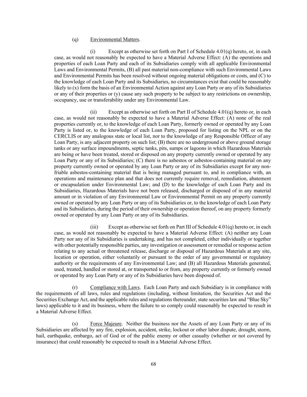 68 (q) Environmental Matters. (i) Except as otherwise set forth on Part I of Schedule 4.01(q) hereto, or, in each case, as would not reasonably be expected to have a Material Adverse Effect: (A) the operations and properties of each Loan Party and each of its Subsidiaries comply with all applicable Environmental Laws and Environmental Permits, (B) all past material non-compliance with such Environmental Laws and Environmental Permits has been resolved without ongoing material obligations or costs, and (C) to the knowledge of each Loan Party and its Subsidiaries, no circumstances exist that could be reasonably likely to (x) form the basis of an Environmental Action against any Loan Party or any of its Subsidiaries or any of their properties or (y) cause any such property to be subject to any restrictions on ownership, occupancy, use or transferability under any Environmental Law. (ii) Except as otherwise set forth on Part II of Schedule 4.01(q) hereto or, in each case, as would not reasonably be expected to have a Material Adverse Effect: (A) none of the real properties currently or, to the knowledge of each Loan Party, formerly owned or operated by any Loan Party is listed or, to the knowledge of each Loan Party, proposed for listing on the NPL or on the CERCLIS or any analogous state or local list, nor to the knowledge of any Responsible Officer of any Loan Party, is any adjacent property on such list; (B) there are no underground or above ground storage tanks or any surface impoundments, septic tanks, pits, sumps or lagoons in which Hazardous Materials are being or have been treated, stored or disposed on any property currently owned or operated by any Loan Party or any of its Subsidiaries; (C) there is no asbestos or asbestos-containing material on any property currently owned or operated by any Loan Party or any of its Subsidiaries except for any non- friable asbestos-containing material that is being managed pursuant to, and in compliance with, an operations and maintenance plan and that does not currently require removal, remediation, abatement or encapsulation under Environmental Law; and (D) to the knowledge of each Loan Party and its Subsidiaries, Hazardous Materials have not been released, discharged or disposed of in any material amount or in violation of any Environmental Law or Environmental Permit on any property currently owned or operated by any Loan Party or any of its Subsidiaries or, to the knowledge of each Loan Party and its Subsidiaries, during the period of their ownership or operation thereof, on any property formerly owned or operated by any Loan Party or any of its Subsidiaries. (iii) Except as otherwise set forth on Part III of Schedule 4.01(q) hereto or, in each case, as would not reasonably be expected to have a Material Adverse Effect: (A) neither any Loan Party nor any of its Subsidiaries is undertaking, and has not completed, either individually or together with other potentially responsible parties, any investigation or assessment or remedial or response action relating to any actual or threatened release, discharge or disposal of Hazardous Materials at any site, location or operation, either voluntarily or pursuant to the order of any governmental or regulatory authority or the requirements of any Environmental Law; and (B) all Hazardous Materials generated, used, treated, handled or stored at, or transported to or from, any property currently or formerly owned or operated by any Loan Party or any of its Subsidiaries have been disposed of. (r) Compliance with Laws. Each Loan Party and each Subsidiary is in compliance with the requirements of all laws, rules and regulations (including, without limitation, the Securities Act and the Securities Exchange Act, and the applicable rules and regulations thereunder, state securities law and “Blue Sky” laws) applicable to it and its business, where the failure to so comply could reasonably be expected to result in a Material Adverse Effect. (s) Force Majeure. Neither the business nor the Assets of any Loan Party or any of its Subsidiaries are affected by any fire, explosion, accident, strike, lockout or other labor dispute, drought, storm, hail, earthquake, embargo, act of God or of the public enemy or other casualty (whether or not covered by insurance) that could reasonably be expected to result in a Material Adverse Effect.