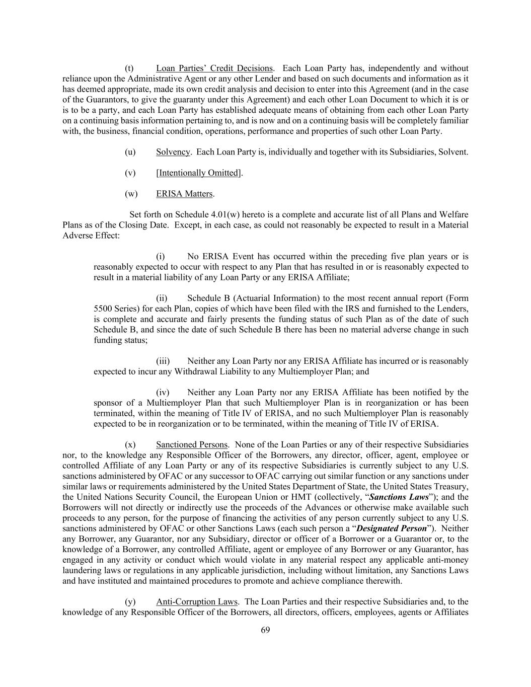 69 (t) Loan Parties’ Credit Decisions. Each Loan Party has, independently and without reliance upon the Administrative Agent or any other Lender and based on such documents and information as it has deemed appropriate, made its own credit analysis and decision to enter into this Agreement (and in the case of the Guarantors, to give the guaranty under this Agreement) and each other Loan Document to which it is or is to be a party, and each Loan Party has established adequate means of obtaining from each other Loan Party on a continuing basis information pertaining to, and is now and on a continuing basis will be completely familiar with, the business, financial condition, operations, performance and properties of such other Loan Party. (u) Solvency. Each Loan Party is, individually and together with its Subsidiaries, Solvent. (v) [Intentionally Omitted]. (w) ERISA Matters. Set forth on Schedule 4.01(w) hereto is a complete and accurate list of all Plans and Welfare Plans as of the Closing Date. Except, in each case, as could not reasonably be expected to result in a Material Adverse Effect: (i) No ERISA Event has occurred within the preceding five plan years or is reasonably expected to occur with respect to any Plan that has resulted in or is reasonably expected to result in a material liability of any Loan Party or any ERISA Affiliate; (ii) Schedule B (Actuarial Information) to the most recent annual report (Form 5500 Series) for each Plan, copies of which have been filed with the IRS and furnished to the Lenders, is complete and accurate and fairly presents the funding status of such Plan as of the date of such Schedule B, and since the date of such Schedule B there has been no material adverse change in such funding status; (iii) Neither any Loan Party nor any ERISA Affiliate has incurred or is reasonably expected to incur any Withdrawal Liability to any Multiemployer Plan; and (iv) Neither any Loan Party nor any ERISA Affiliate has been notified by the sponsor of a Multiemployer Plan that such Multiemployer Plan is in reorganization or has been terminated, within the meaning of Title IV of ERISA, and no such Multiemployer Plan is reasonably expected to be in reorganization or to be terminated, within the meaning of Title IV of ERISA. (x) Sanctioned Persons. None of the Loan Parties or any of their respective Subsidiaries nor, to the knowledge any Responsible Officer of the Borrowers, any director, officer, agent, employee or controlled Affiliate of any Loan Party or any of its respective Subsidiaries is currently subject to any U.S. sanctions administered by OFAC or any successor to OFAC carrying out similar function or any sanctions under similar laws or requirements administered by the United States Department of State, the United States Treasury, the United Nations Security Council, the European Union or HMT (collectively, “Sanctions Laws”); and the Borrowers will not directly or indirectly use the proceeds of the Advances or otherwise make available such proceeds to any person, for the purpose of financing the activities of any person currently subject to any U.S. sanctions administered by OFAC or other Sanctions Laws (each such person a “Designated Person”). Neither any Borrower, any Guarantor, nor any Subsidiary, director or officer of a Borrower or a Guarantor or, to the knowledge of a Borrower, any controlled Affiliate, agent or employee of any Borrower or any Guarantor, has engaged in any activity or conduct which would violate in any material respect any applicable anti-money laundering laws or regulations in any applicable jurisdiction, including without limitation, any Sanctions Laws and have instituted and maintained procedures to promote and achieve compliance therewith. (y) Anti-Corruption Laws. The Loan Parties and their respective Subsidiaries and, to the knowledge of any Responsible Officer of the Borrowers, all directors, officers, employees, agents or Affiliates