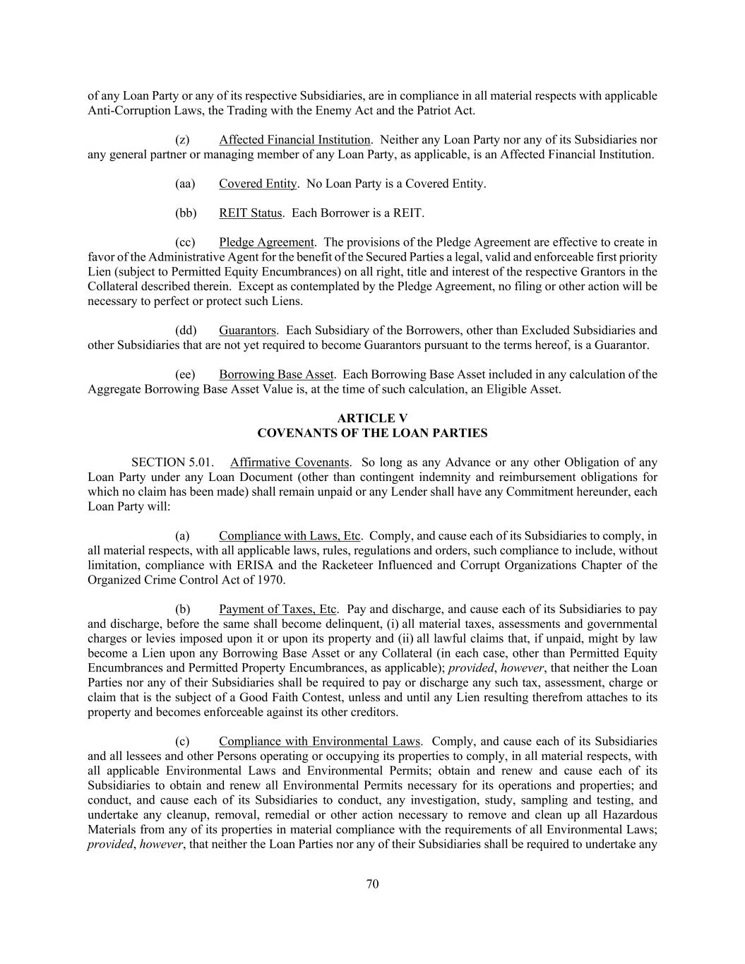 70 of any Loan Party or any of its respective Subsidiaries, are in compliance in all material respects with applicable Anti-Corruption Laws, the Trading with the Enemy Act and the Patriot Act. (z) Affected Financial Institution. Neither any Loan Party nor any of its Subsidiaries nor any general partner or managing member of any Loan Party, as applicable, is an Affected Financial Institution. (aa) Covered Entity. No Loan Party is a Covered Entity. (bb) REIT Status. Each Borrower is a REIT. (cc) Pledge Agreement. The provisions of the Pledge Agreement are effective to create in favor of the Administrative Agent for the benefit of the Secured Parties a legal, valid and enforceable first priority Lien (subject to Permitted Equity Encumbrances) on all right, title and interest of the respective Grantors in the Collateral described therein. Except as contemplated by the Pledge Agreement, no filing or other action will be necessary to perfect or protect such Liens. (dd) Guarantors. Each Subsidiary of the Borrowers, other than Excluded Subsidiaries and other Subsidiaries that are not yet required to become Guarantors pursuant to the terms hereof, is a Guarantor. (ee) Borrowing Base Asset. Each Borrowing Base Asset included in any calculation of the Aggregate Borrowing Base Asset Value is, at the time of such calculation, an Eligible Asset. ARTICLE V COVENANTS OF THE LOAN PARTIES SECTION 5.01. Affirmative Covenants. So long as any Advance or any other Obligation of any Loan Party under any Loan Document (other than contingent indemnity and reimbursement obligations for which no claim has been made) shall remain unpaid or any Lender shall have any Commitment hereunder, each Loan Party will: (a) Compliance with Laws, Etc. Comply, and cause each of its Subsidiaries to comply, in all material respects, with all applicable laws, rules, regulations and orders, such compliance to include, without limitation, compliance with ERISA and the Racketeer Influenced and Corrupt Organizations Chapter of the Organized Crime Control Act of 1970. (b) Payment of Taxes, Etc. Pay and discharge, and cause each of its Subsidiaries to pay and discharge, before the same shall become delinquent, (i) all material taxes, assessments and governmental charges or levies imposed upon it or upon its property and (ii) all lawful claims that, if unpaid, might by law become a Lien upon any Borrowing Base Asset or any Collateral (in each case, other than Permitted Equity Encumbrances and Permitted Property Encumbrances, as applicable); provided, however, that neither the Loan Parties nor any of their Subsidiaries shall be required to pay or discharge any such tax, assessment, charge or claim that is the subject of a Good Faith Contest, unless and until any Lien resulting therefrom attaches to its property and becomes enforceable against its other creditors. (c) Compliance with Environmental Laws. Comply, and cause each of its Subsidiaries and all lessees and other Persons operating or occupying its properties to comply, in all material respects, with all applicable Environmental Laws and Environmental Permits; obtain and renew and cause each of its Subsidiaries to obtain and renew all Environmental Permits necessary for its operations and properties; and conduct, and cause each of its Subsidiaries to conduct, any investigation, study, sampling and testing, and undertake any cleanup, removal, remedial or other action necessary to remove and clean up all Hazardous Materials from any of its properties in material compliance with the requirements of all Environmental Laws; provided, however, that neither the Loan Parties nor any of their Subsidiaries shall be required to undertake any
