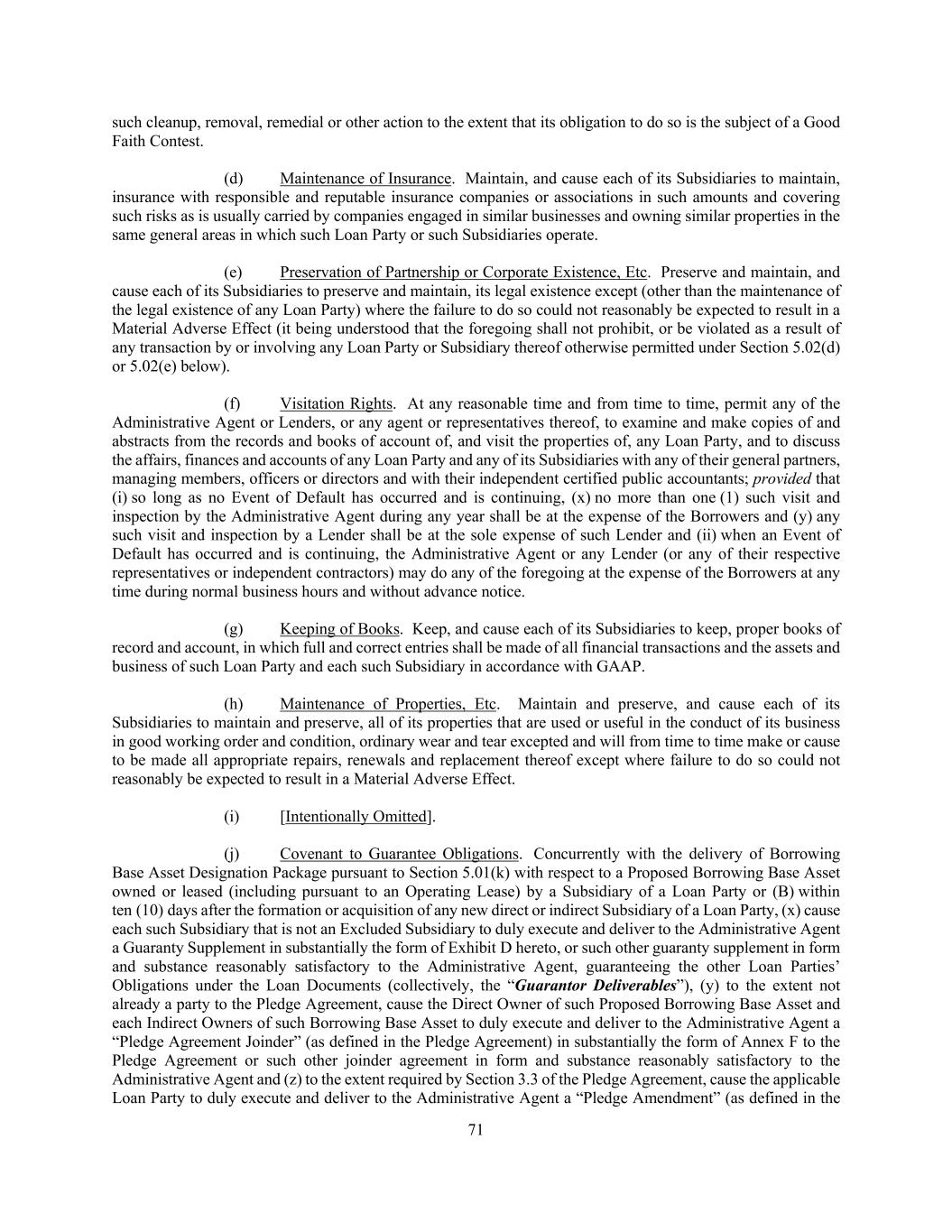 71 such cleanup, removal, remedial or other action to the extent that its obligation to do so is the subject of a Good Faith Contest. (d) Maintenance of Insurance. Maintain, and cause each of its Subsidiaries to maintain, insurance with responsible and reputable insurance companies or associations in such amounts and covering such risks as is usually carried by companies engaged in similar businesses and owning similar properties in the same general areas in which such Loan Party or such Subsidiaries operate. (e) Preservation of Partnership or Corporate Existence, Etc. Preserve and maintain, and cause each of its Subsidiaries to preserve and maintain, its legal existence except (other than the maintenance of the legal existence of any Loan Party) where the failure to do so could not reasonably be expected to result in a Material Adverse Effect (it being understood that the foregoing shall not prohibit, or be violated as a result of any transaction by or involving any Loan Party or Subsidiary thereof otherwise permitted under Section 5.02(d) or 5.02(e) below). (f) Visitation Rights. At any reasonable time and from time to time, permit any of the Administrative Agent or Lenders, or any agent or representatives thereof, to examine and make copies of and abstracts from the records and books of account of, and visit the properties of, any Loan Party, and to discuss the affairs, finances and accounts of any Loan Party and any of its Subsidiaries with any of their general partners, managing members, officers or directors and with their independent certified public accountants; provided that (i) so long as no Event of Default has occurred and is continuing, (x) no more than one (1) such visit and inspection by the Administrative Agent during any year shall be at the expense of the Borrowers and (y) any such visit and inspection by a Lender shall be at the sole expense of such Lender and (ii) when an Event of Default has occurred and is continuing, the Administrative Agent or any Lender (or any of their respective representatives or independent contractors) may do any of the foregoing at the expense of the Borrowers at any time during normal business hours and without advance notice. (g) Keeping of Books. Keep, and cause each of its Subsidiaries to keep, proper books of record and account, in which full and correct entries shall be made of all financial transactions and the assets and business of such Loan Party and each such Subsidiary in accordance with GAAP. (h) Maintenance of Properties, Etc. Maintain and preserve, and cause each of its Subsidiaries to maintain and preserve, all of its properties that are used or useful in the conduct of its business in good working order and condition, ordinary wear and tear excepted and will from time to time make or cause to be made all appropriate repairs, renewals and replacement thereof except where failure to do so could not reasonably be expected to result in a Material Adverse Effect. (i) [Intentionally Omitted]. (j) Covenant to Guarantee Obligations. Concurrently with the delivery of Borrowing Base Asset Designation Package pursuant to Section 5.01(k) with respect to a Proposed Borrowing Base Asset owned or leased (including pursuant to an Operating Lease) by a Subsidiary of a Loan Party or (B) within ten (10) days after the formation or acquisition of any new direct or indirect Subsidiary of a Loan Party, (x) cause each such Subsidiary that is not an Excluded Subsidiary to duly execute and deliver to the Administrative Agent a Guaranty Supplement in substantially the form of Exhibit D hereto, or such other guaranty supplement in form and substance reasonably satisfactory to the Administrative Agent, guaranteeing the other Loan Parties’ Obligations under the Loan Documents (collectively, the “Guarantor Deliverables”), (y) to the extent not already a party to the Pledge Agreement, cause the Direct Owner of such Proposed Borrowing Base Asset and each Indirect Owners of such Borrowing Base Asset to duly execute and deliver to the Administrative Agent a “Pledge Agreement Joinder” (as defined in the Pledge Agreement) in substantially the form of Annex F to the Pledge Agreement or such other joinder agreement in form and substance reasonably satisfactory to the Administrative Agent and (z) to the extent required by Section 3.3 of the Pledge Agreement, cause the applicable Loan Party to duly execute and deliver to the Administrative Agent a “Pledge Amendment” (as defined in the