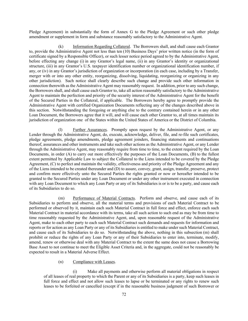 72 Pledge Agreement) in substantially the form of Annex G to the Pledge Agreement or such other pledge amendment or supplement in form and substance reasonably satisfactory to the Administrative Agent. (k) Information Regarding Collateral. The Borrowers shall, and shall cause each Grantor to, provide the Administrative Agent not less than ten (10) Business Days’ prior written notice (in the form of certificate signed by a Responsible Officer), or such lesser notice period agreed to by the Administrative Agent, before effecting any change (i) in any Grantor’s legal name, (ii) in any Grantor’s identity or organizational structure, (iii) in any Grantor’s U.S. taxpayer identification number or organizational identification number, if any, or (iv) in any Grantor’s jurisdiction of organization or incorporation (in each case, including by a Transfer, merger with or into any other entity, reorganizing, dissolving, liquidating, reorganizing or organizing in any other jurisdiction). Such notice shall clearly describe such change and provide such other information in connection therewith as the Administrative Agent may reasonably request. In addition, prior to any such change, the Borrowers shall, and shall cause each Grantor to, take all action reasonably satisfactory to the Administrative Agent to maintain the perfection and priority of the security interest of the Administrative Agent for the benefit of the Secured Parties in the Collateral, if applicable. The Borrowers hereby agree to promptly provide the Administrative Agent with certified Organization Documents reflecting any of the changes described above in this section. Notwithstanding the foregoing or anything else to the contrary contained herein or in any other Loan Document, the Borrowers agree that it will, and will cause each other Grantor to, at all times maintain its jurisdiction of organization one of the States within the United States of America or the District of Columbia. (l) Further Assurances. Promptly upon request by the Administrative Agent, or any Lender through the Administrative Agent, do, execute, acknowledge, deliver, file, and re-file such certificates, pledge agreements, pledge amendments, pledge agreement joinders, financing statements and continuations thereof, assurances and other instruments and take such other actions as the Administrative Agent, or any Lender through the Administrative Agent, may reasonably require from time to time, to the extent required by the Loan Documents, in order (A) to carry out more effectively the purposes of the Loan Documents, (B) to the fullest extent permitted by Applicable Law to subject the Collateral to the Liens intended to be covered by the Pledge Agreement, (C) to perfect and maintain the validity, effectiveness and priority of the Pledge Agreement and any of the Liens intended to be created thereunder and (D) to assure, convey, grant, assign, transfer, preserve, protect and confirm more effectively unto the Secured Parties the rights granted or now or hereafter intended to be granted to the Secured Parties under any Loan Document or under any other instrument executed in connection with any Loan Document to which any Loan Party or any of its Subsidiaries is or is to be a party, and cause each of its Subsidiaries to do so. (m) Performance of Material Contracts. Perform and observe, and cause each of its Subsidiaries to perform and observe, all the material terms and provisions of each Material Contract to be performed or observed by it, maintain each such Material Contract in full force and effect, enforce each such Material Contract in material accordance with its terms, take all such action to such end as may be from time to time reasonably requested by the Administrative Agent, and, upon reasonable request of the Administrative Agent, make to each other party to each such Material Contract such demands and requests for information and reports or for action as any Loan Party or any of its Subsidiaries is entitled to make under such Material Contract, and cause each of its Subsidiaries to do so. Notwithstanding the above, nothing in this subsection (m) shall prohibit or reduce the rights of any Loan Party or any of their Subsidiaries to enter into, terminate, modify, amend, renew or otherwise deal with any Material Contract to the extent the same does not cause a Borrowing Base Asset to not continue to meet the Eligible Asset Criteria and, in the aggregate, could not be reasonably be expected to result in a Material Adverse Effect. (n) Compliance with Leases. (i) Make all payments and otherwise perform all material obligations in respect of all leases of real property to which the Parent or any of its Subsidiaries is a party, keep such leases in full force and effect and not allow such leases to lapse or be terminated or any rights to renew such leases to be forfeited or cancelled (except if in the reasonable business judgment of such Borrower or