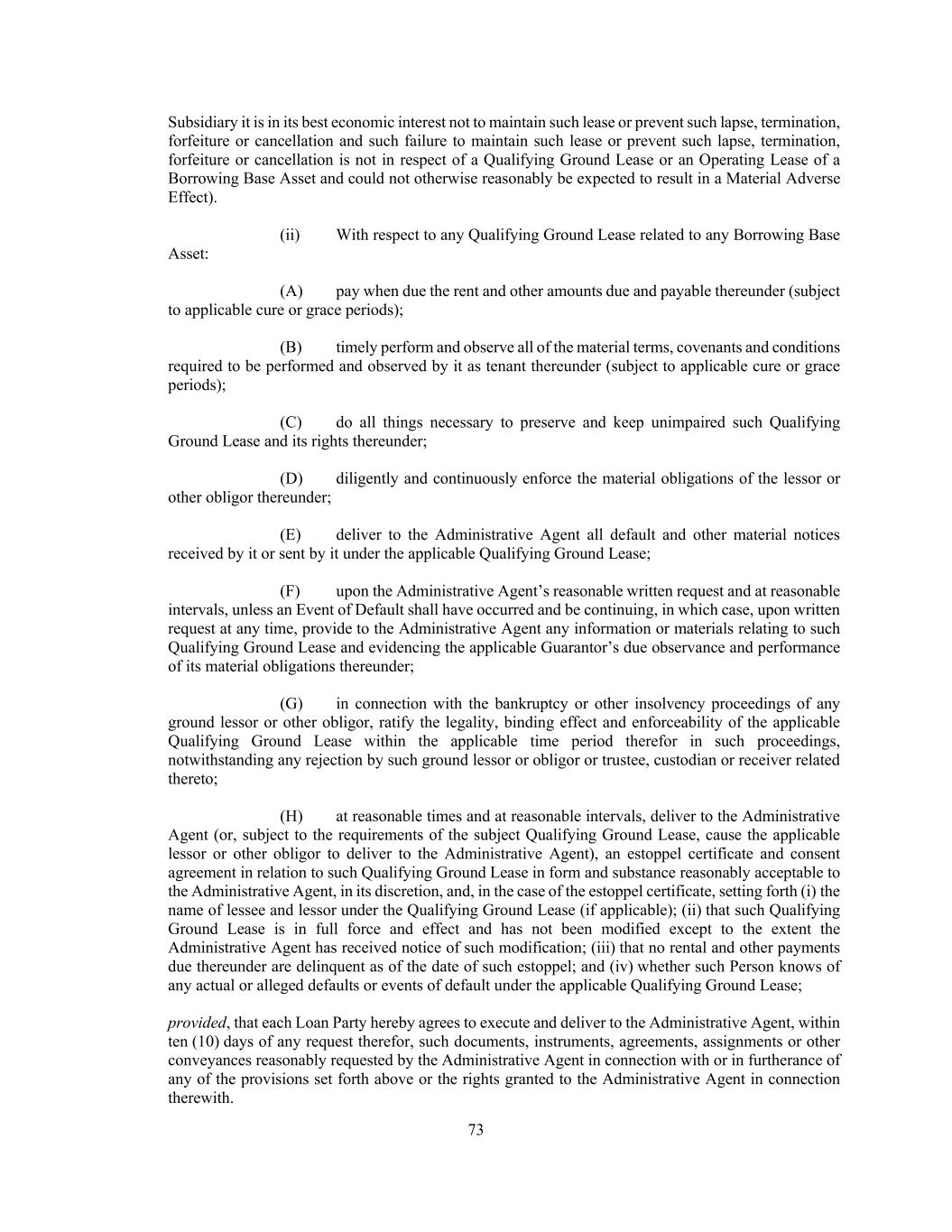 73 Subsidiary it is in its best economic interest not to maintain such lease or prevent such lapse, termination, forfeiture or cancellation and such failure to maintain such lease or prevent such lapse, termination, forfeiture or cancellation is not in respect of a Qualifying Ground Lease or an Operating Lease of a Borrowing Base Asset and could not otherwise reasonably be expected to result in a Material Adverse Effect). (ii) With respect to any Qualifying Ground Lease related to any Borrowing Base Asset: (A) pay when due the rent and other amounts due and payable thereunder (subject to applicable cure or grace periods); (B) timely perform and observe all of the material terms, covenants and conditions required to be performed and observed by it as tenant thereunder (subject to applicable cure or grace periods); (C) do all things necessary to preserve and keep unimpaired such Qualifying Ground Lease and its rights thereunder; (D) diligently and continuously enforce the material obligations of the lessor or other obligor thereunder; (E) deliver to the Administrative Agent all default and other material notices received by it or sent by it under the applicable Qualifying Ground Lease; (F) upon the Administrative Agent’s reasonable written request and at reasonable intervals, unless an Event of Default shall have occurred and be continuing, in which case, upon written request at any time, provide to the Administrative Agent any information or materials relating to such Qualifying Ground Lease and evidencing the applicable Guarantor’s due observance and performance of its material obligations thereunder; (G) in connection with the bankruptcy or other insolvency proceedings of any ground lessor or other obligor, ratify the legality, binding effect and enforceability of the applicable Qualifying Ground Lease within the applicable time period therefor in such proceedings, notwithstanding any rejection by such ground lessor or obligor or trustee, custodian or receiver related thereto; (H) at reasonable times and at reasonable intervals, deliver to the Administrative Agent (or, subject to the requirements of the subject Qualifying Ground Lease, cause the applicable lessor or other obligor to deliver to the Administrative Agent), an estoppel certificate and consent agreement in relation to such Qualifying Ground Lease in form and substance reasonably acceptable to the Administrative Agent, in its discretion, and, in the case of the estoppel certificate, setting forth (i) the name of lessee and lessor under the Qualifying Ground Lease (if applicable); (ii) that such Qualifying Ground Lease is in full force and effect and has not been modified except to the extent the Administrative Agent has received notice of such modification; (iii) that no rental and other payments due thereunder are delinquent as of the date of such estoppel; and (iv) whether such Person knows of any actual or alleged defaults or events of default under the applicable Qualifying Ground Lease; provided, that each Loan Party hereby agrees to execute and deliver to the Administrative Agent, within ten (10) days of any request therefor, such documents, instruments, agreements, assignments or other conveyances reasonably requested by the Administrative Agent in connection with or in furtherance of any of the provisions set forth above or the rights granted to the Administrative Agent in connection therewith.