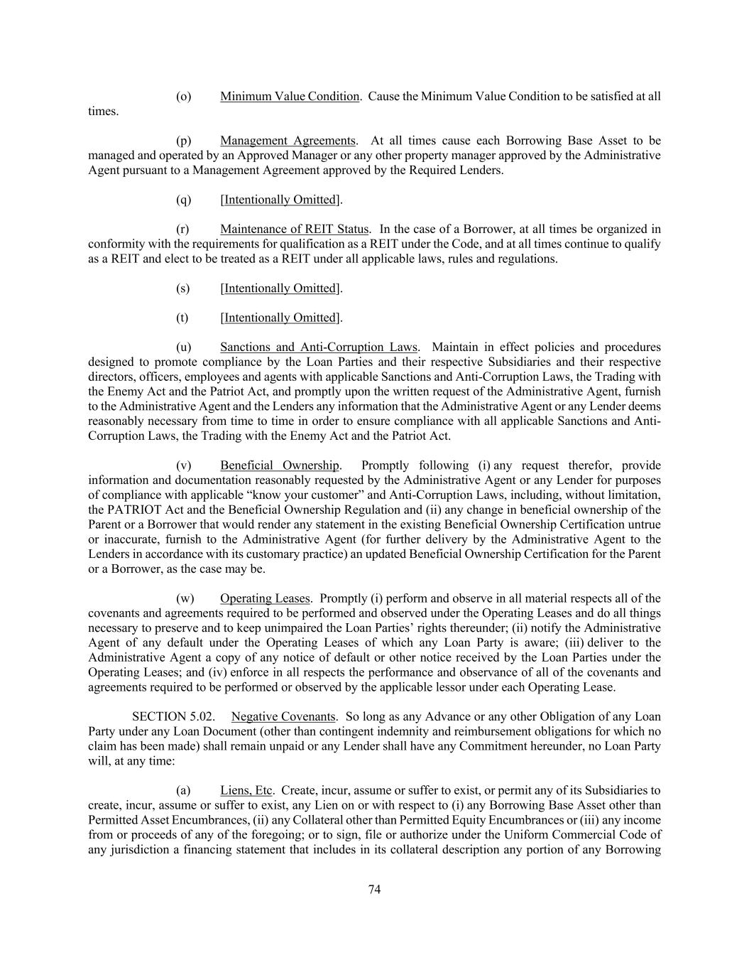 74 (o) Minimum Value Condition. Cause the Minimum Value Condition to be satisfied at all times. (p) Management Agreements. At all times cause each Borrowing Base Asset to be managed and operated by an Approved Manager or any other property manager approved by the Administrative Agent pursuant to a Management Agreement approved by the Required Lenders. (q) [Intentionally Omitted]. (r) Maintenance of REIT Status. In the case of a Borrower, at all times be organized in conformity with the requirements for qualification as a REIT under the Code, and at all times continue to qualify as a REIT and elect to be treated as a REIT under all applicable laws, rules and regulations. (s) [Intentionally Omitted]. (t) [Intentionally Omitted]. (u) Sanctions and Anti-Corruption Laws. Maintain in effect policies and procedures designed to promote compliance by the Loan Parties and their respective Subsidiaries and their respective directors, officers, employees and agents with applicable Sanctions and Anti-Corruption Laws, the Trading with the Enemy Act and the Patriot Act, and promptly upon the written request of the Administrative Agent, furnish to the Administrative Agent and the Lenders any information that the Administrative Agent or any Lender deems reasonably necessary from time to time in order to ensure compliance with all applicable Sanctions and Anti- Corruption Laws, the Trading with the Enemy Act and the Patriot Act. (v) Beneficial Ownership. Promptly following (i) any request therefor, provide information and documentation reasonably requested by the Administrative Agent or any Lender for purposes of compliance with applicable “know your customer” and Anti-Corruption Laws, including, without limitation, the PATRIOT Act and the Beneficial Ownership Regulation and (ii) any change in beneficial ownership of the Parent or a Borrower that would render any statement in the existing Beneficial Ownership Certification untrue or inaccurate, furnish to the Administrative Agent (for further delivery by the Administrative Agent to the Lenders in accordance with its customary practice) an updated Beneficial Ownership Certification for the Parent or a Borrower, as the case may be. (w) Operating Leases. Promptly (i) perform and observe in all material respects all of the covenants and agreements required to be performed and observed under the Operating Leases and do all things necessary to preserve and to keep unimpaired the Loan Parties’ rights thereunder; (ii) notify the Administrative Agent of any default under the Operating Leases of which any Loan Party is aware; (iii) deliver to the Administrative Agent a copy of any notice of default or other notice received by the Loan Parties under the Operating Leases; and (iv) enforce in all respects the performance and observance of all of the covenants and agreements required to be performed or observed by the applicable lessor under each Operating Lease. SECTION 5.02. Negative Covenants. So long as any Advance or any other Obligation of any Loan Party under any Loan Document (other than contingent indemnity and reimbursement obligations for which no claim has been made) shall remain unpaid or any Lender shall have any Commitment hereunder, no Loan Party will, at any time: (a) Liens, Etc. Create, incur, assume or suffer to exist, or permit any of its Subsidiaries to create, incur, assume or suffer to exist, any Lien on or with respect to (i) any Borrowing Base Asset other than Permitted Asset Encumbrances, (ii) any Collateral other than Permitted Equity Encumbrances or (iii) any income from or proceeds of any of the foregoing; or to sign, file or authorize under the Uniform Commercial Code of any jurisdiction a financing statement that includes in its collateral description any portion of any Borrowing