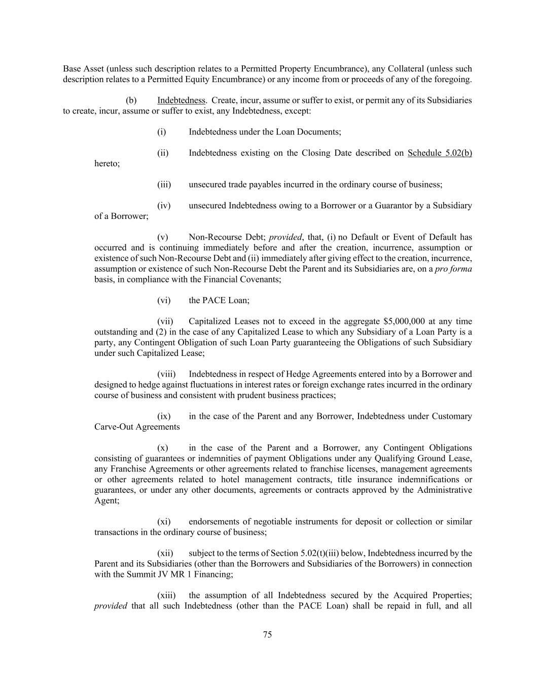 75 Base Asset (unless such description relates to a Permitted Property Encumbrance), any Collateral (unless such description relates to a Permitted Equity Encumbrance) or any income from or proceeds of any of the foregoing. (b) Indebtedness. Create, incur, assume or suffer to exist, or permit any of its Subsidiaries to create, incur, assume or suffer to exist, any Indebtedness, except: (i) Indebtedness under the Loan Documents; (ii) Indebtedness existing on the Closing Date described on Schedule 5.02(b) hereto; (iii) unsecured trade payables incurred in the ordinary course of business; (iv) unsecured Indebtedness owing to a Borrower or a Guarantor by a Subsidiary of a Borrower; (v) Non-Recourse Debt; provided, that, (i) no Default or Event of Default has occurred and is continuing immediately before and after the creation, incurrence, assumption or existence of such Non-Recourse Debt and (ii) immediately after giving effect to the creation, incurrence, assumption or existence of such Non-Recourse Debt the Parent and its Subsidiaries are, on a pro forma basis, in compliance with the Financial Covenants; (vi) the PACE Loan; (vii) Capitalized Leases not to exceed in the aggregate $5,000,000 at any time outstanding and (2) in the case of any Capitalized Lease to which any Subsidiary of a Loan Party is a party, any Contingent Obligation of such Loan Party guaranteeing the Obligations of such Subsidiary under such Capitalized Lease; (viii) Indebtedness in respect of Hedge Agreements entered into by a Borrower and designed to hedge against fluctuations in interest rates or foreign exchange rates incurred in the ordinary course of business and consistent with prudent business practices; (ix) in the case of the Parent and any Borrower, Indebtedness under Customary Carve-Out Agreements (x) in the case of the Parent and a Borrower, any Contingent Obligations consisting of guarantees or indemnities of payment Obligations under any Qualifying Ground Lease, any Franchise Agreements or other agreements related to franchise licenses, management agreements or other agreements related to hotel management contracts, title insurance indemnifications or guarantees, or under any other documents, agreements or contracts approved by the Administrative Agent; (xi) endorsements of negotiable instruments for deposit or collection or similar transactions in the ordinary course of business; (xii) subject to the terms of Section 5.02(t)(iii) below, Indebtedness incurred by the Parent and its Subsidiaries (other than the Borrowers and Subsidiaries of the Borrowers) in connection with the Summit JV MR 1 Financing; (xiii) the assumption of all Indebtedness secured by the Acquired Properties; provided that all such Indebtedness (other than the PACE Loan) shall be repaid in full, and all
