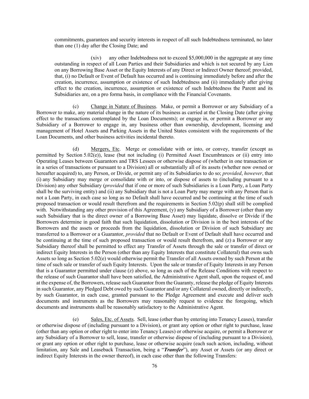 76 commitments, guarantees and security interests in respect of all such Indebtedness terminated, no later than one (1) day after the Closing Date; and (xiv) any other Indebtedness not to exceed $5,000,000 in the aggregate at any time outstanding in respect of all Loan Parties and their Subsidiaries and which is not secured by any Lien on any Borrowing Base Asset or the Equity Interests of any Direct or Indirect Owner thereof; provided, that, (i) no Default or Event of Default has occurred and is continuing immediately before and after the creation, incurrence, assumption or existence of such Indebtedness and (ii) immediately after giving effect to the creation, incurrence, assumption or existence of such Indebtedness the Parent and its Subsidiaries are, on a pro forma basis, in compliance with the Financial Covenants. (c) Change in Nature of Business. Make, or permit a Borrower or any Subsidiary of a Borrower to make, any material change in the nature of its business as carried at the Closing Date (after giving effect to the transactions contemplated by the Loan Documents); or engage in, or permit a Borrower or any Subsidiary of a Borrower to engage in, any business other than ownership, development, licensing and management of Hotel Assets and Parking Assets in the United States consistent with the requirements of the Loan Documents, and other business activities incidental thereto. (d) Mergers, Etc. Merge or consolidate with or into, or convey, transfer (except as permitted by Section 5.02(e)), lease (but not including (i) Permitted Asset Encumbrances or (ii) entry into Operating Leases between Guarantors and TRS Lessees or otherwise dispose of (whether in one transaction or in a series of transactions or pursuant to a Division) all or substantially all of its assets (whether now owned or hereafter acquired) to, any Person, or Divide, or permit any of its Subsidiaries to do so; provided, however, that (i) any Subsidiary may merge or consolidate with or into, or dispose of assets to (including pursuant to a Division) any other Subsidiary (provided that if one or more of such Subsidiaries is a Loan Party, a Loan Party shall be the surviving entity) and (ii) any Subsidiary that is not a Loan Party may merge with any Person that is not a Loan Party, in each case so long as no Default shall have occurred and be continuing at the time of such proposed transaction or would result therefrom and the requirements in Section 5.02(p) shall still be complied with. Notwithstanding any other provision of this Agreement, (y) any Subsidiary of a Borrower (other than any such Subsidiary that is the direct owner of a Borrowing Base Asset) may liquidate, dissolve or Divide if the Borrowers determine in good faith that such liquidation, dissolution or Division is in the best interests of the Borrowers and the assets or proceeds from the liquidation, dissolution or Division of such Subsidiary are transferred to a Borrower or a Guarantor, provided that no Default or Event of Default shall have occurred and be continuing at the time of such proposed transaction or would result therefrom, and (z) a Borrower or any Subsidiary thereof shall be permitted to effect any Transfer of Assets through the sale or transfer of direct or indirect Equity Interests in the Person (other than any Equity Interests that constitute Collateral) that owns such Assets so long as Section 5.02(e) would otherwise permit the Transfer of all Assets owned by such Person at the time of such sale or transfer of such Equity Interests. Upon the sale or transfer of Equity Interests in any Person that is a Guarantor permitted under clause (z) above, so long as each of the Release Conditions with respect to the release of such Guarantor shall have been satisfied, the Administrative Agent shall, upon the request of, and at the expense of, the Borrowers, release such Guarantor from the Guaranty, release the pledge of Equity Interests in such Guarantor, any Pledged Debt owed by such Guarantor and/or any Collateral owned, directly or indirectly, by such Guarantor, in each case, granted pursuant to the Pledge Agreement and execute and deliver such documents and instruments as the Borrowers may reasonably request to evidence the foregoing, which documents and instruments shall be reasonably satisfactory to the Administrative Agent. (e) Sales, Etc. of Assets. Sell, lease (other than by entering into Tenancy Leases), transfer or otherwise dispose of (including pursuant to a Division), or grant any option or other right to purchase, lease (other than any option or other right to enter into Tenancy Leases) or otherwise acquire, or permit a Borrower or any Subsidiary of a Borrower to sell, lease, transfer or otherwise dispose of (including pursuant to a Division), or grant any option or other right to purchase, lease or otherwise acquire (each such action, including, without limitation, any Sale and Leaseback Transaction, being a “Transfer”), any Asset or Assets (or any direct or indirect Equity Interests in the owner thereof), in each case other than the following Transfers: