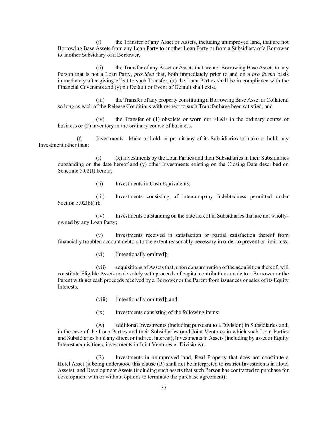 77 (i) the Transfer of any Asset or Assets, including unimproved land, that are not Borrowing Base Assets from any Loan Party to another Loan Party or from a Subsidiary of a Borrower to another Subsidiary of a Borrower, (ii) the Transfer of any Asset or Assets that are not Borrowing Base Assets to any Person that is not a Loan Party, provided that, both immediately prior to and on a pro forma basis immediately after giving effect to such Transfer, (x) the Loan Parties shall be in compliance with the Financial Covenants and (y) no Default or Event of Default shall exist, (iii) the Transfer of any property constituting a Borrowing Base Asset or Collateral so long as each of the Release Conditions with respect to such Transfer have been satisfied, and (iv) the Transfer of (1) obsolete or worn out FF&E in the ordinary course of business or (2) inventory in the ordinary course of business. (f) Investments. Make or hold, or permit any of its Subsidiaries to make or hold, any Investment other than: (i) (x) Investments by the Loan Parties and their Subsidiaries in their Subsidiaries outstanding on the date hereof and (y) other Investments existing on the Closing Date described on Schedule 5.02(f) hereto; (ii) Investments in Cash Equivalents; (iii) Investments consisting of intercompany Indebtedness permitted under Section 5.02(b)(ii); (iv) Investments outstanding on the date hereof in Subsidiaries that are not wholly- owned by any Loan Party; (v) Investments received in satisfaction or partial satisfaction thereof from financially troubled account debtors to the extent reasonably necessary in order to prevent or limit loss; (vi) [intentionally omitted]; (vii) acquisitions of Assets that, upon consummation of the acquisition thereof, will constitute Eligible Assets made solely with proceeds of capital contributions made to a Borrower or the Parent with net cash proceeds received by a Borrower or the Parent from issuances or sales of its Equity Interests; (viii) [intentionally omitted]; and (ix) Investments consisting of the following items: (A) additional Investments (including pursuant to a Division) in Subsidiaries and, in the case of the Loan Parties and their Subsidiaries (and Joint Ventures in which such Loan Parties and Subsidiaries hold any direct or indirect interest), Investments in Assets (including by asset or Equity Interest acquisitions, investments in Joint Ventures or Divisions); (B) Investments in unimproved land, Real Property that does not constitute a Hotel Asset (it being understood this clause (B) shall not be interpreted to restrict Investments in Hotel Assets), and Development Assets (including such assets that such Person has contracted to purchase for development with or without options to terminate the purchase agreement);