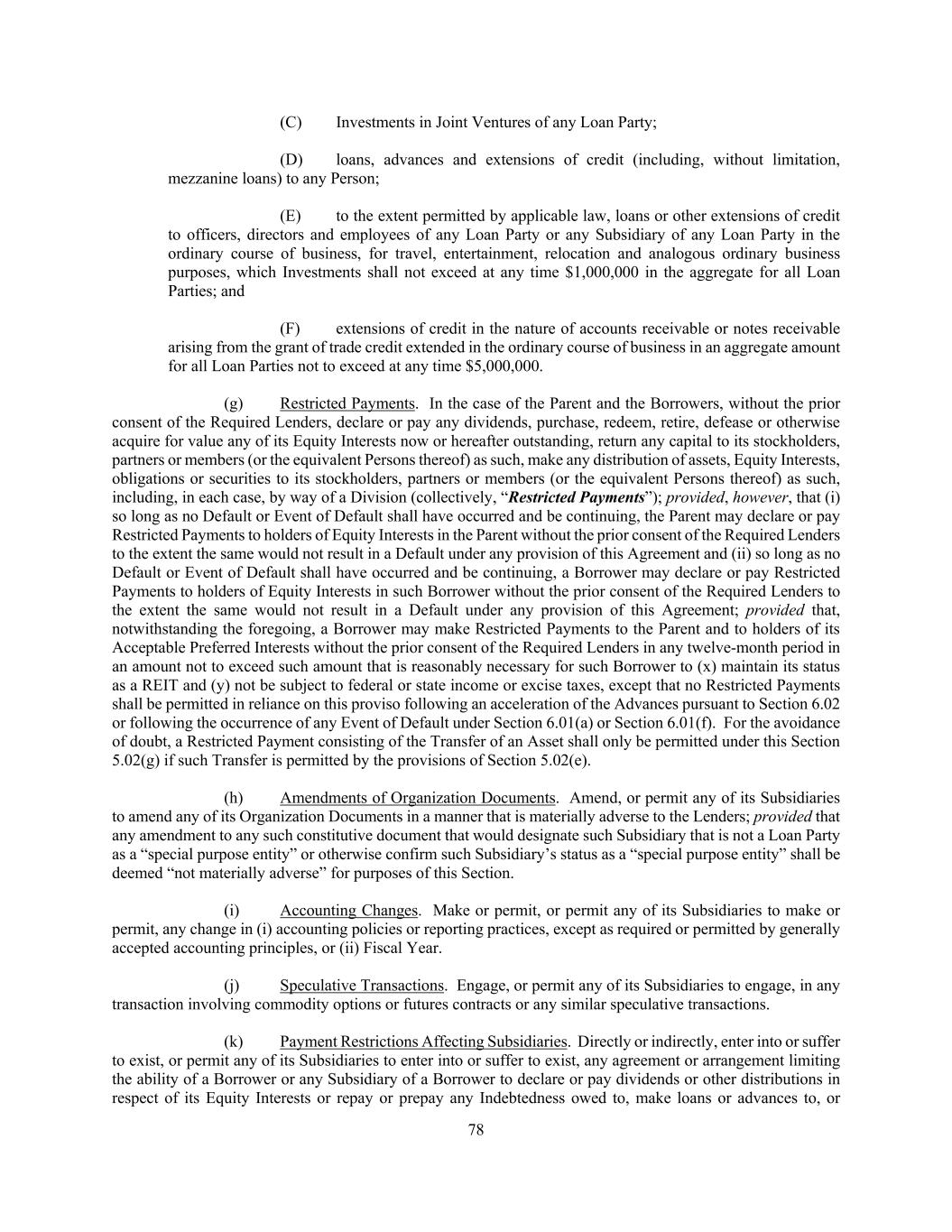 78 (C) Investments in Joint Ventures of any Loan Party; (D) loans, advances and extensions of credit (including, without limitation, mezzanine loans) to any Person; (E) to the extent permitted by applicable law, loans or other extensions of credit to officers, directors and employees of any Loan Party or any Subsidiary of any Loan Party in the ordinary course of business, for travel, entertainment, relocation and analogous ordinary business purposes, which Investments shall not exceed at any time $1,000,000 in the aggregate for all Loan Parties; and (F) extensions of credit in the nature of accounts receivable or notes receivable arising from the grant of trade credit extended in the ordinary course of business in an aggregate amount for all Loan Parties not to exceed at any time $5,000,000. (g) Restricted Payments. In the case of the Parent and the Borrowers, without the prior consent of the Required Lenders, declare or pay any dividends, purchase, redeem, retire, defease or otherwise acquire for value any of its Equity Interests now or hereafter outstanding, return any capital to its stockholders, partners or members (or the equivalent Persons thereof) as such, make any distribution of assets, Equity Interests, obligations or securities to its stockholders, partners or members (or the equivalent Persons thereof) as such, including, in each case, by way of a Division (collectively, “Restricted Payments”); provided, however, that (i) so long as no Default or Event of Default shall have occurred and be continuing, the Parent may declare or pay Restricted Payments to holders of Equity Interests in the Parent without the prior consent of the Required Lenders to the extent the same would not result in a Default under any provision of this Agreement and (ii) so long as no Default or Event of Default shall have occurred and be continuing, a Borrower may declare or pay Restricted Payments to holders of Equity Interests in such Borrower without the prior consent of the Required Lenders to the extent the same would not result in a Default under any provision of this Agreement; provided that, notwithstanding the foregoing, a Borrower may make Restricted Payments to the Parent and to holders of its Acceptable Preferred Interests without the prior consent of the Required Lenders in any twelve-month period in an amount not to exceed such amount that is reasonably necessary for such Borrower to (x) maintain its status as a REIT and (y) not be subject to federal or state income or excise taxes, except that no Restricted Payments shall be permitted in reliance on this proviso following an acceleration of the Advances pursuant to Section 6.02 or following the occurrence of any Event of Default under Section 6.01(a) or Section 6.01(f). For the avoidance of doubt, a Restricted Payment consisting of the Transfer of an Asset shall only be permitted under this Section 5.02(g) if such Transfer is permitted by the provisions of Section 5.02(e). (h) Amendments of Organization Documents. Amend, or permit any of its Subsidiaries to amend any of its Organization Documents in a manner that is materially adverse to the Lenders; provided that any amendment to any such constitutive document that would designate such Subsidiary that is not a Loan Party as a “special purpose entity” or otherwise confirm such Subsidiary’s status as a “special purpose entity” shall be deemed “not materially adverse” for purposes of this Section. (i) Accounting Changes. Make or permit, or permit any of its Subsidiaries to make or permit, any change in (i) accounting policies or reporting practices, except as required or permitted by generally accepted accounting principles, or (ii) Fiscal Year. (j) Speculative Transactions. Engage, or permit any of its Subsidiaries to engage, in any transaction involving commodity options or futures contracts or any similar speculative transactions. (k) Payment Restrictions Affecting Subsidiaries. Directly or indirectly, enter into or suffer to exist, or permit any of its Subsidiaries to enter into or suffer to exist, any agreement or arrangement limiting the ability of a Borrower or any Subsidiary of a Borrower to declare or pay dividends or other distributions in respect of its Equity Interests or repay or prepay any Indebtedness owed to, make loans or advances to, or