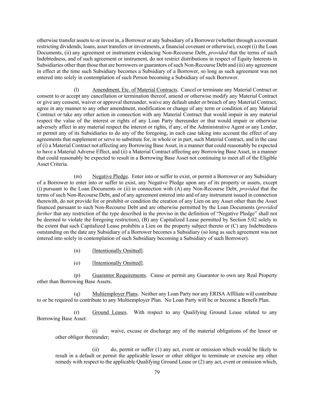 79 otherwise transfer assets to or invest in, a Borrower or any Subsidiary of a Borrower (whether through a covenant restricting dividends, loans, asset transfers or investments, a financial covenant or otherwise), except (i) the Loan Documents, (ii) any agreement or instrument evidencing Non-Recourse Debt, provided that the terms of such Indebtedness, and of such agreement or instrument, do not restrict distributions in respect of Equity Interests in Subsidiaries other than those that are borrowers or guarantors of such Non-Recourse Debt and (iii) any agreement in effect at the time such Subsidiary becomes a Subsidiary of a Borrower, so long as such agreement was not entered into solely in contemplation of such Person becoming a Subsidiary of such Borrower. (l) Amendment, Etc. of Material Contracts. Cancel or terminate any Material Contract or consent to or accept any cancellation or termination thereof, amend or otherwise modify any Material Contract or give any consent, waiver or approval thereunder, waive any default under or breach of any Material Contract, agree in any manner to any other amendment, modification or change of any term or condition of any Material Contract or take any other action in connection with any Material Contract that would impair in any material respect the value of the interest or rights of any Loan Party thereunder or that would impair or otherwise adversely affect in any material respect the interest or rights, if any, of the Administrative Agent or any Lender, or permit any of its Subsidiaries to do any of the foregoing, in each case taking into account the effect of any agreements that supplement or serve to substitute for, in whole or in part, such Material Contract, and in the case of (i) a Material Contract not affecting any Borrowing Base Asset, in a manner that could reasonably be expected to have a Material Adverse Effect, and (ii) a Material Contract affecting any Borrowing Base Asset, in a manner that could reasonably be expected to result in a Borrowing Base Asset not continuing to meet all of the Eligible Asset Criteria. (m) Negative Pledge. Enter into or suffer to exist, or permit a Borrower or any Subsidiary of a Borrower to enter into or suffer to exist, any Negative Pledge upon any of its property or assets, except (i) pursuant to the Loan Documents or (ii) in connection with (A) any Non-Recourse Debt, provided that the terms of such Non-Recourse Debt, and of any agreement entered into and of any instrument issued in connection therewith, do not provide for or prohibit or condition the creation of any Lien on any Asset other than the Asset financed pursuant to such Non-Recourse Debt and are otherwise permitted by the Loan Documents (provided further that any restriction of the type described in the proviso in the definition of “Negative Pledge” shall not be deemed to violate the foregoing restriction), (B) any Capitalized Lease permitted by Section 5.02 solely to the extent that such Capitalized Lease prohibits a Lien on the property subject thereto or (C) any Indebtedness outstanding on the date any Subsidiary of a Borrower becomes a Subsidiary (so long as such agreement was not entered into solely in contemplation of such Subsidiary becoming a Subsidiary of such Borrower). (n) [Intentionally Omitted]. (o) [Intentionally Omitted]. (p) Guarantor Requirements. Cause or permit any Guarantor to own any Real Property other than Borrowing Base Assets. (q) Multiemployer Plans. Neither any Loan Party nor any ERISA Affiliate will contribute to or be required to contribute to any Multiemployer Plan. No Loan Party will be or become a Benefit Plan. (r) Ground Leases. With respect to any Qualifying Ground Lease related to any Borrowing Base Asset: (i) waive, excuse or discharge any of the material obligations of the lessor or other obligor thereunder; (ii) do, permit or suffer (1) any act, event or omission which would be likely to result in a default or permit the applicable lessor or other obligor to terminate or exercise any other remedy with respect to the applicable Qualifying Ground Lease or (2) any act, event or omission which,