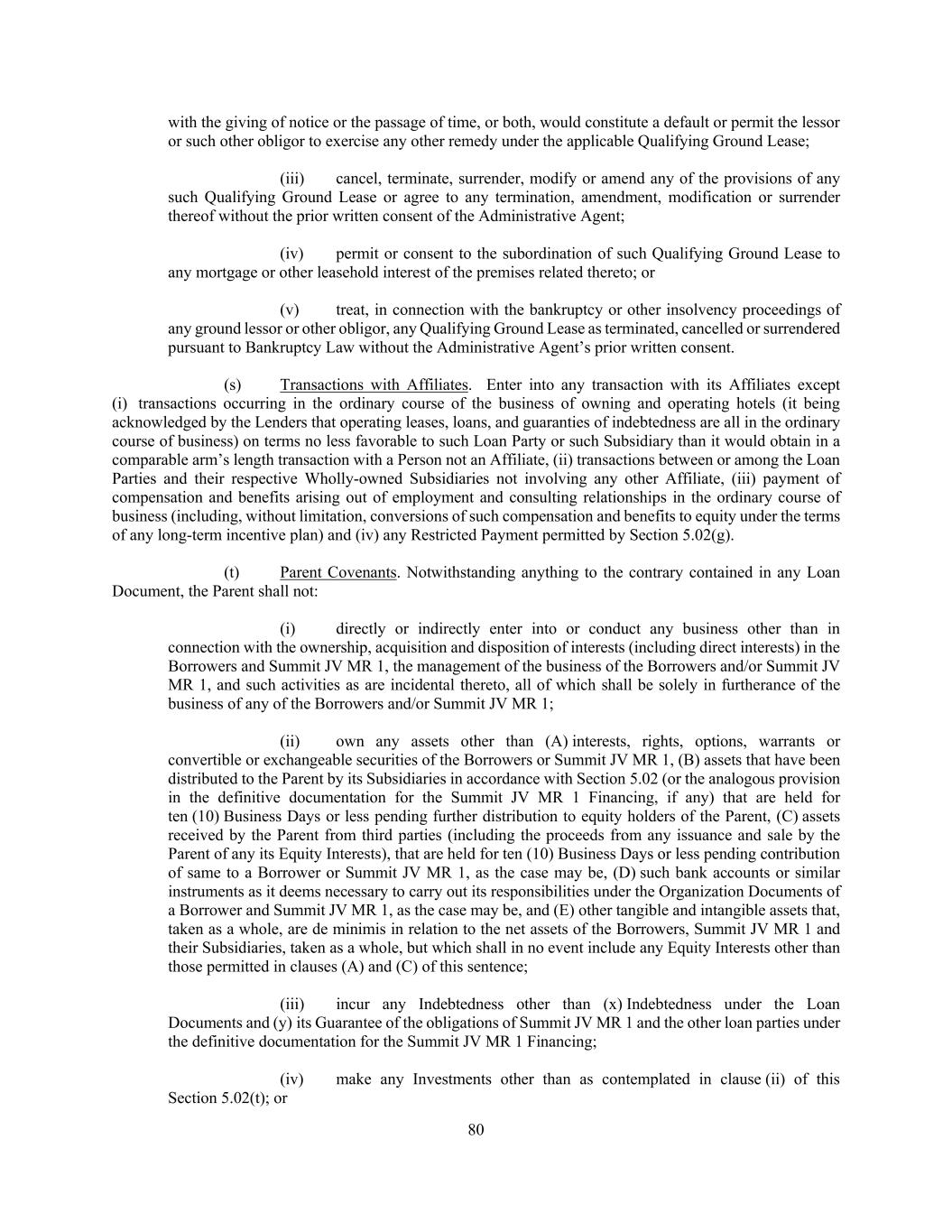 80 with the giving of notice or the passage of time, or both, would constitute a default or permit the lessor or such other obligor to exercise any other remedy under the applicable Qualifying Ground Lease; (iii) cancel, terminate, surrender, modify or amend any of the provisions of any such Qualifying Ground Lease or agree to any termination, amendment, modification or surrender thereof without the prior written consent of the Administrative Agent; (iv) permit or consent to the subordination of such Qualifying Ground Lease to any mortgage or other leasehold interest of the premises related thereto; or (v) treat, in connection with the bankruptcy or other insolvency proceedings of any ground lessor or other obligor, any Qualifying Ground Lease as terminated, cancelled or surrendered pursuant to Bankruptcy Law without the Administrative Agent’s prior written consent. (s) Transactions with Affiliates. Enter into any transaction with its Affiliates except (i) transactions occurring in the ordinary course of the business of owning and operating hotels (it being acknowledged by the Lenders that operating leases, loans, and guaranties of indebtedness are all in the ordinary course of business) on terms no less favorable to such Loan Party or such Subsidiary than it would obtain in a comparable arm’s length transaction with a Person not an Affiliate, (ii) transactions between or among the Loan Parties and their respective Wholly-owned Subsidiaries not involving any other Affiliate, (iii) payment of compensation and benefits arising out of employment and consulting relationships in the ordinary course of business (including, without limitation, conversions of such compensation and benefits to equity under the terms of any long-term incentive plan) and (iv) any Restricted Payment permitted by Section 5.02(g). (t) Parent Covenants. Notwithstanding anything to the contrary contained in any Loan Document, the Parent shall not: (i) directly or indirectly enter into or conduct any business other than in connection with the ownership, acquisition and disposition of interests (including direct interests) in the Borrowers and Summit JV MR 1, the management of the business of the Borrowers and/or Summit JV MR 1, and such activities as are incidental thereto, all of which shall be solely in furtherance of the business of any of the Borrowers and/or Summit JV MR 1; (ii) own any assets other than (A) interests, rights, options, warrants or convertible or exchangeable securities of the Borrowers or Summit JV MR 1, (B) assets that have been distributed to the Parent by its Subsidiaries in accordance with Section 5.02 (or the analogous provision in the definitive documentation for the Summit JV MR 1 Financing, if any) that are held for ten (10) Business Days or less pending further distribution to equity holders of the Parent, (C) assets received by the Parent from third parties (including the proceeds from any issuance and sale by the Parent of any its Equity Interests), that are held for ten (10) Business Days or less pending contribution of same to a Borrower or Summit JV MR 1, as the case may be, (D) such bank accounts or similar instruments as it deems necessary to carry out its responsibilities under the Organization Documents of a Borrower and Summit JV MR 1, as the case may be, and (E) other tangible and intangible assets that, taken as a whole, are de minimis in relation to the net assets of the Borrowers, Summit JV MR 1 and their Subsidiaries, taken as a whole, but which shall in no event include any Equity Interests other than those permitted in clauses (A) and (C) of this sentence; (iii) incur any Indebtedness other than (x) Indebtedness under the Loan Documents and (y) its Guarantee of the obligations of Summit JV MR 1 and the other loan parties under the definitive documentation for the Summit JV MR 1 Financing; (iv) make any Investments other than as contemplated in clause (ii) of this Section 5.02(t); or