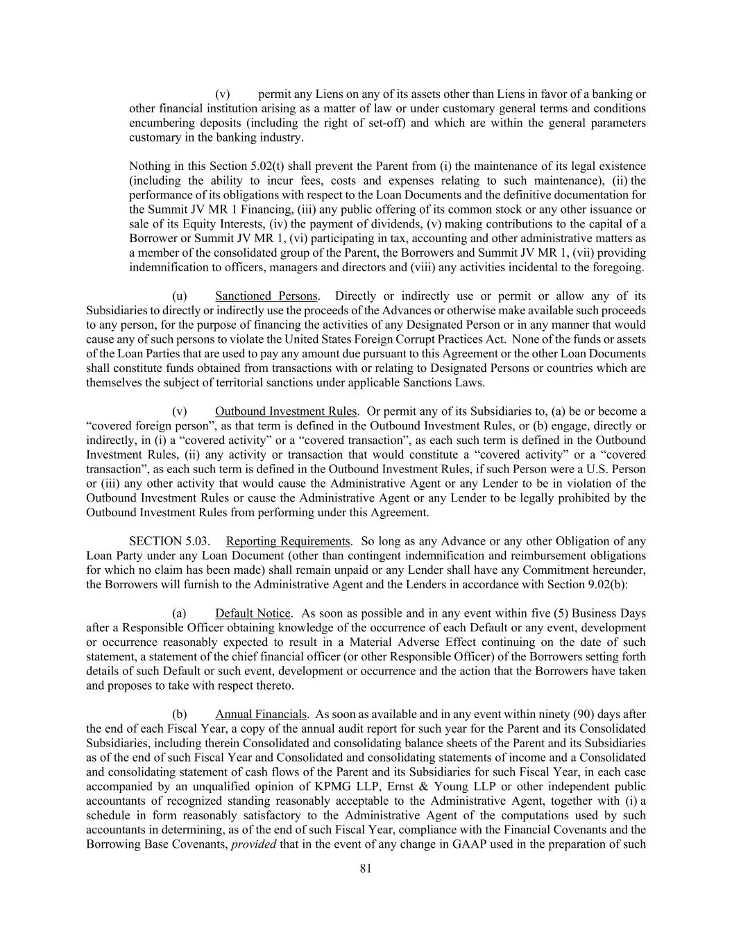 81 (v) permit any Liens on any of its assets other than Liens in favor of a banking or other financial institution arising as a matter of law or under customary general terms and conditions encumbering deposits (including the right of set-off) and which are within the general parameters customary in the banking industry. Nothing in this Section 5.02(t) shall prevent the Parent from (i) the maintenance of its legal existence (including the ability to incur fees, costs and expenses relating to such maintenance), (ii) the performance of its obligations with respect to the Loan Documents and the definitive documentation for the Summit JV MR 1 Financing, (iii) any public offering of its common stock or any other issuance or sale of its Equity Interests, (iv) the payment of dividends, (v) making contributions to the capital of a Borrower or Summit JV MR 1, (vi) participating in tax, accounting and other administrative matters as a member of the consolidated group of the Parent, the Borrowers and Summit JV MR 1, (vii) providing indemnification to officers, managers and directors and (viii) any activities incidental to the foregoing. (u) Sanctioned Persons. Directly or indirectly use or permit or allow any of its Subsidiaries to directly or indirectly use the proceeds of the Advances or otherwise make available such proceeds to any person, for the purpose of financing the activities of any Designated Person or in any manner that would cause any of such persons to violate the United States Foreign Corrupt Practices Act. None of the funds or assets of the Loan Parties that are used to pay any amount due pursuant to this Agreement or the other Loan Documents shall constitute funds obtained from transactions with or relating to Designated Persons or countries which are themselves the subject of territorial sanctions under applicable Sanctions Laws. (v) Outbound Investment Rules. Or permit any of its Subsidiaries to, (a) be or become a “covered foreign person”, as that term is defined in the Outbound Investment Rules, or (b) engage, directly or indirectly, in (i) a “covered activity” or a “covered transaction”, as each such term is defined in the Outbound Investment Rules, (ii) any activity or transaction that would constitute a “covered activity” or a “covered transaction”, as each such term is defined in the Outbound Investment Rules, if such Person were a U.S. Person or (iii) any other activity that would cause the Administrative Agent or any Lender to be in violation of the Outbound Investment Rules or cause the Administrative Agent or any Lender to be legally prohibited by the Outbound Investment Rules from performing under this Agreement. SECTION 5.03. Reporting Requirements. So long as any Advance or any other Obligation of any Loan Party under any Loan Document (other than contingent indemnification and reimbursement obligations for which no claim has been made) shall remain unpaid or any Lender shall have any Commitment hereunder, the Borrowers will furnish to the Administrative Agent and the Lenders in accordance with Section 9.02(b): (a) Default Notice. As soon as possible and in any event within five (5) Business Days after a Responsible Officer obtaining knowledge of the occurrence of each Default or any event, development or occurrence reasonably expected to result in a Material Adverse Effect continuing on the date of such statement, a statement of the chief financial officer (or other Responsible Officer) of the Borrowers setting forth details of such Default or such event, development or occurrence and the action that the Borrowers have taken and proposes to take with respect thereto. (b) Annual Financials. As soon as available and in any event within ninety (90) days after the end of each Fiscal Year, a copy of the annual audit report for such year for the Parent and its Consolidated Subsidiaries, including therein Consolidated and consolidating balance sheets of the Parent and its Subsidiaries as of the end of such Fiscal Year and Consolidated and consolidating statements of income and a Consolidated and consolidating statement of cash flows of the Parent and its Subsidiaries for such Fiscal Year, in each case accompanied by an unqualified opinion of KPMG LLP, Ernst & Young LLP or other independent public accountants of recognized standing reasonably acceptable to the Administrative Agent, together with (i) a schedule in form reasonably satisfactory to the Administrative Agent of the computations used by such accountants in determining, as of the end of such Fiscal Year, compliance with the Financial Covenants and the Borrowing Base Covenants, provided that in the event of any change in GAAP used in the preparation of such